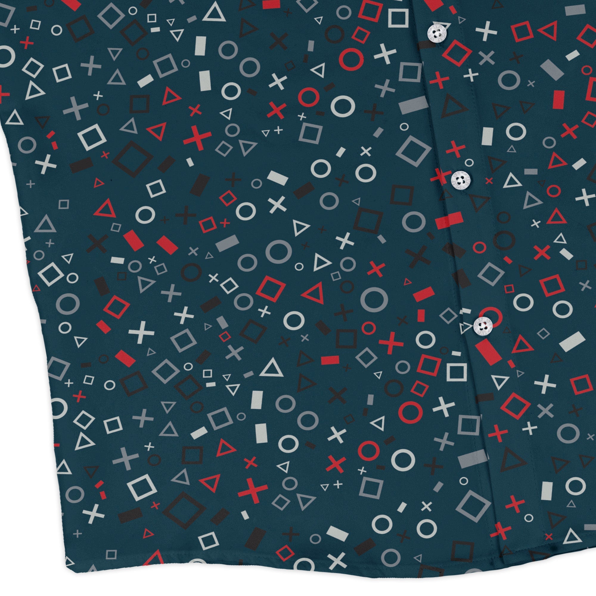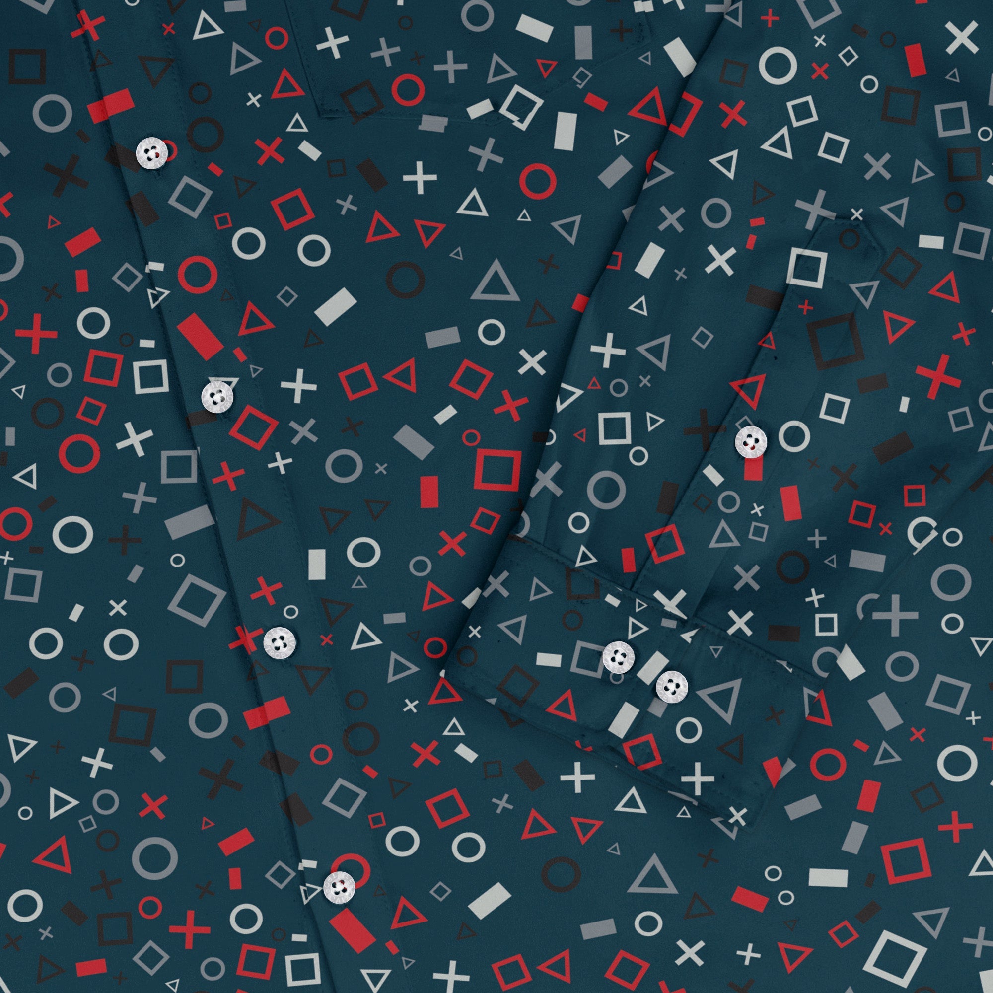 The Controller Gamepad Icons Teal Video Game Long Sleeve Button Up Shirt brings arcade energy to your everyday rotation. A vibrant teal base is covered in tidy controller silhouettes and classic button symbols, laid out in a clean, repeating grid that reads modern, not noisy. Long sleeves and a crisp button front keep it sharp; the playful print keeps it geeky. Artist-backed, eco-minded, and ready for co-op or coffee runs.