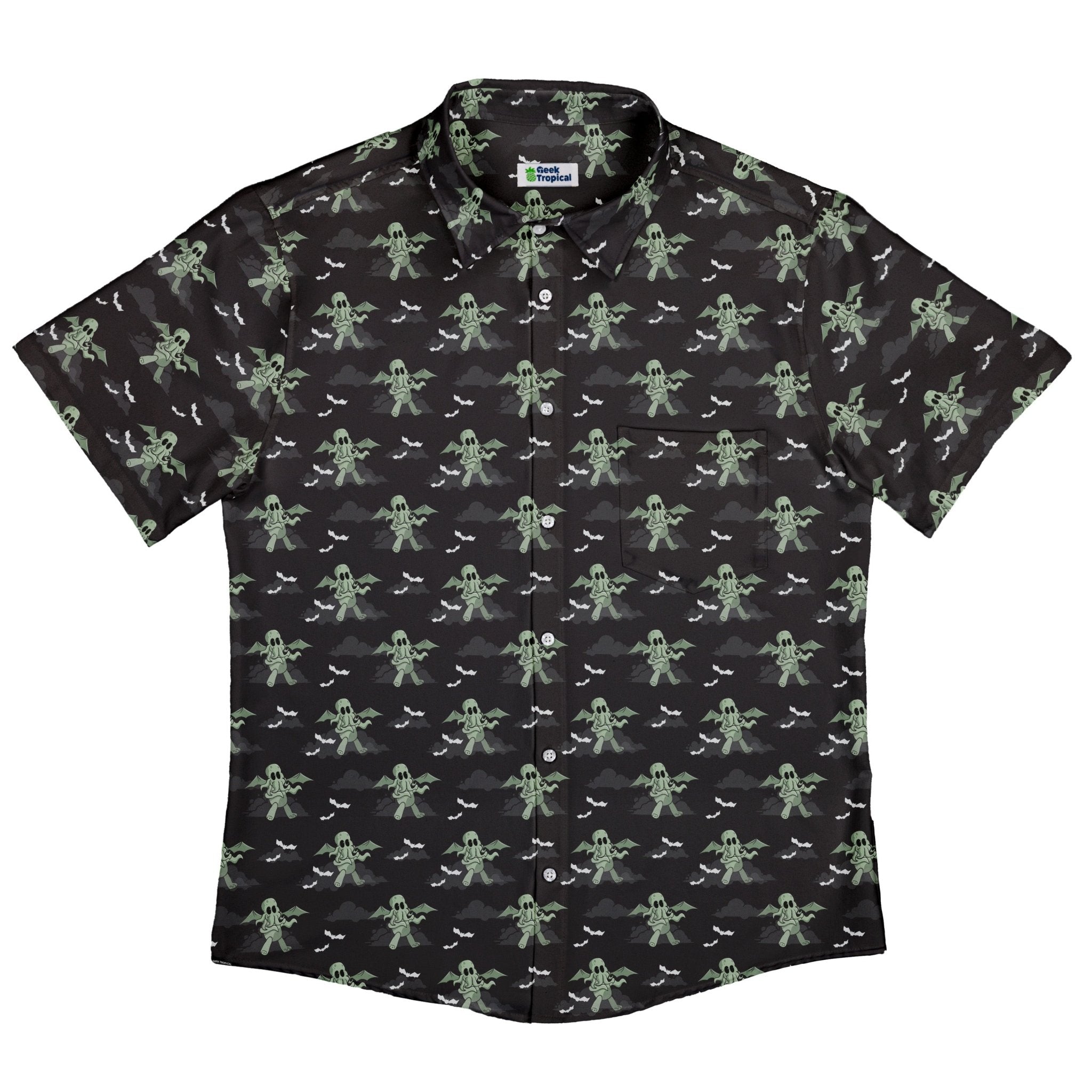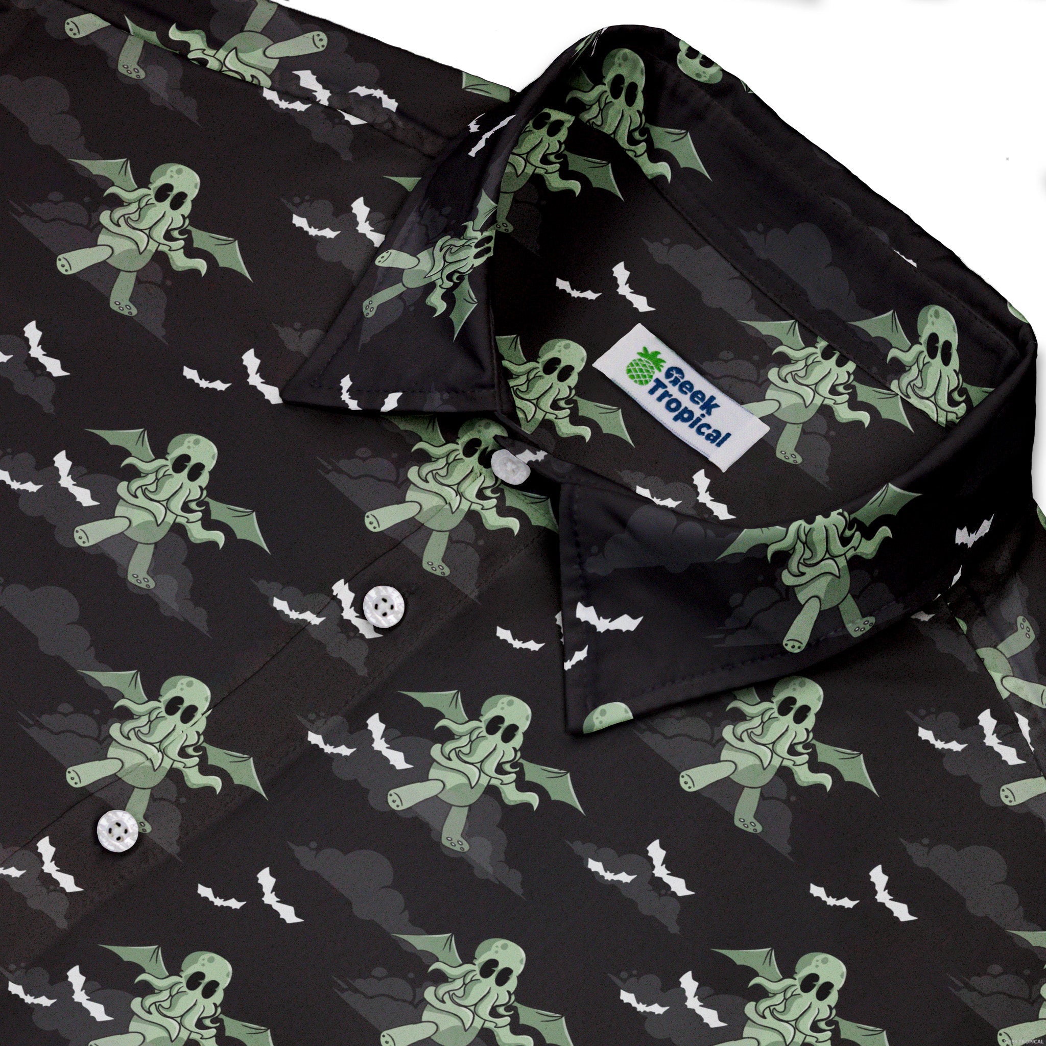 The Cthlhu fog Button Up Shirt conjures eldritch style: billowing mist and curling tentacles sweep across the fabric in an all-over scene that’s cinematic yet wearable. The artwork aligns across the placket and even the pocket for a continuous look. Designed by Heather Davenport with eco-conscious inks, it’s grown-up geek energy—perfect for subtle Halloween flexes and year-round mystery.