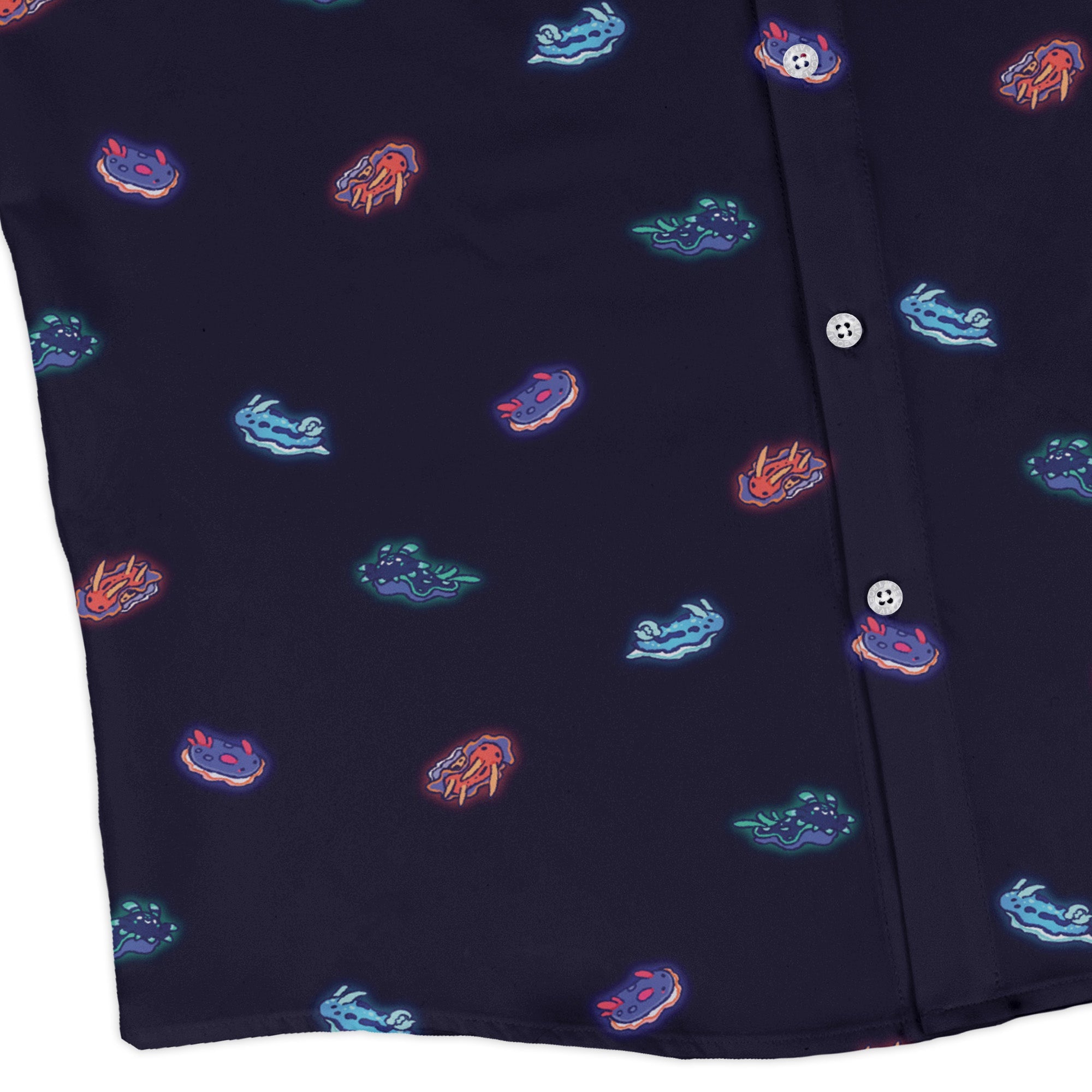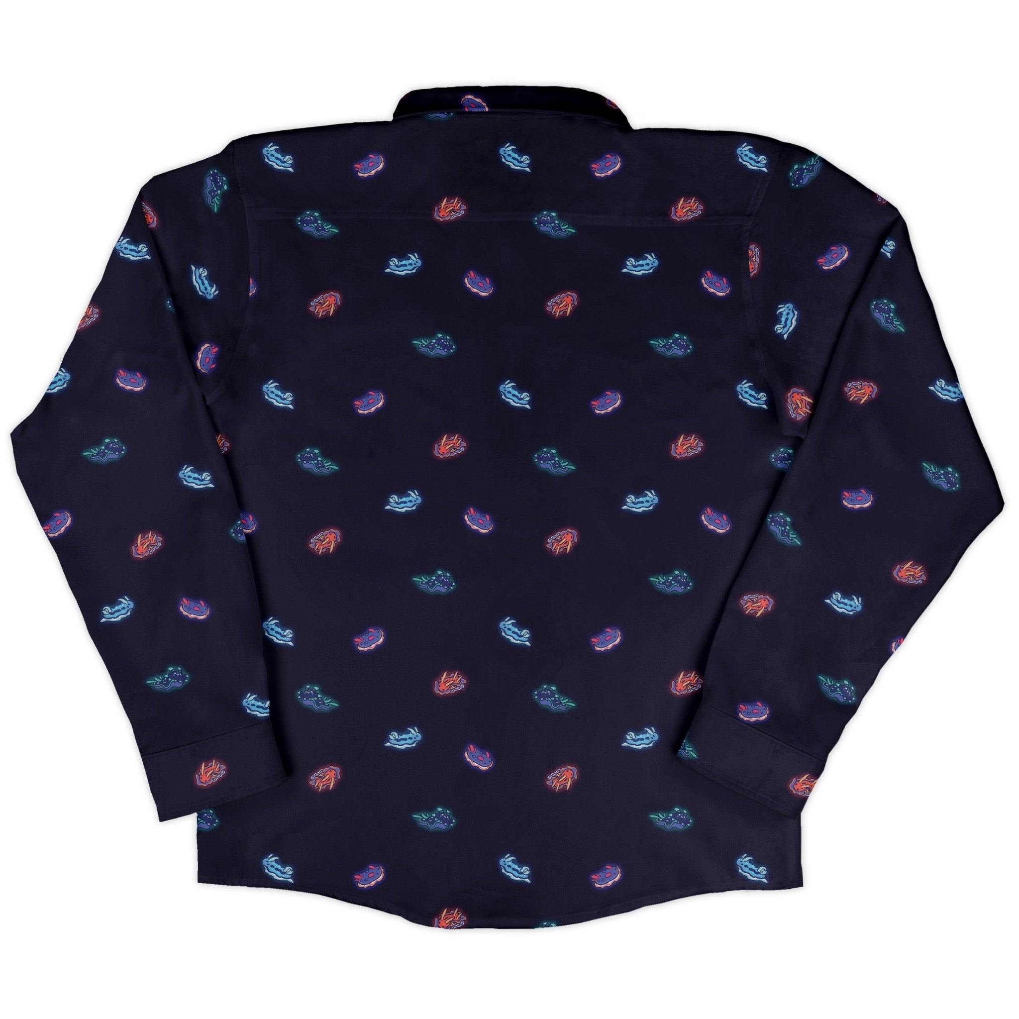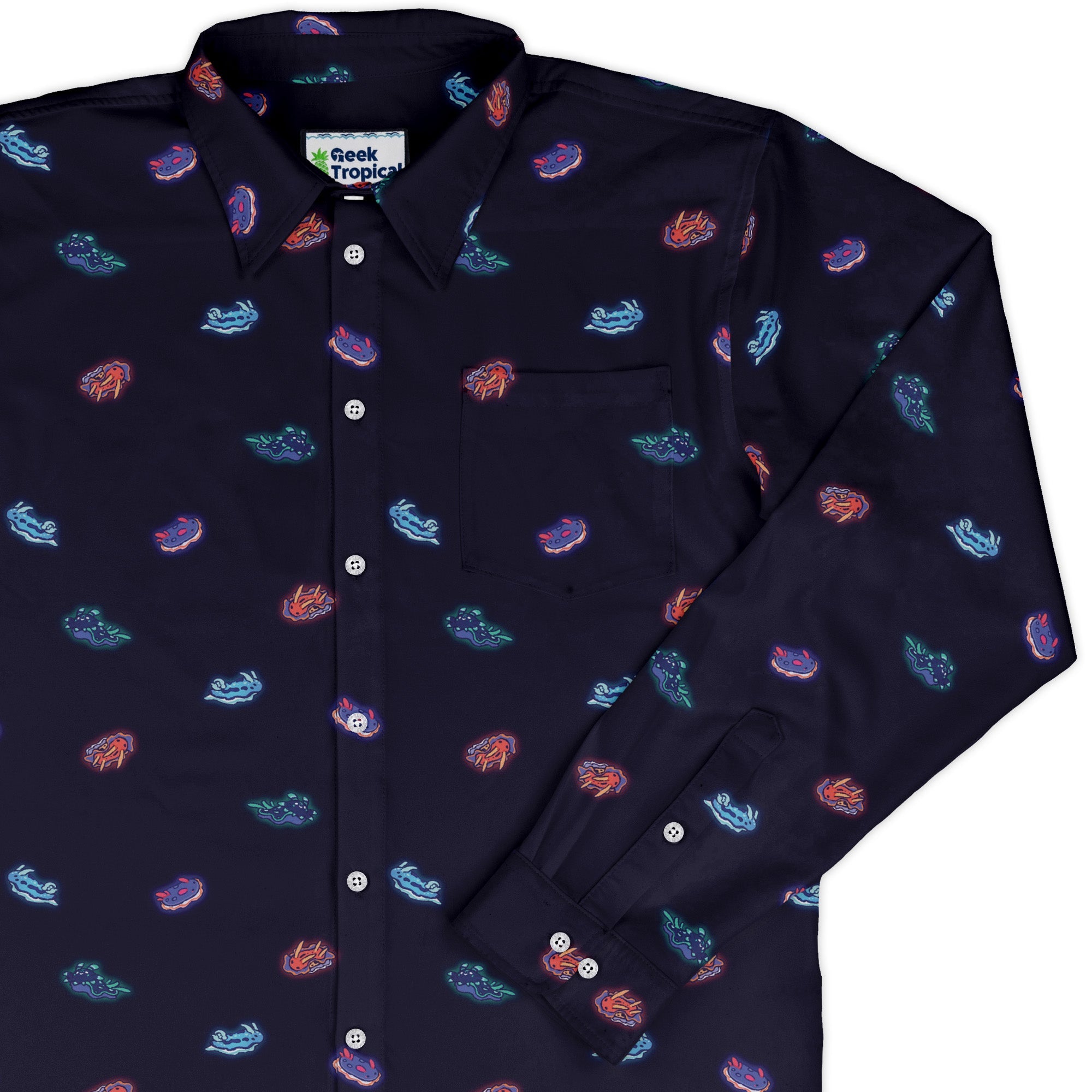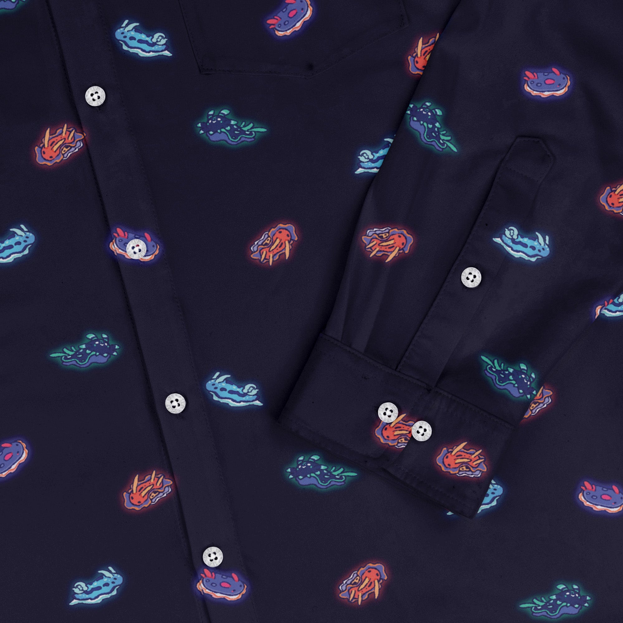 Dive into delight with the Cute Sea Slugs Long Sleeve Button Up Shirt, a reef-ready flex for marine nerds and style geeks alike. Designed by Ardi Tong, the print features a parade of anime-cute nudibranchs gliding over an oceanic backdrop, with the pattern flowing cleanly across the chest pocket for a seamless look. Soft, breathable, and easy to wear from campus to con, it’s printed with eco-conscious inks so the colors pop and your impact stays low.