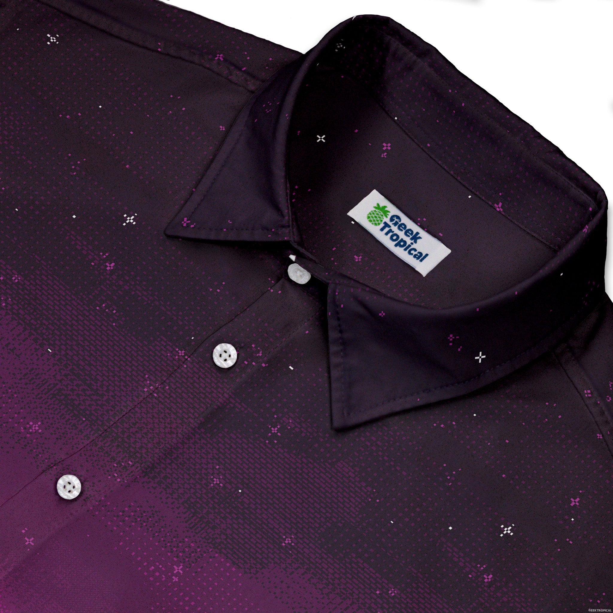 Turn night mode on with the Cyberpunk Tokyo Skyline Button Up Shirt, a neon-soaked panorama rendered in razor-sharp linework. Electric pinks and cool cyans light up stacked Tokyo high-rises, glowing windows, and a deep night gradient. The skyline flows cleanly across the front and pocket for a seamless look. Bold, geeky, and artist-backed—illustrated by Claire Murphy—this maximalist pattern brings city-core swagger.