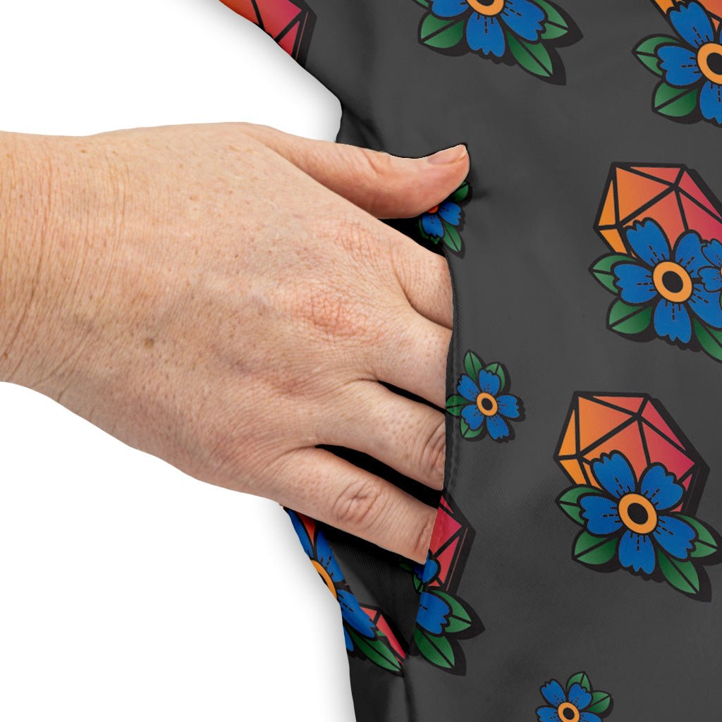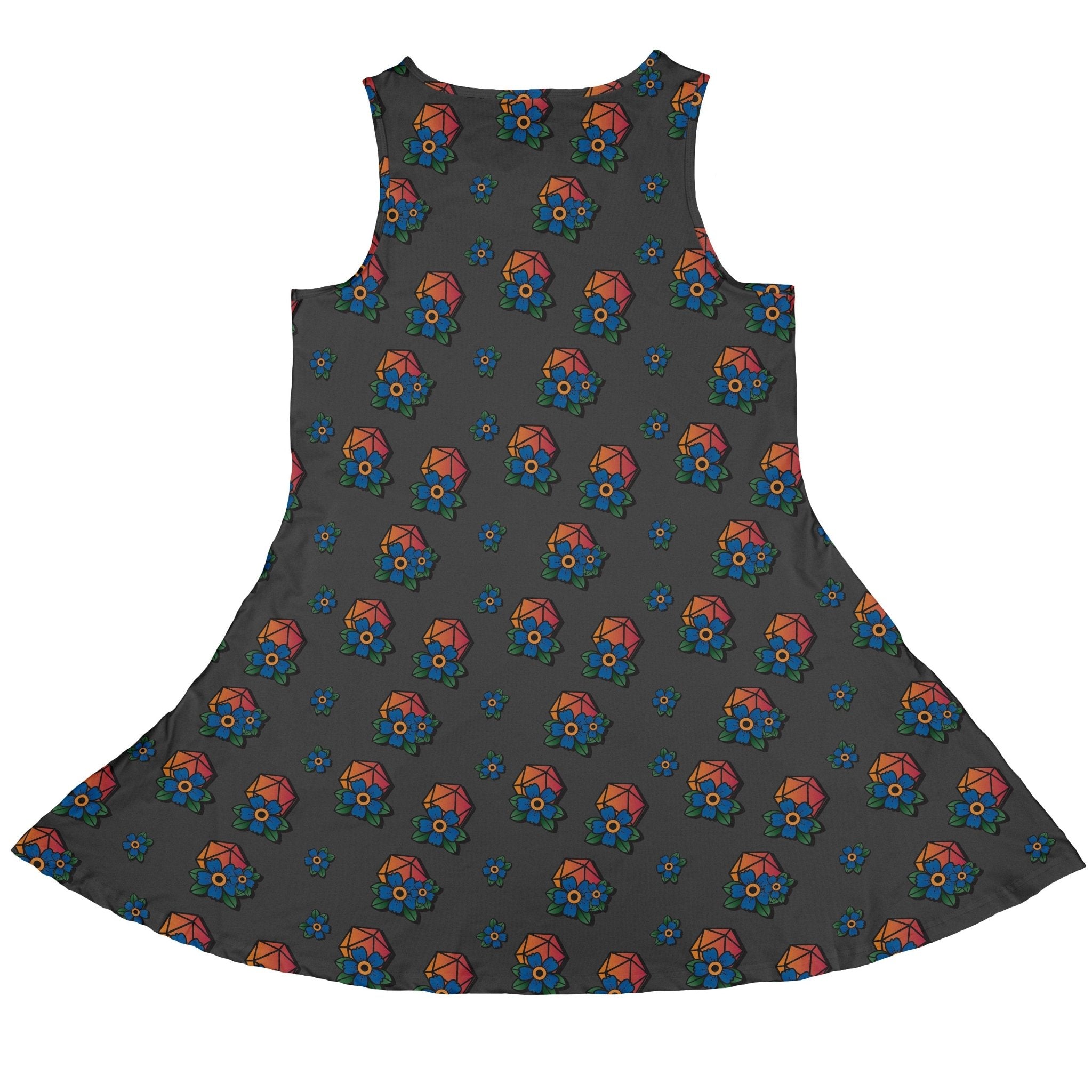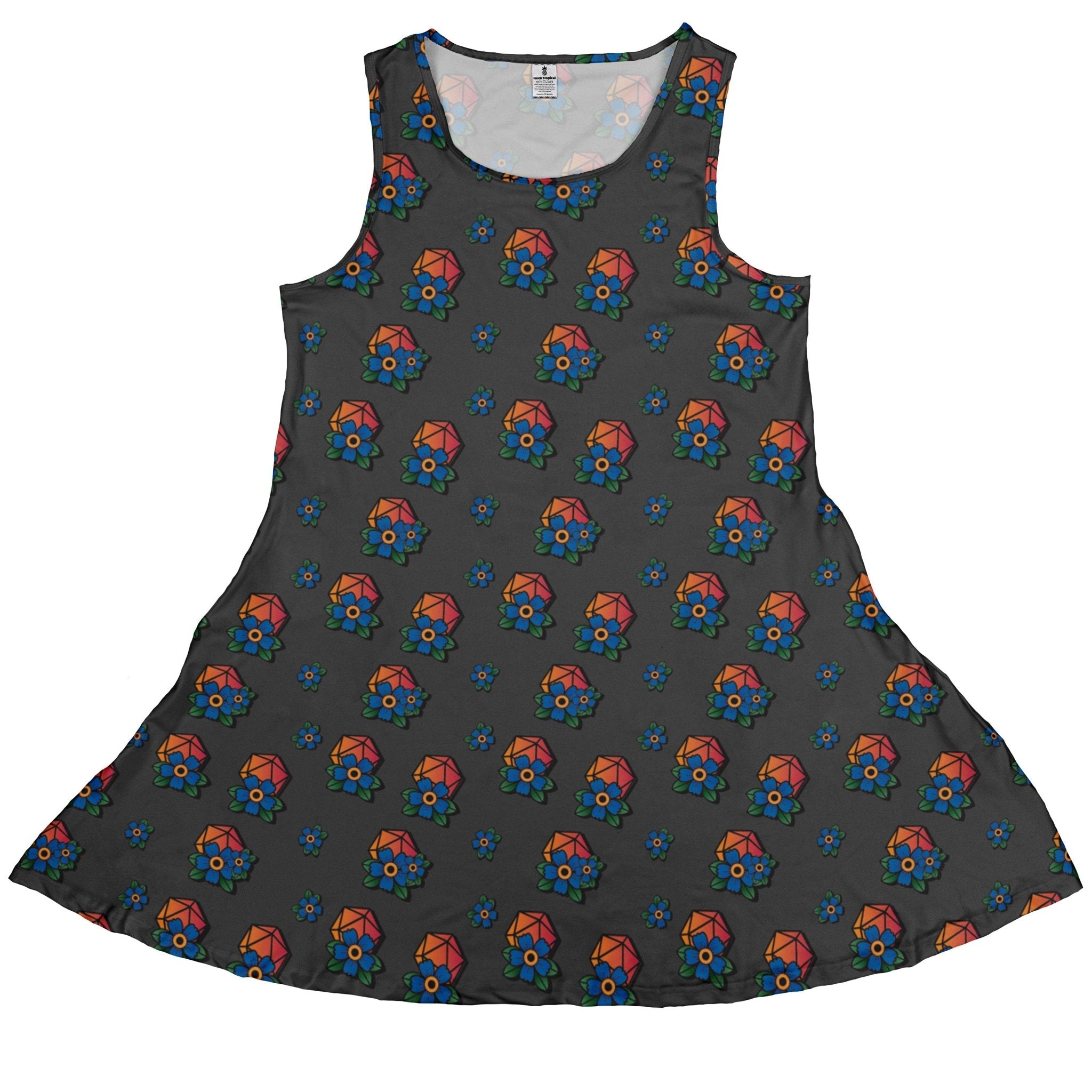 Meet the D20 Floral Hawaiian Gray Dress, where island vibes team up with tabletop flair. A cool gray ground hosts breezy tropical blooms with neatly tucked D20s—chic from afar, delightfully Dnd up close. Designed by Heather Davenport, it moves easily and looks polished from game night to brunch, all while backing licensed artists.