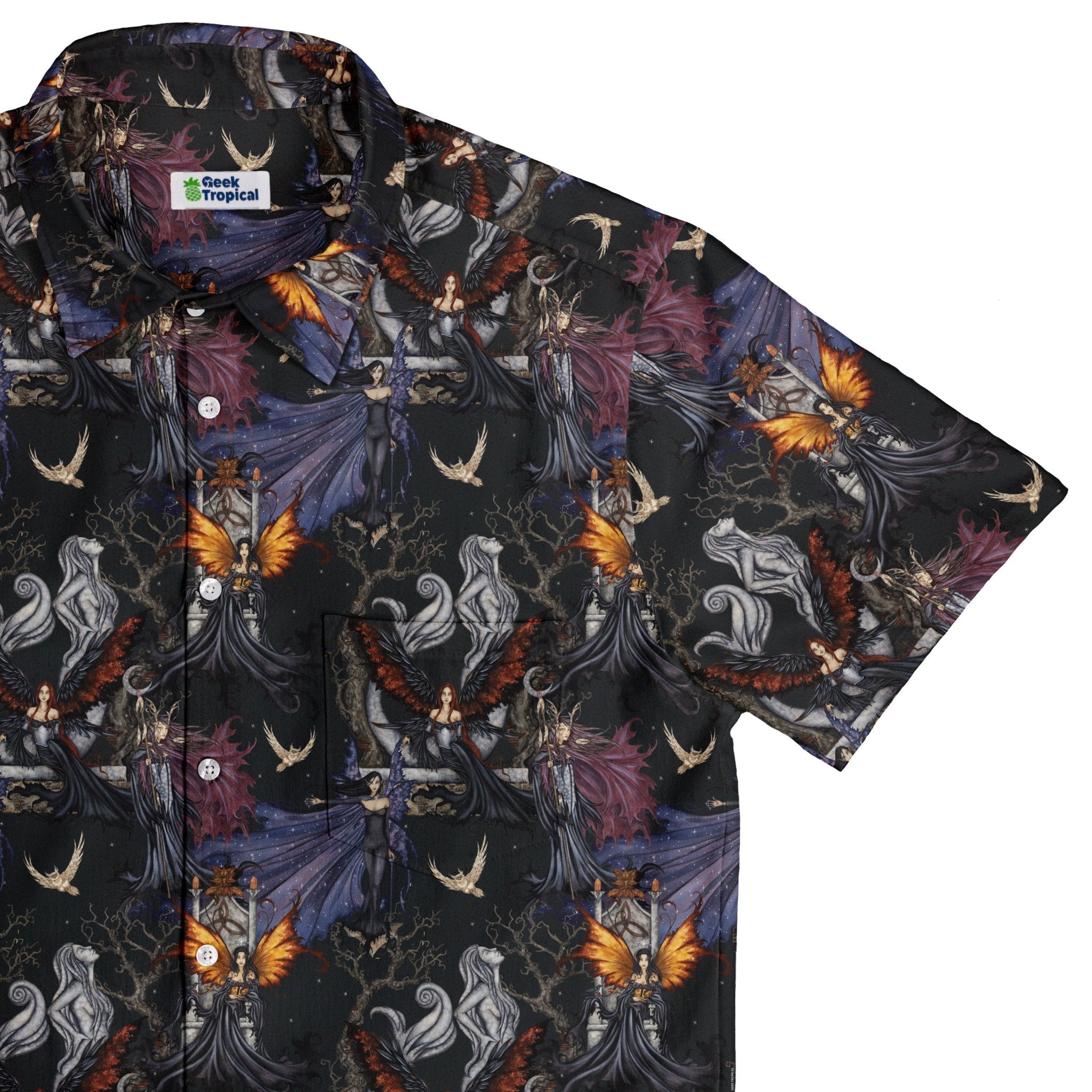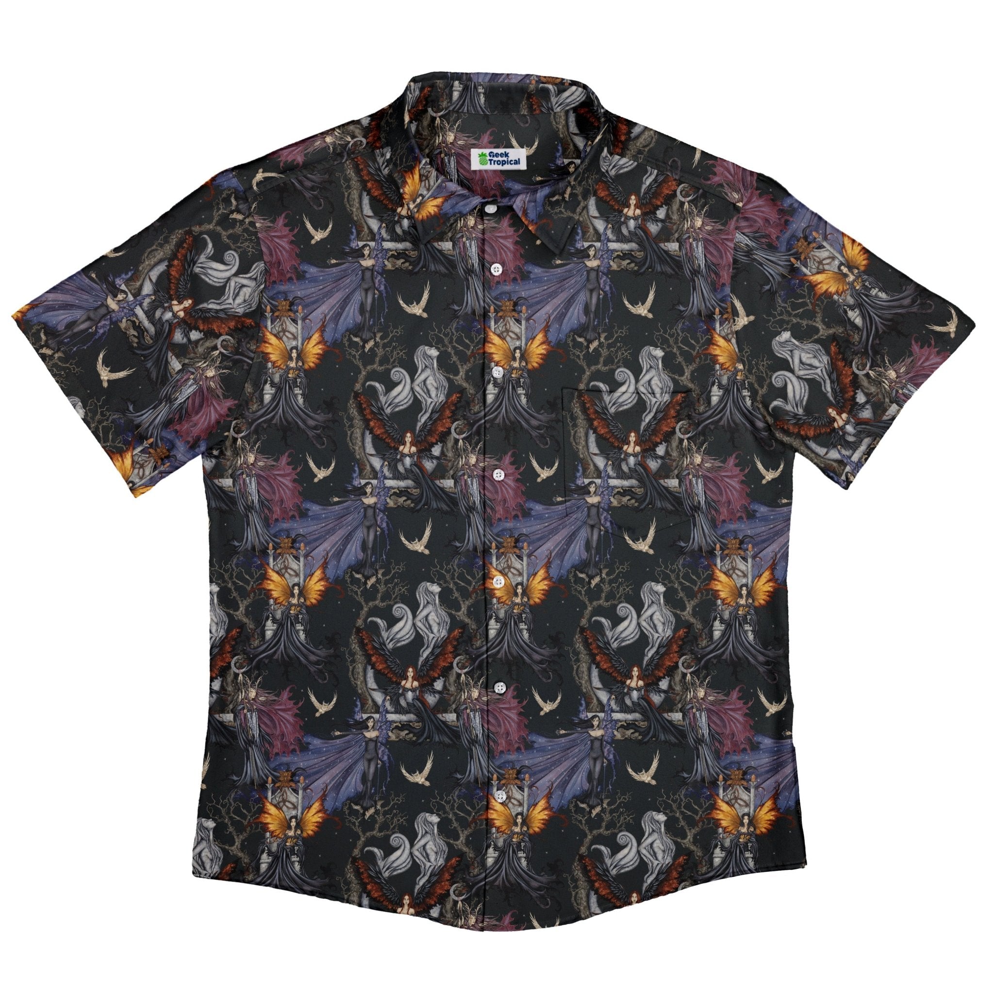 Summon sleek fantasy energy with the Dark Elves Gathering Button Up Shirt. Amy Brown’s licensed art sets a nocturnal scene of elegant elven figures convening in layered shadows, with luminous highlights adding depth across a seamless all-over print. Dark, moody tones keep it sharp for spooky season, con wanderings, or your next Dnd session—artist-backed, unapologetically geeky, and ready to level up your button-up rotation.