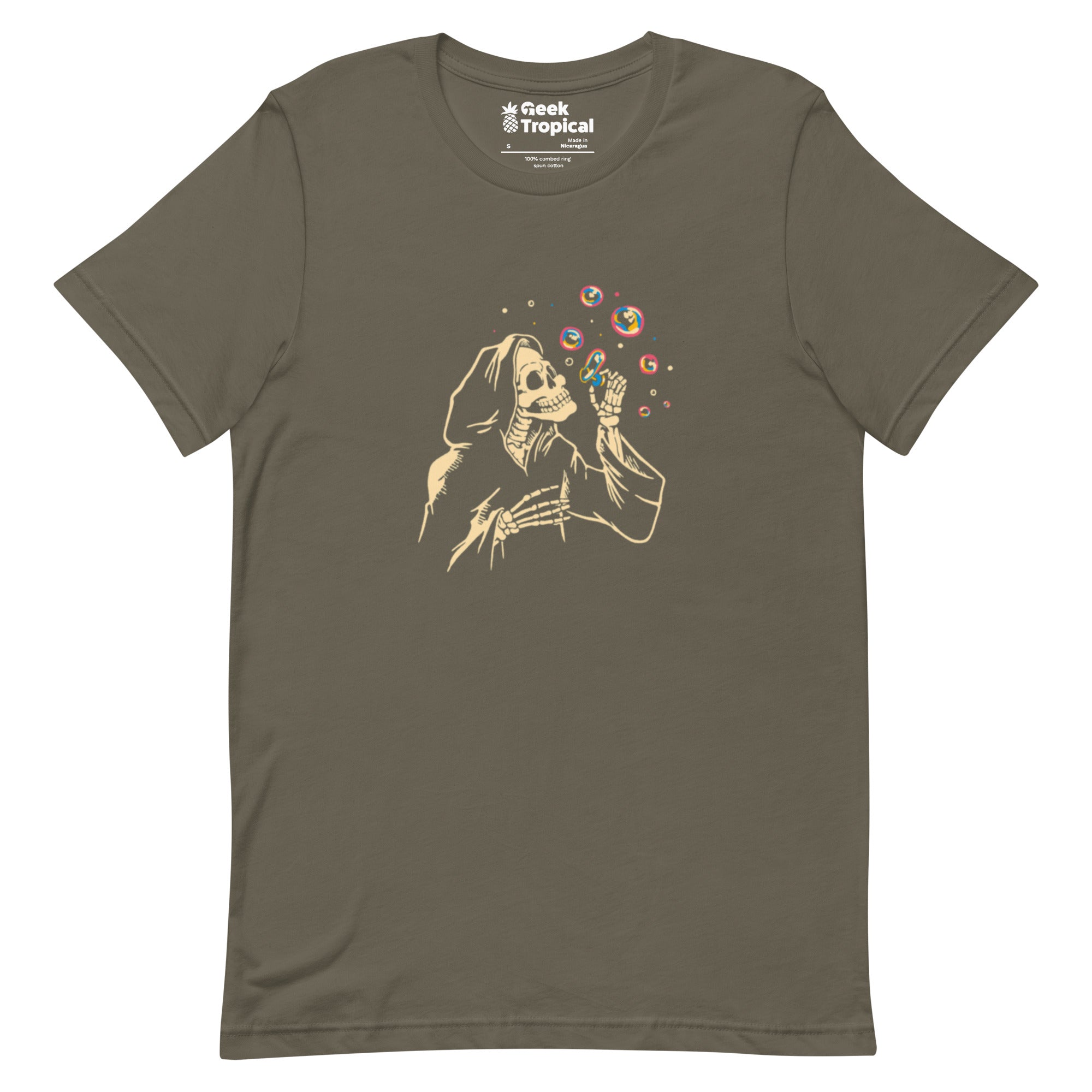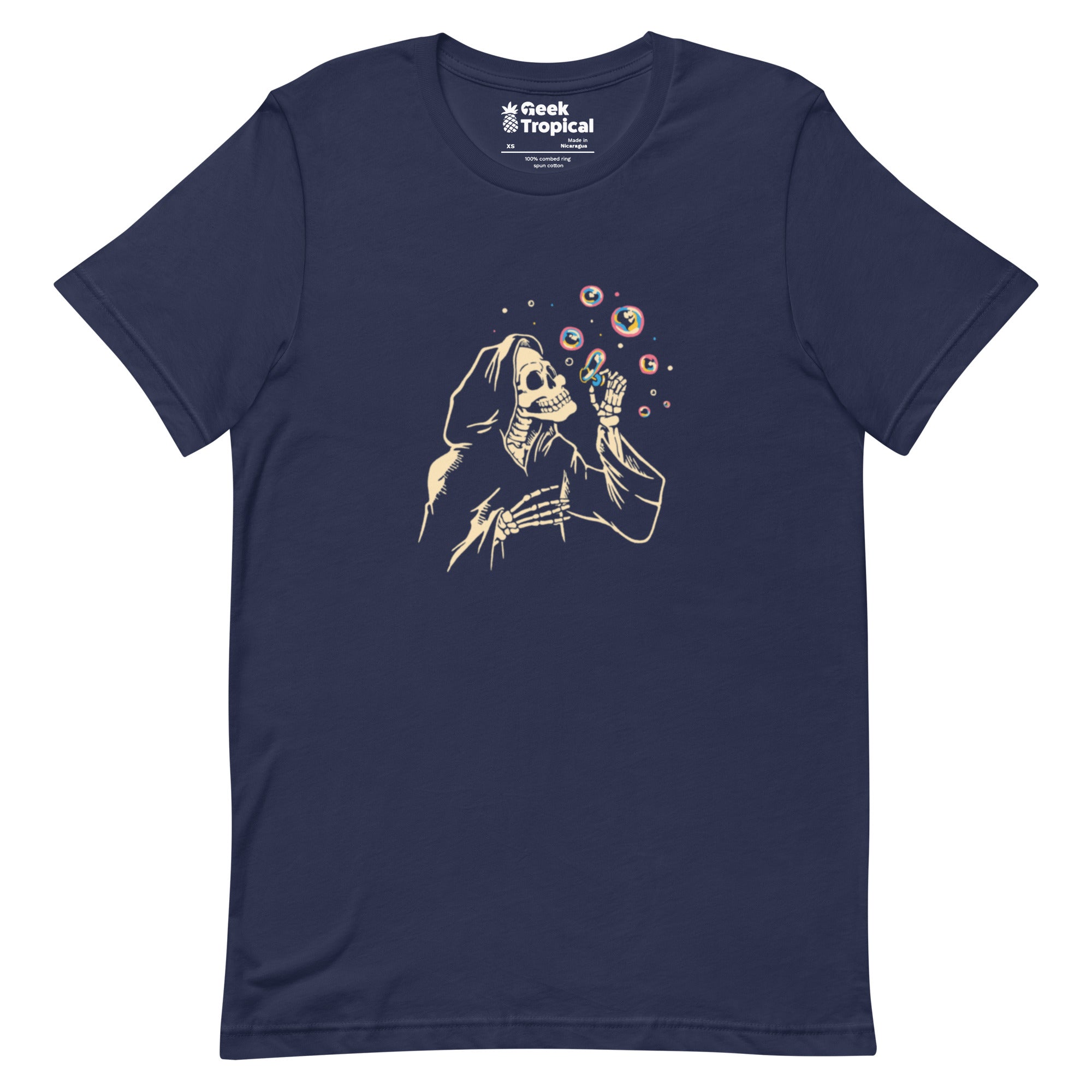 Death Blowing Bubbles T-Shirt brings dark humor to a soft whisper: a hooded skeleton pauses to gently blow a stream of floating bubbles, wand poised, skull grin serene. Designed by Tobe Fonseca, it’s equal parts spooky and sweet—ideal for Halloween or daily mischief. Artist-backed and eco‑conscious, this playful memento mori pairs perfectly with your geek cred and a sense of whimsy.