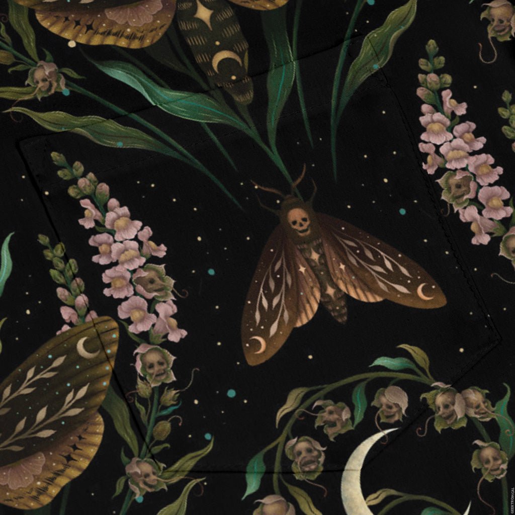 The Episodic Death Moth Flow Long Sleeve Button Up Shirt channels midnight garden energy with a seamless field of skull-marked moths and winding botanicals on a deep charcoal base. Designed by Episodic, the crisp linework flows cleanly across the placket and pocket for a satisfying, continuous look. A relaxed, easy drape with buttoned cuffs keeps it versatile, while eco-conscious inks and breathable comfort carry you from day to after-hours.