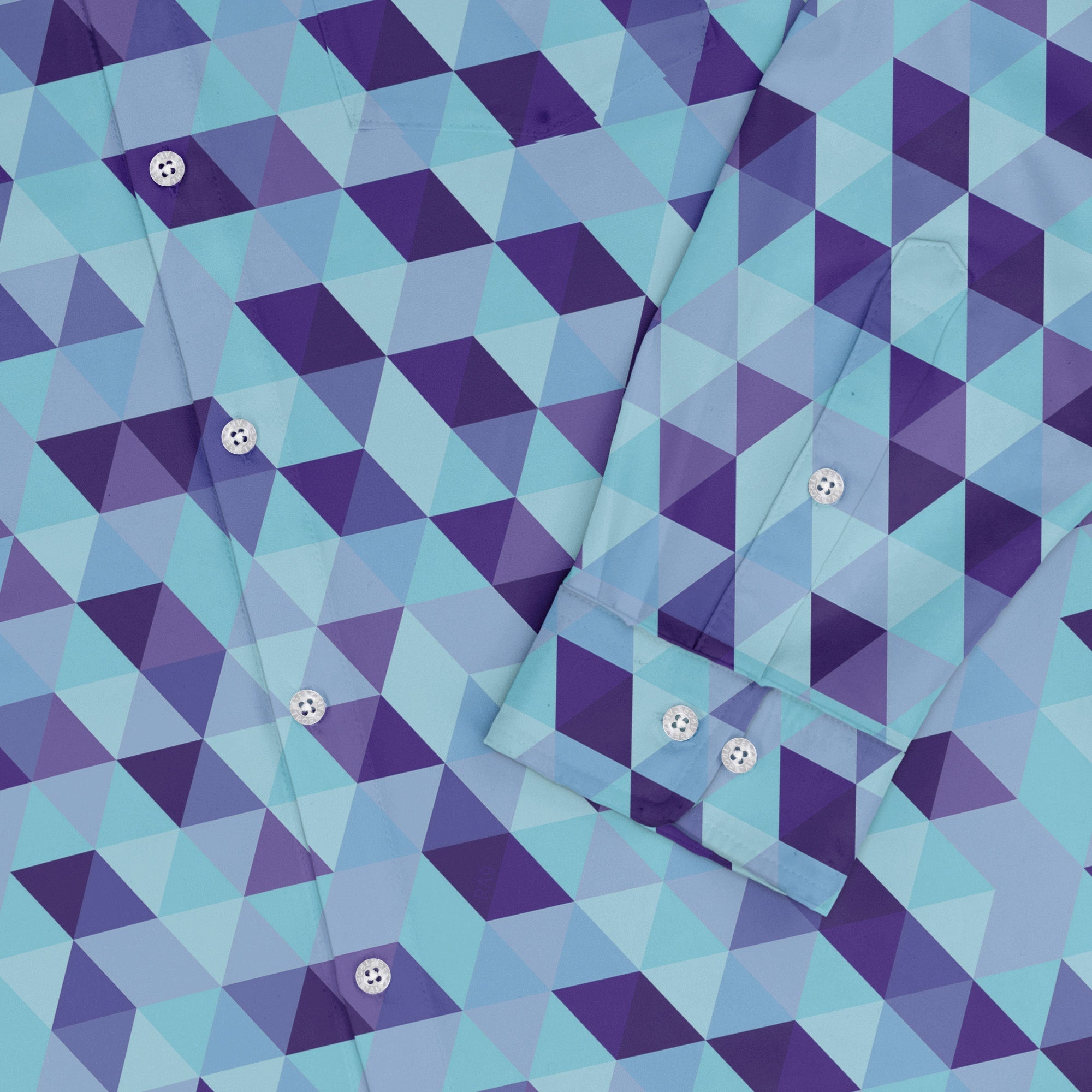 Meet the Deviant Polygons Long Sleeve Button Up Shirt, a geometry-forward ode to retro arcades and low-poly swagger. The allover pattern swirls with sharp, deviating polygons that align cleanly across the front and pocket for a seamless, nerd-chic finish. Designed by Claire Murphy, it delivers boss-level style, easy comfort, and an eco-minded, artist-backed print you can feel good about.