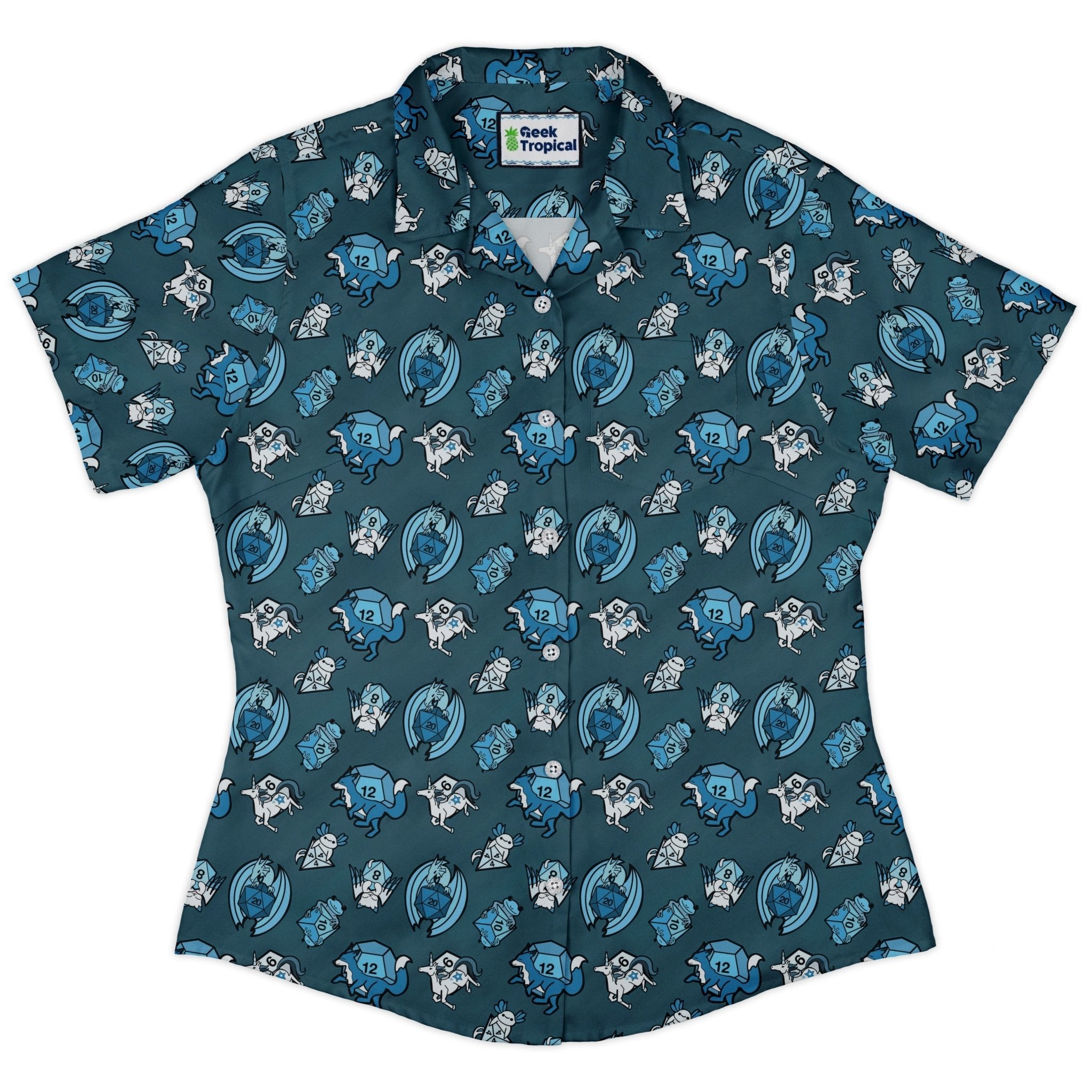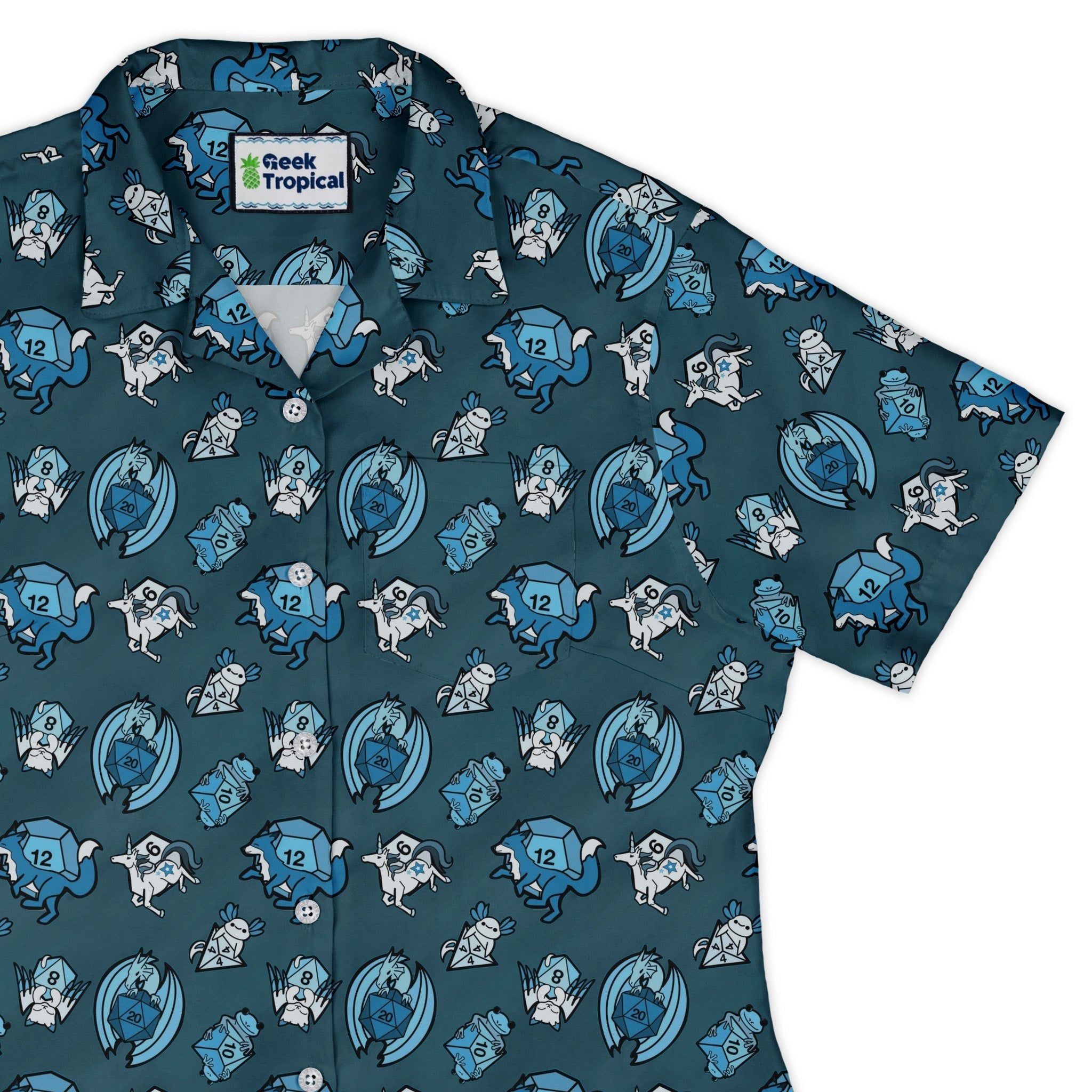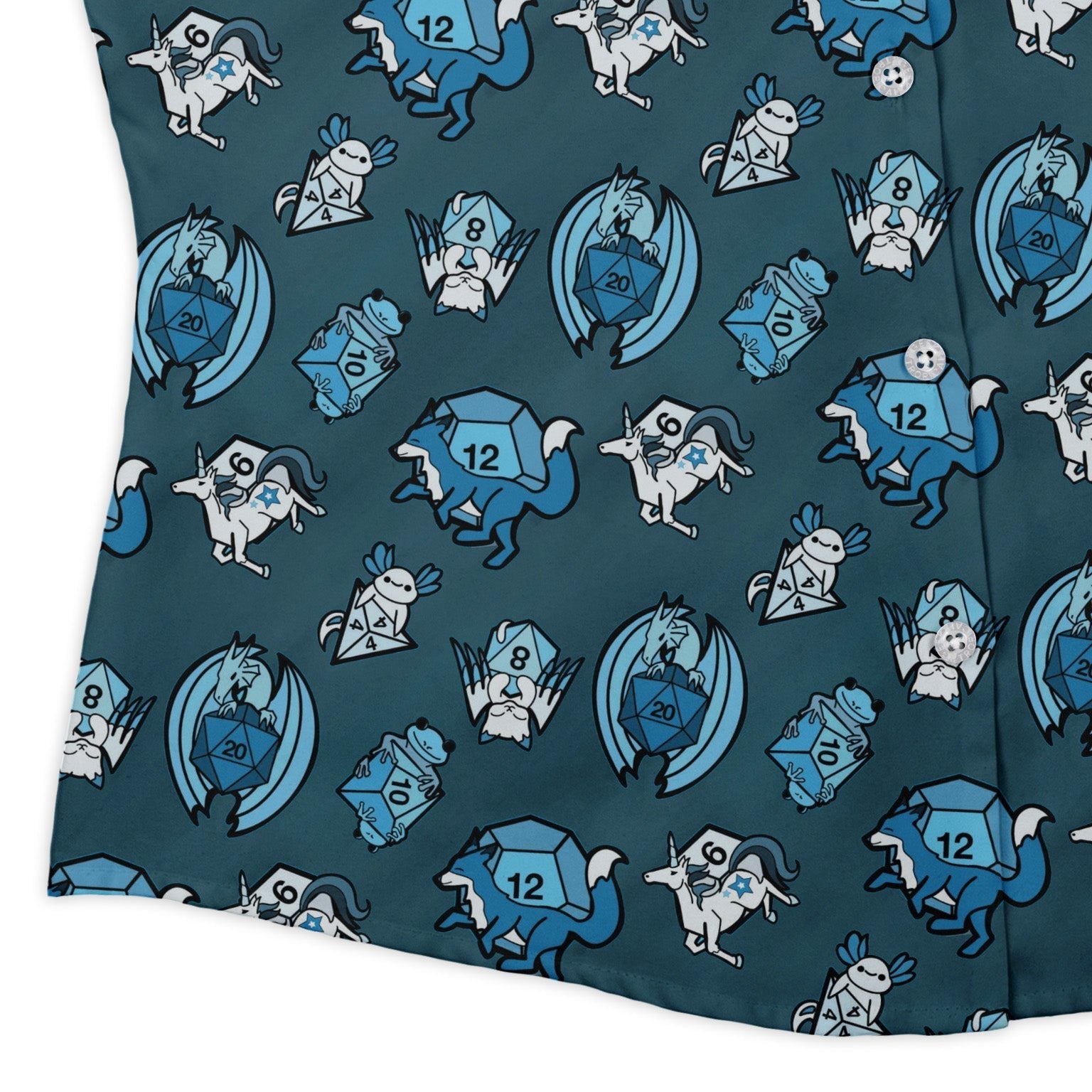 Dice Critters Blue Monochrome Curvy Button Up Shirt brings playful RPG energy to a curve-loving silhouette. A cool blue palette of dice and tiny critters flows in a seamless pattern across the chest and pocket, keeping the vibe clever yet polished. Designed by Rose Khan, it’s soft, breathable, and ready for Dnd nights or everyday wear. Versatile sleeves and branded finishing touches elevate the look, and it’s sustainably printed to support licensed artists.