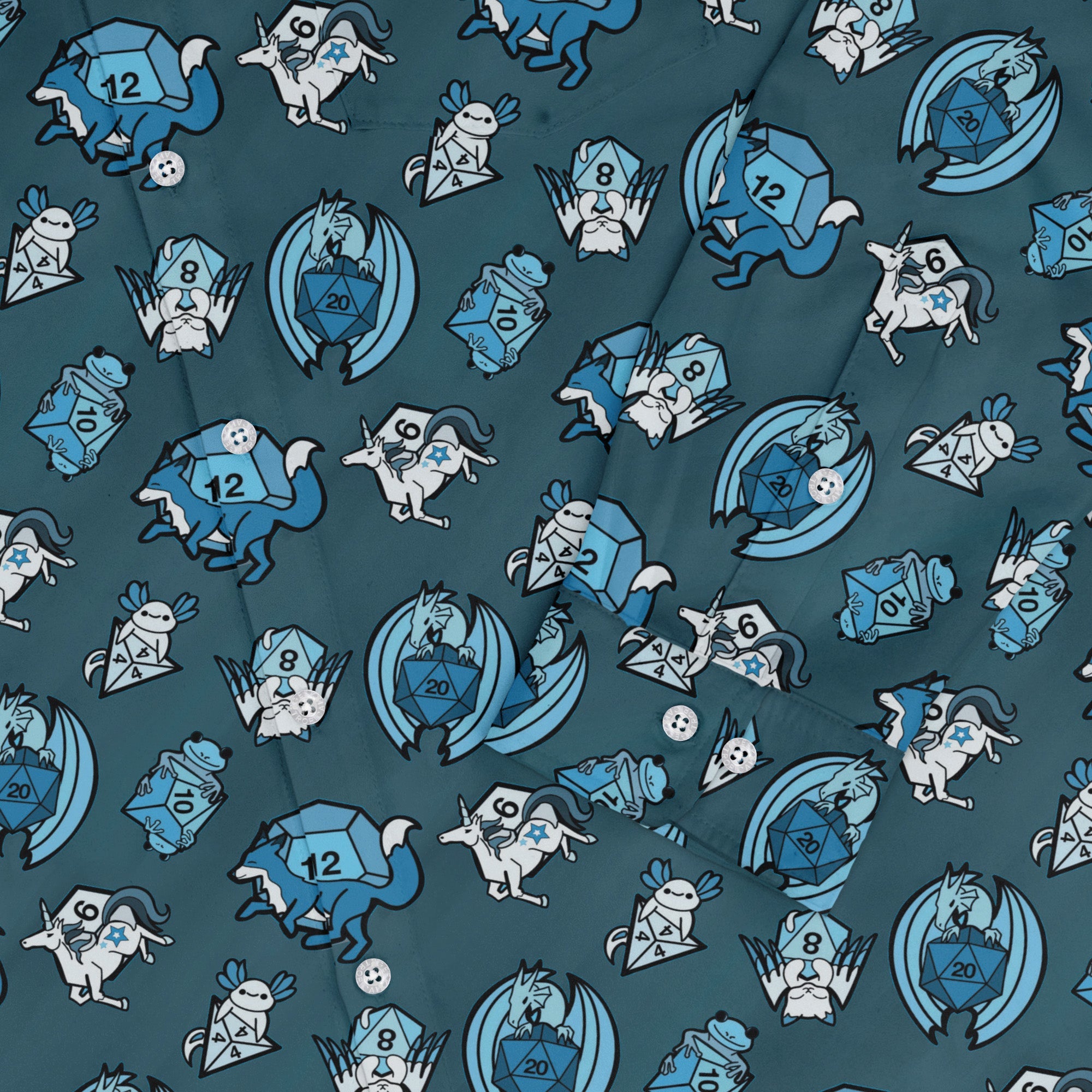 Level up your look with the Dice Critters Blue Monochrome Long Sleeve Button Up Shirt, a cool-toned nod to adorable beasts and tabletop luck. In layered blues, critters mingle with lucky dice in a crisp pattern that aligns cleanly across the chest pocket. Long sleeves and a relaxed silhouette move from session to office. Designed by Rose Khan, printed with eco-conscious inks.
