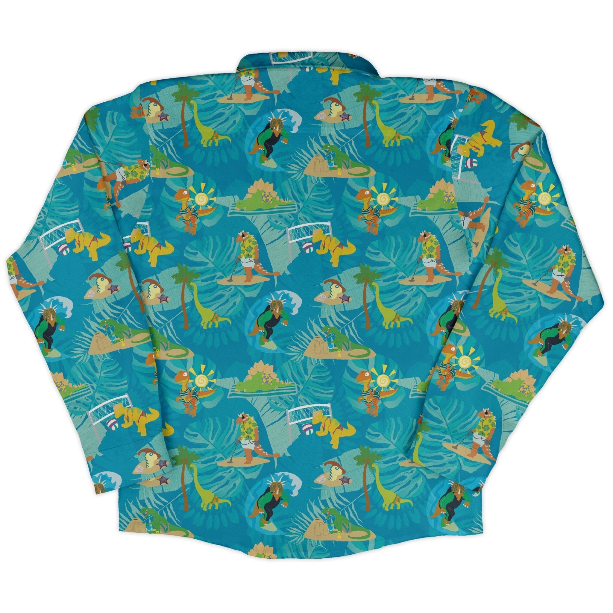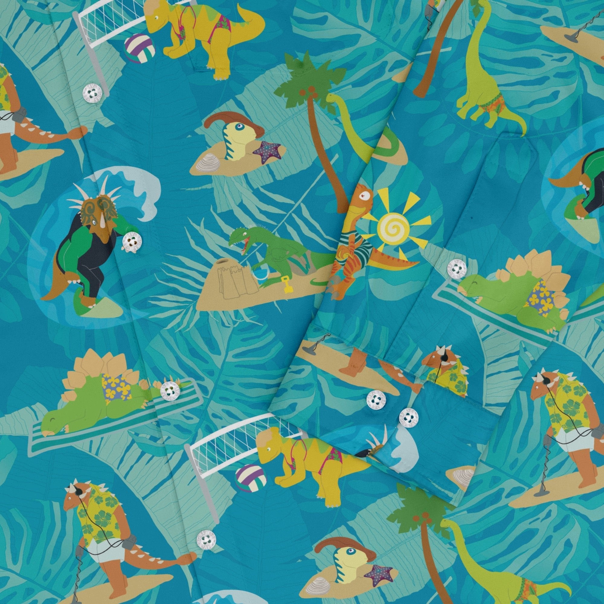 Meet the Dino Beach Party Long Sleeve Button Up Shirt—where paleo joy crashes into island chill. The all-over print features dinos soaking up a beach-day vibe amid palm-filled tropical patterns, with artwork that lines up cleanly across the front and pocket. Soft, lightweight, and breezy for all-day wear, printed with eco-conscious inks, and designed by Nathan so your style backs the artist.