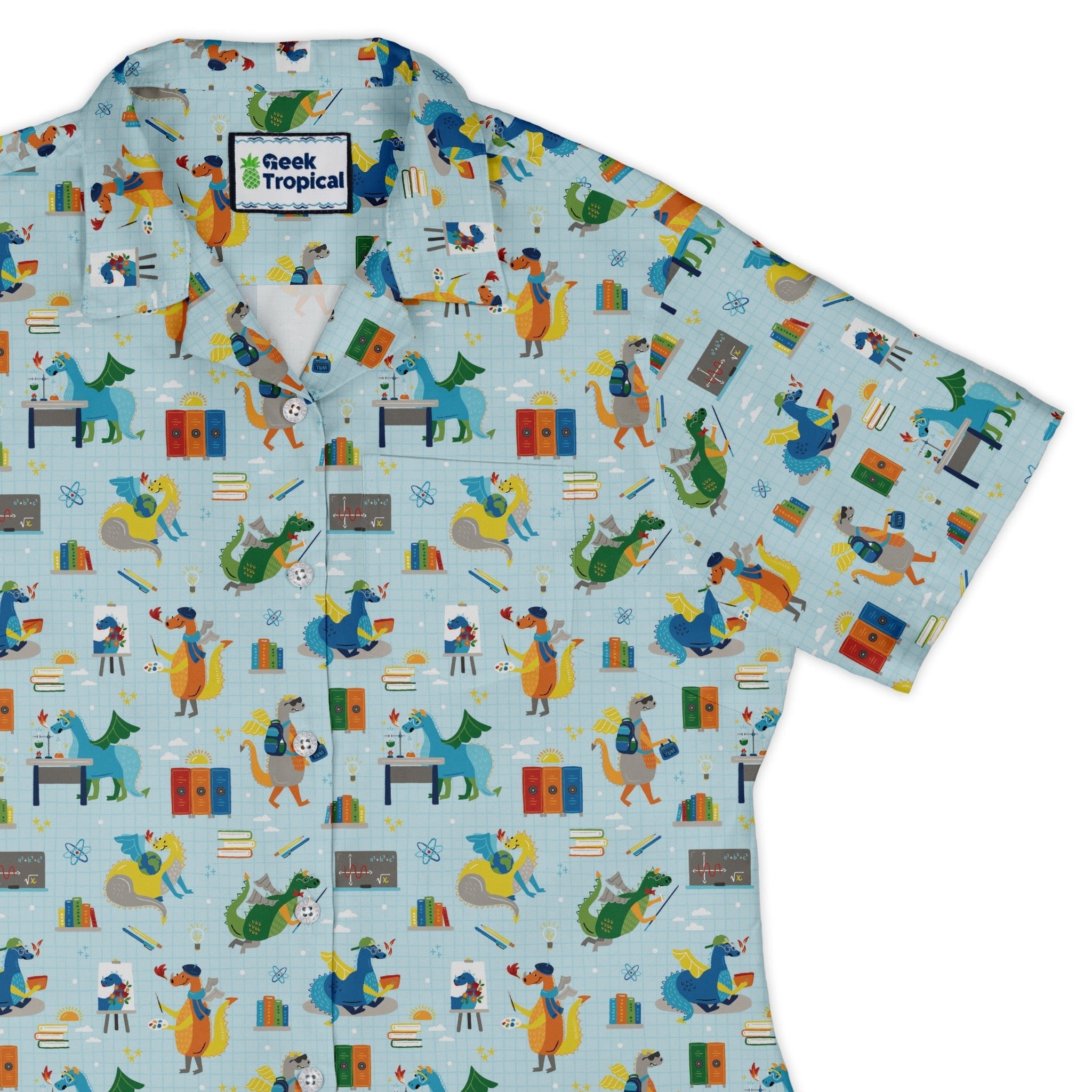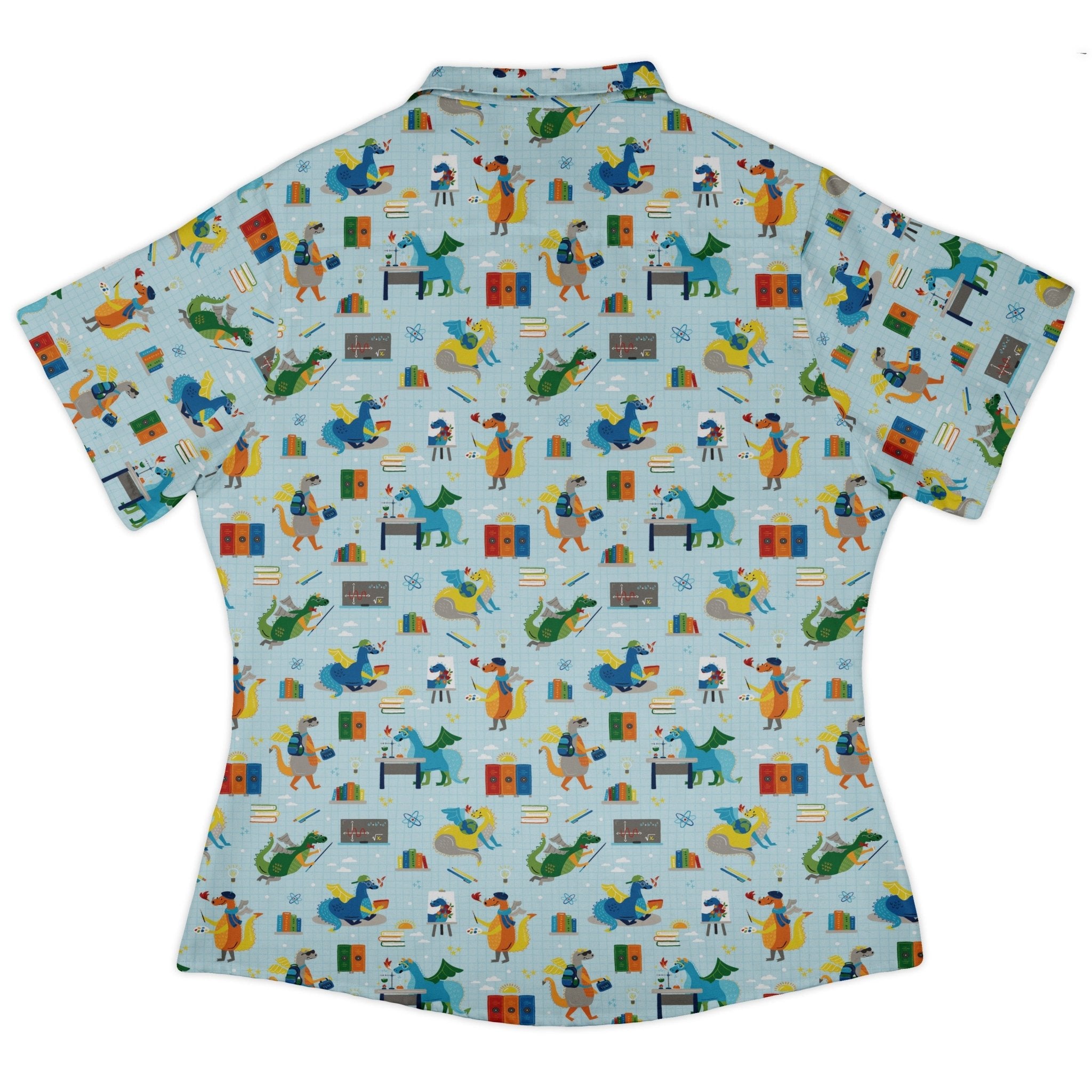Meet the Dino School Curvy Button Up Shirt, a clever, artist-backed staple designed by Zirkus Design for the science-loving set. An all-over dinosaur print brings scholastic energy with playful, precise linework, while the curvy cut skims in all the right places. Sleek shoulders and adjustable sleeves keep it sharp, and it looks polished tucked or untucked. Pattern continuity flows across the pocket, finished with distinctive buttons. Printed with planet-friendly inks.