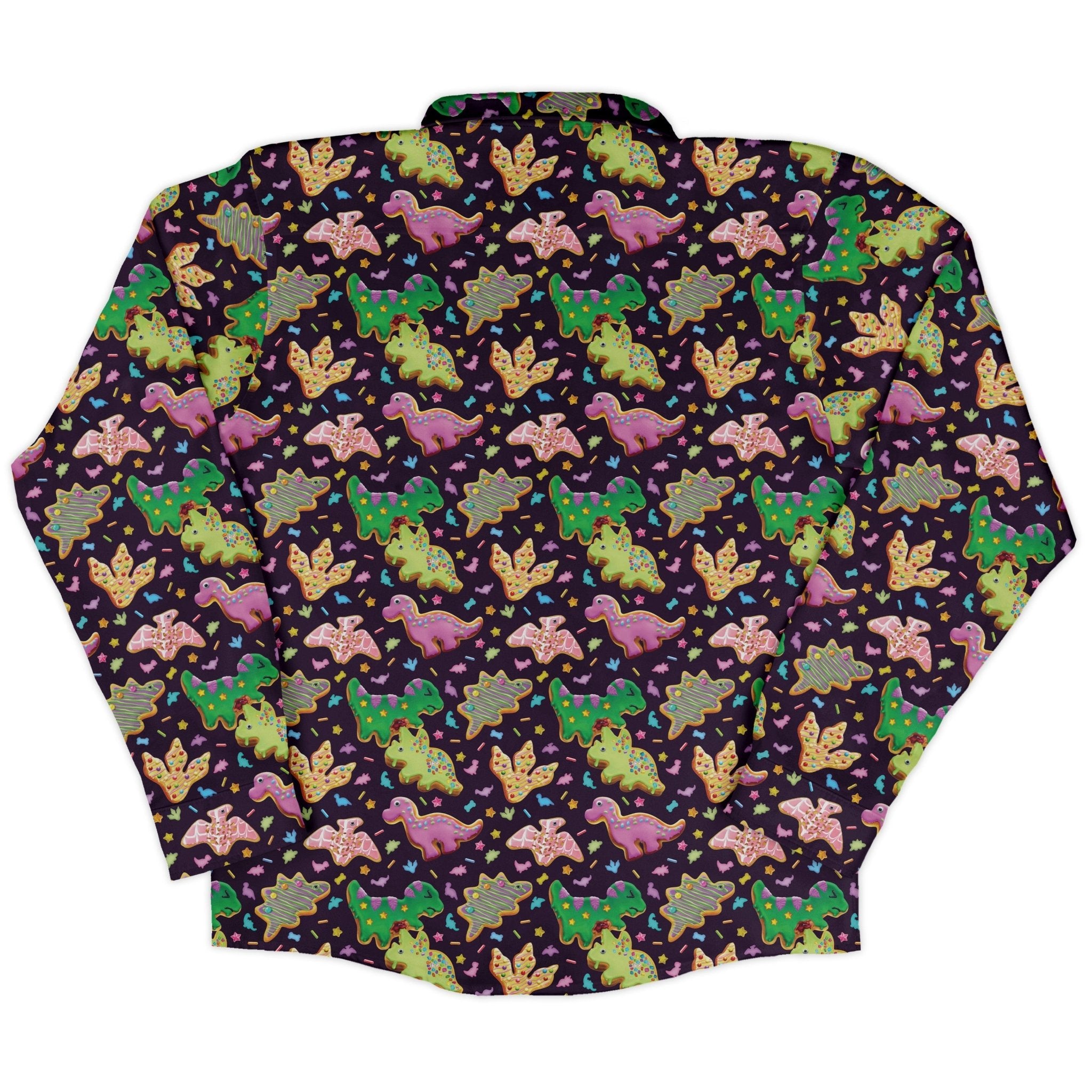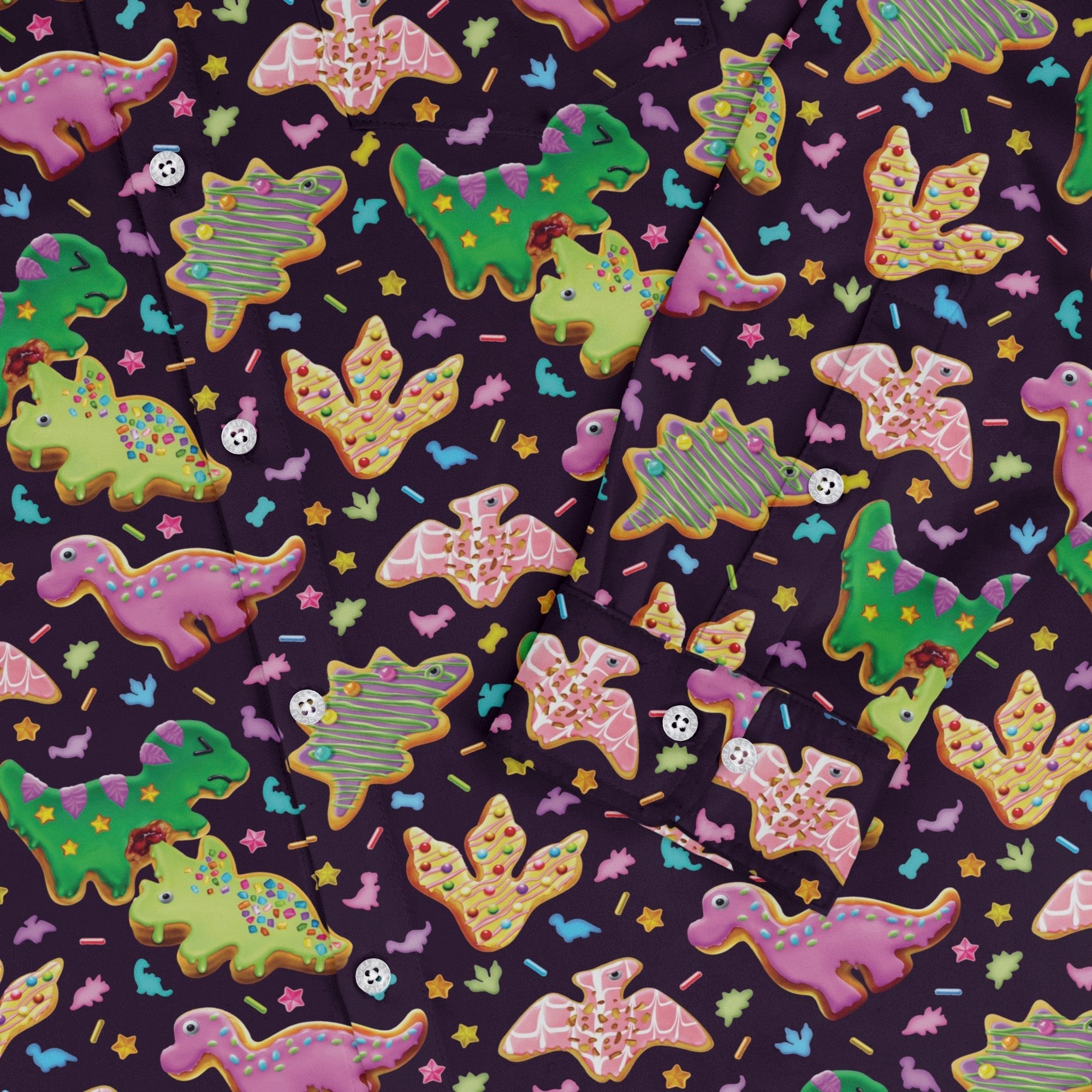 Meet the Dinonuts Long Sleeve Button Up Shirt, where Jurassic vibes snack on sweet glaze. A playful all-over mash-up of dinosaurs and donuts wraps the whole shirt—placket to pocket—so the pattern stays satisfyingly continuous. Cut in a relaxed, modern silhouette with adjustable cuffs and smooth, breathable feel that keeps up all day. Designed by Brigid Ashwood and printed with eco-conscious inks, every purchase backs the artist who dreamed it up.