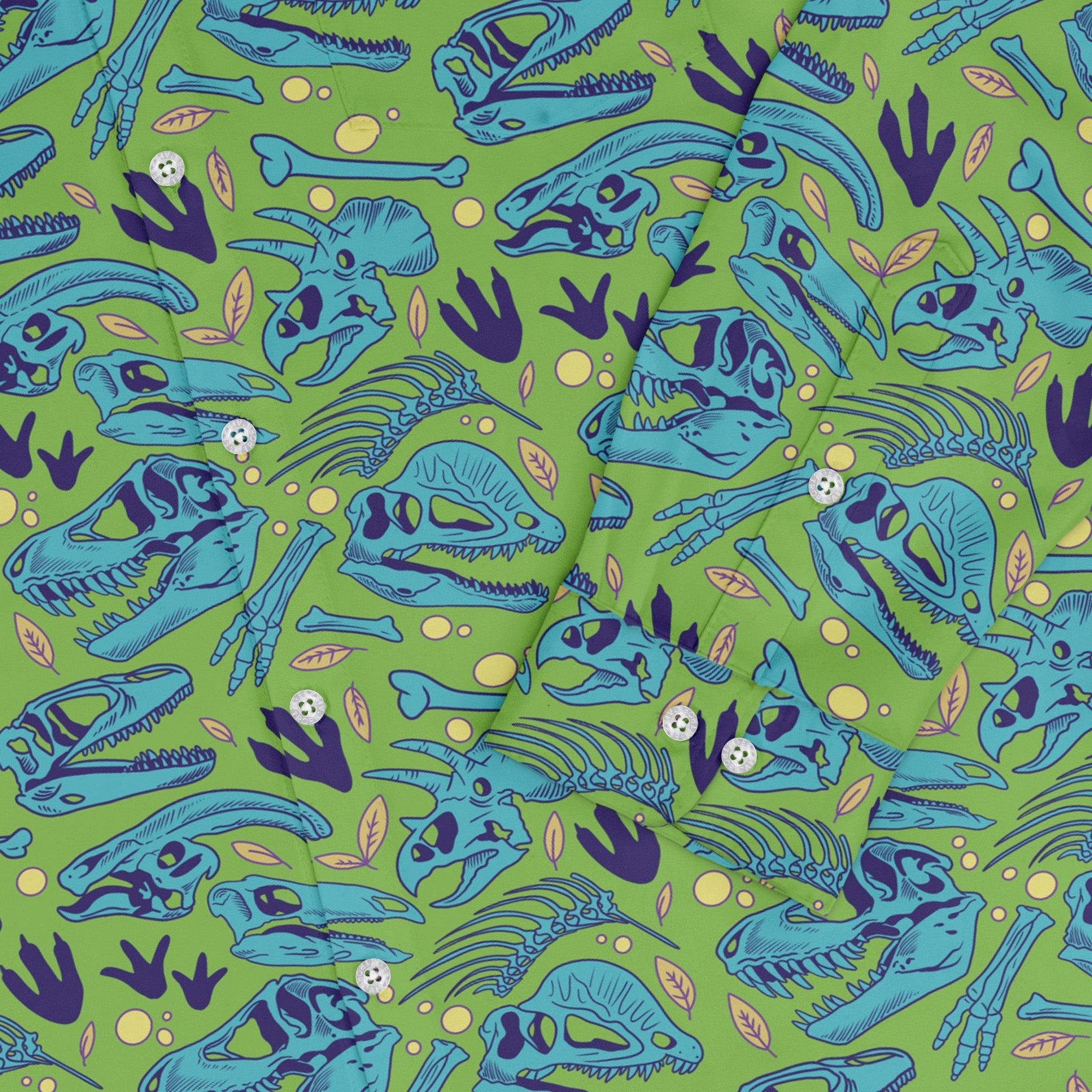 Dig into your nerdy side with the Dinosaur Bone Digs Long Sleeve Button Up Shirt. Designed by Julie Kitzes and printed with eco-conscious inks, this all-over print layers illustrated fossil fragments—skulls, ribs, vertebrae, and teeth—like a curated dig site across a crisp, collared silhouette. Soft, breathable, and made to move, it pairs geeky charm with clean tailoring and artist-backed cred.