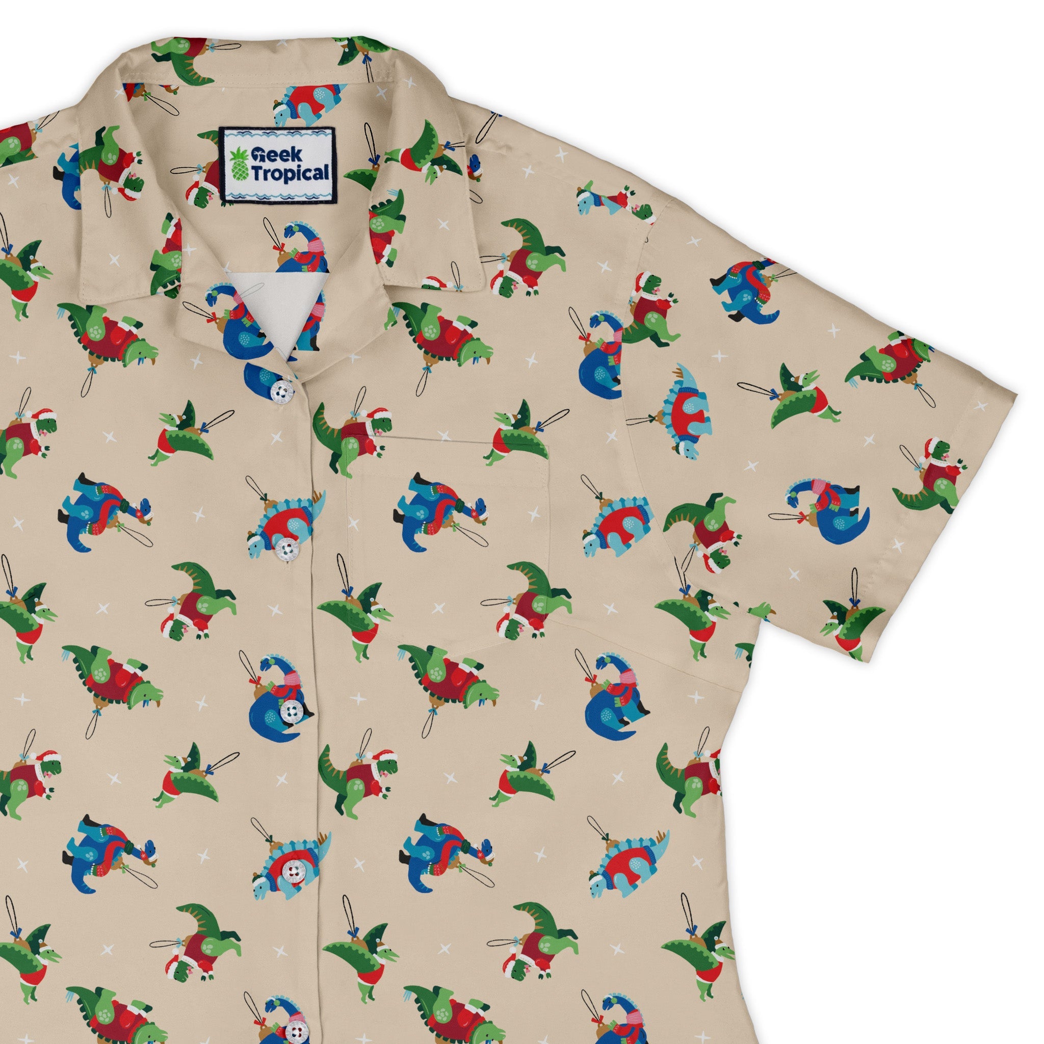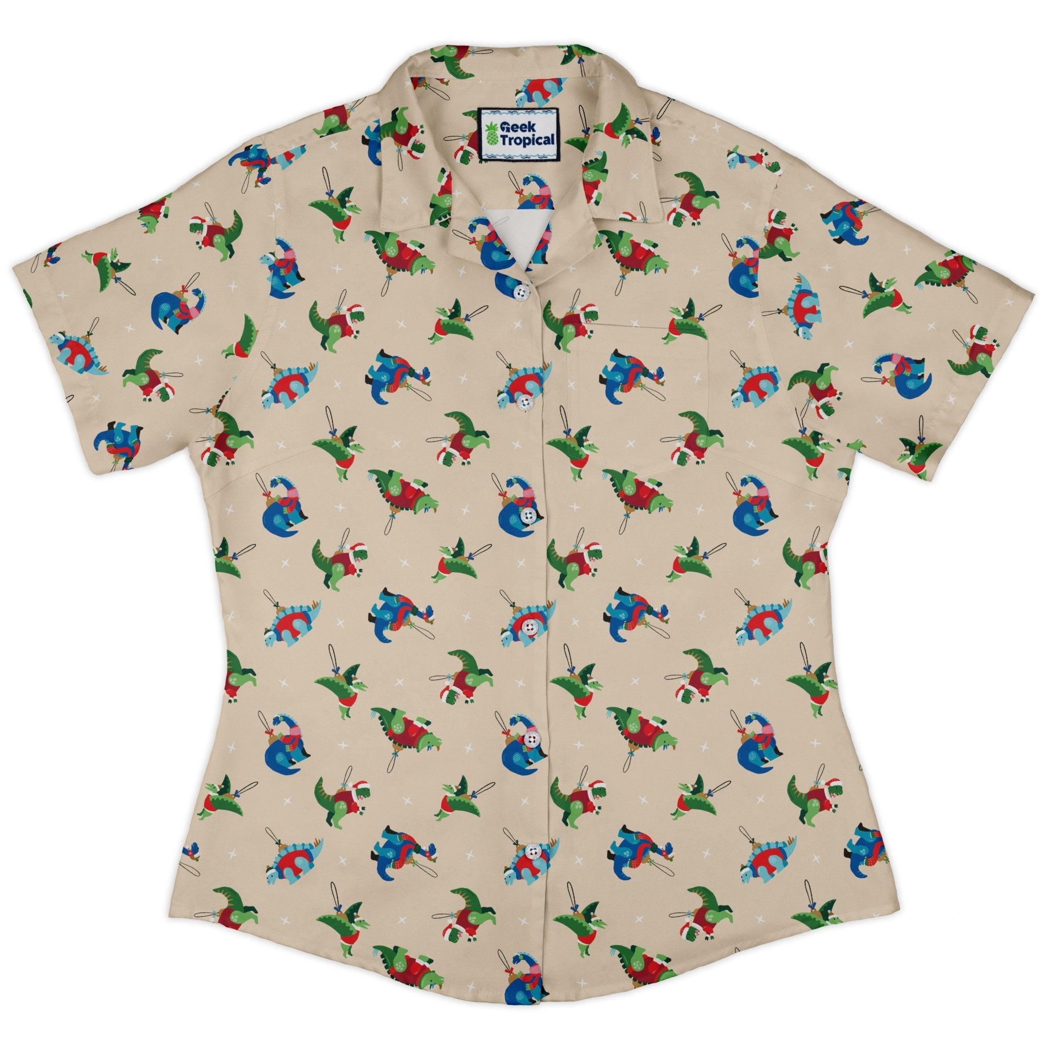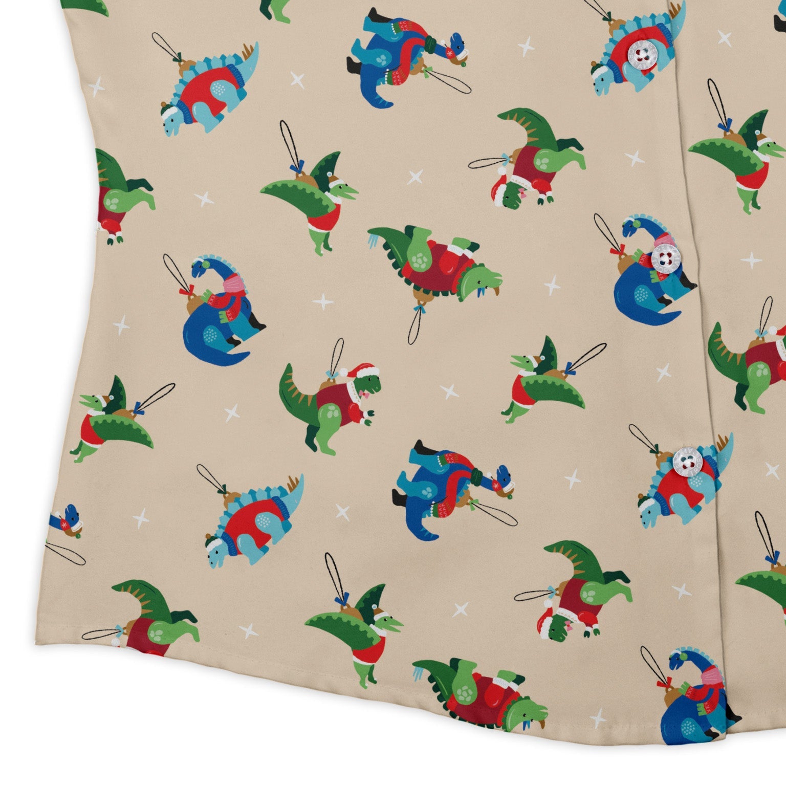 Meet the Dinosaur Ornaments Curvy Button Up Shirt, where geeky merriment goes full festive. Dinosaurs reimagined as ornaments parade across the fabric in a playful, repeating print, flowing cleanly over the chest pocket for a seamless look. Cut for curves with a polished collar and easy drape, it’s as comfortable as it is clever. Designed by Zirkus Design and printed with eco‑conscious inks, every purchase supports licensed artists.