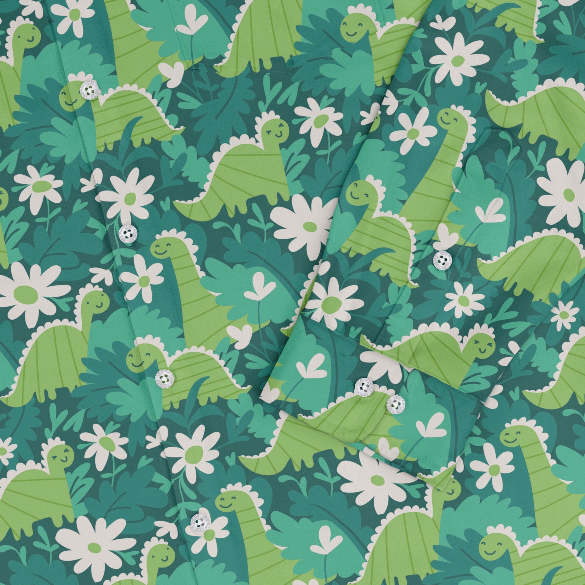 Dinosaur Smiles Flowers and Leaves Long Sleeve Button Up Shirt puts geek-chic joy front and center: grinning dinosaurs hide among lush leaves and bright tropical flowers in a bold, maximalist print. Built for everyday comfort with a classic collar and buttoned cuffs, it moves from office hours to museum tours without missing a beat. Pattern alignment keeps the art flowing across the front and pocket, and the design uses eco-conscious inks that support licensed artists.