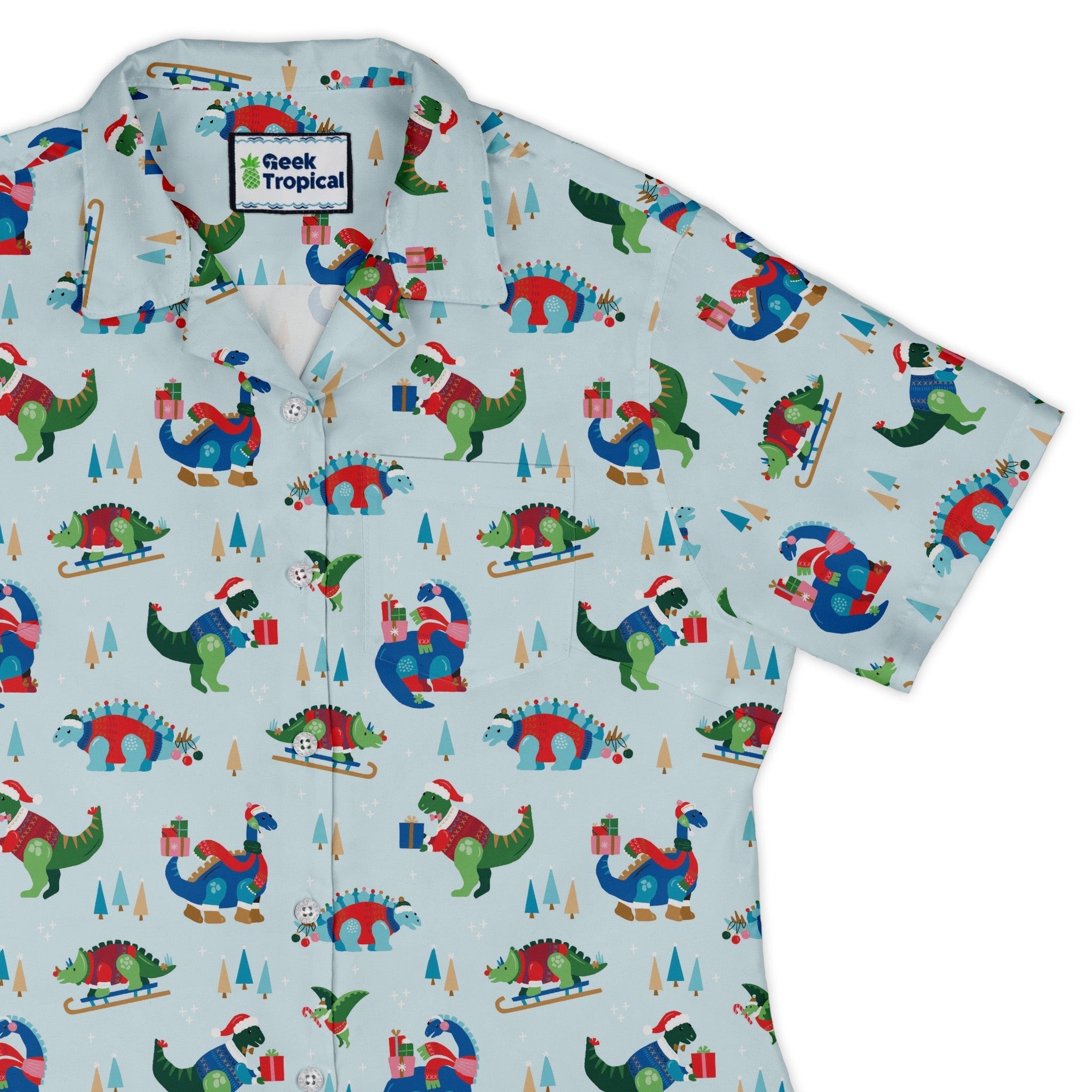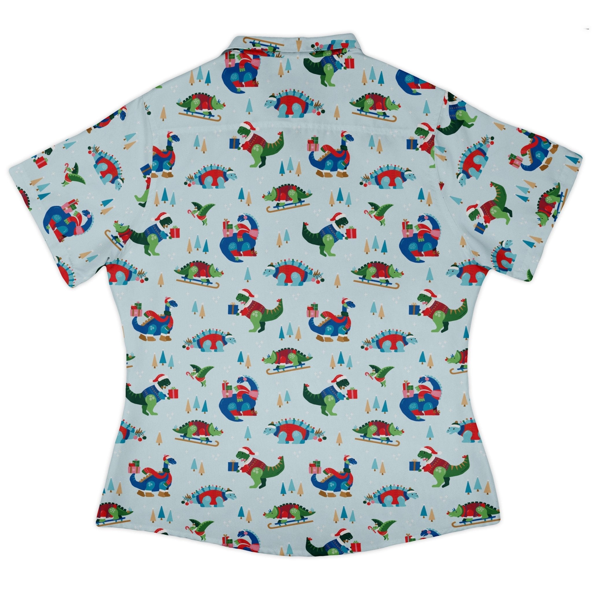 Dinosaur Wonderful Winter Curvy Button Up Shirt brings holiday cheer to your geeky rotation with a playful winter dinosaur pattern, designed by Zirkus Design. Cut for curves, it skims in all the right places and sits polished whether tucked or untucked. The artwork flows cleanly across the front and pocket, finished with branded buttons. Soft, day-long comfort, adjustable sleeves, and eco-conscious inks make it a smart, spirited pick that also supports licensed artists.