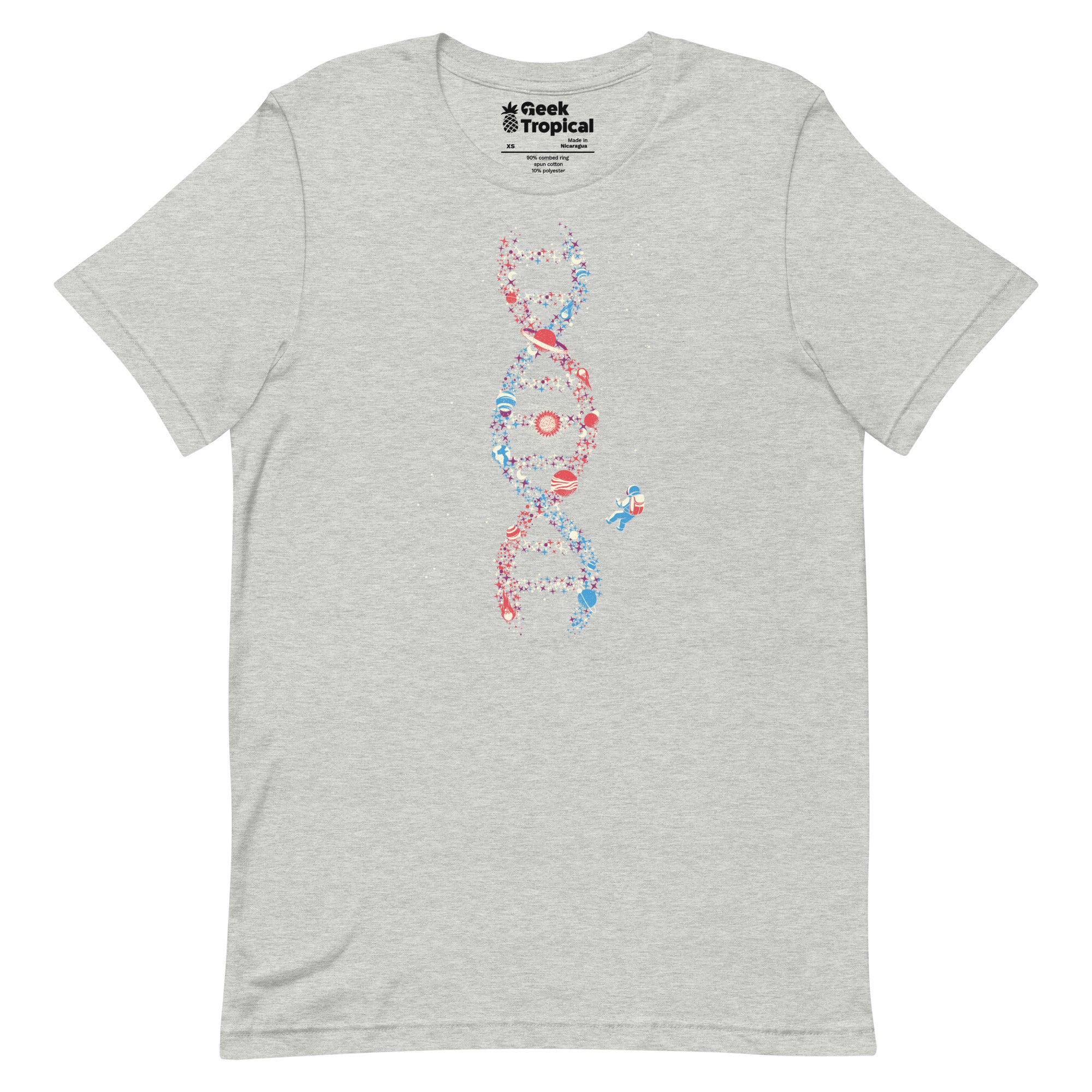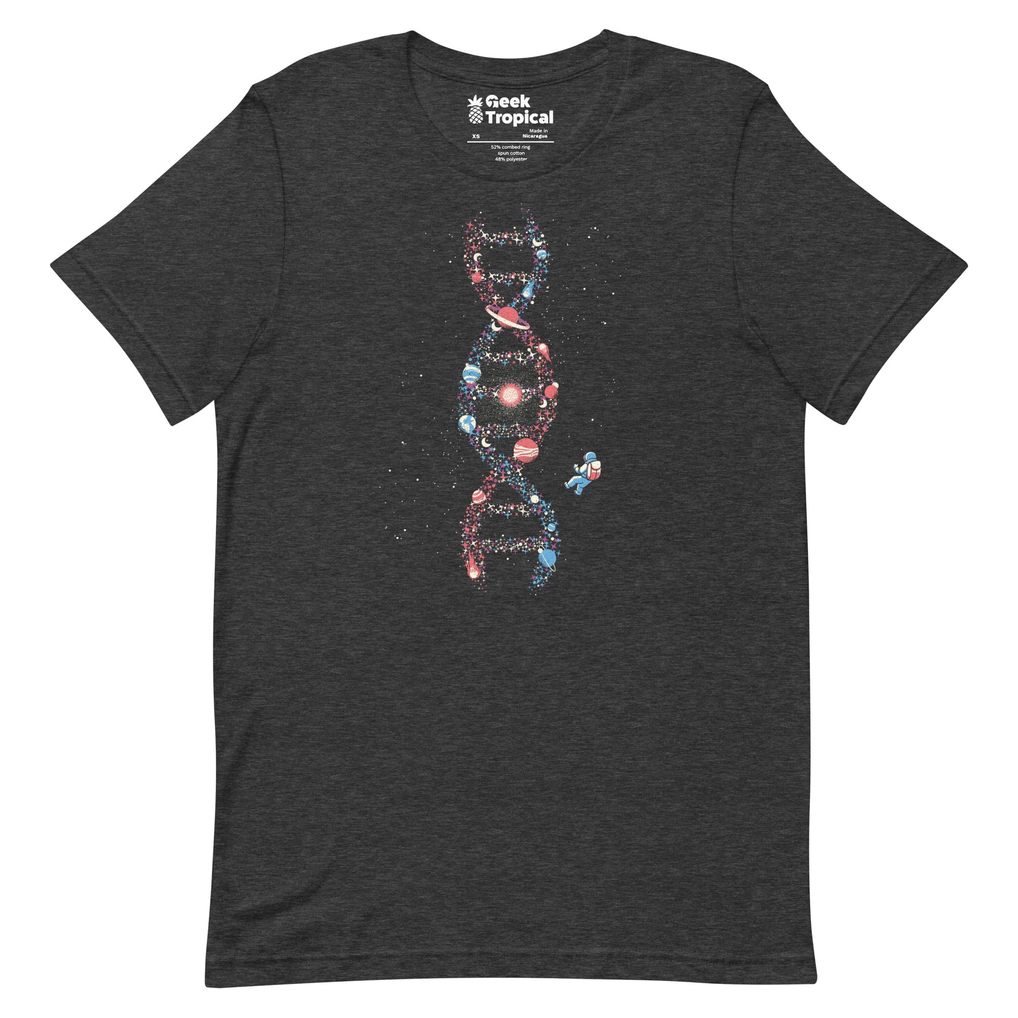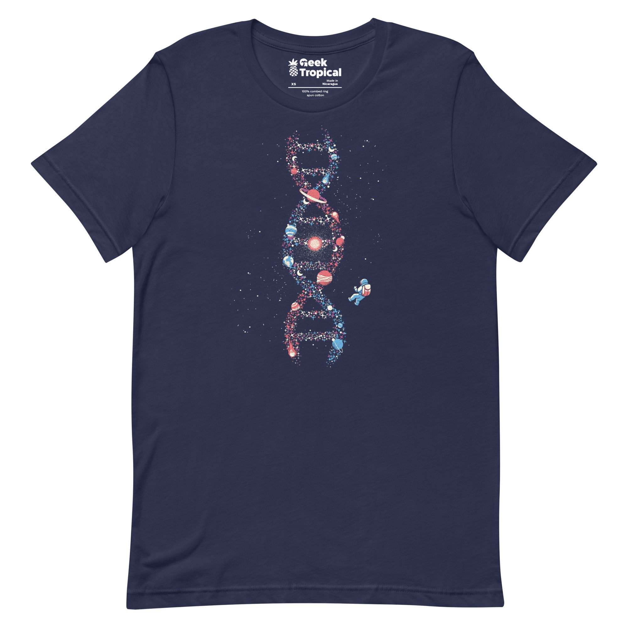 The DNA Galaxy T-Shirt maps your code to the cosmos. A strand of DNA emerges from a star-swept sky, its double helix traced in constellations as a lone astronaut floats along the spiral, turning science into spacefaring art. Designed by Tobe Fonseca and artist-backed, it’s a wink to lab nerds, skywatchers, and anyone whose curiosity orbits beyond Earth. Wear your origins and aim for the stars.