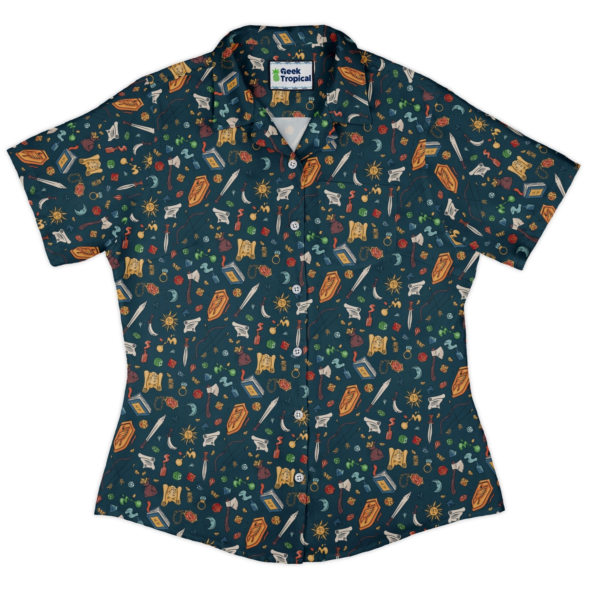 Meet the Dnd Adventure Curvy Button Up Shirt, a campaign of style tailored for real-life heroines. The all-over print lines up across the front and pocket for a crisp, continuous look, while a sculpted shape celebrates your curves. Lightweight and soft for marathon sessions, with roll-ready sleeves and a neat rounded hem that works untucked. Printed with eco-conscious inks and artist-backed—gear up, quest on.