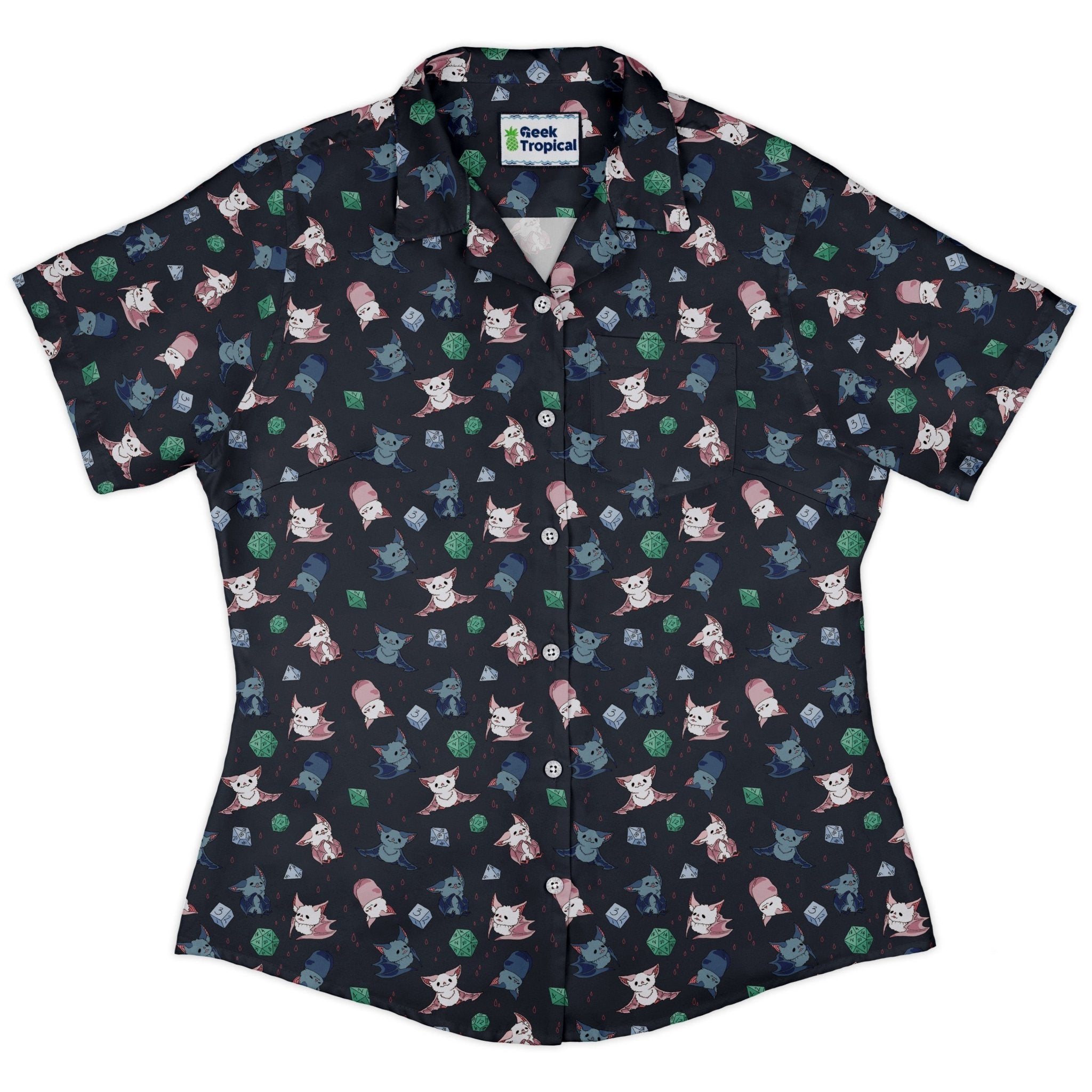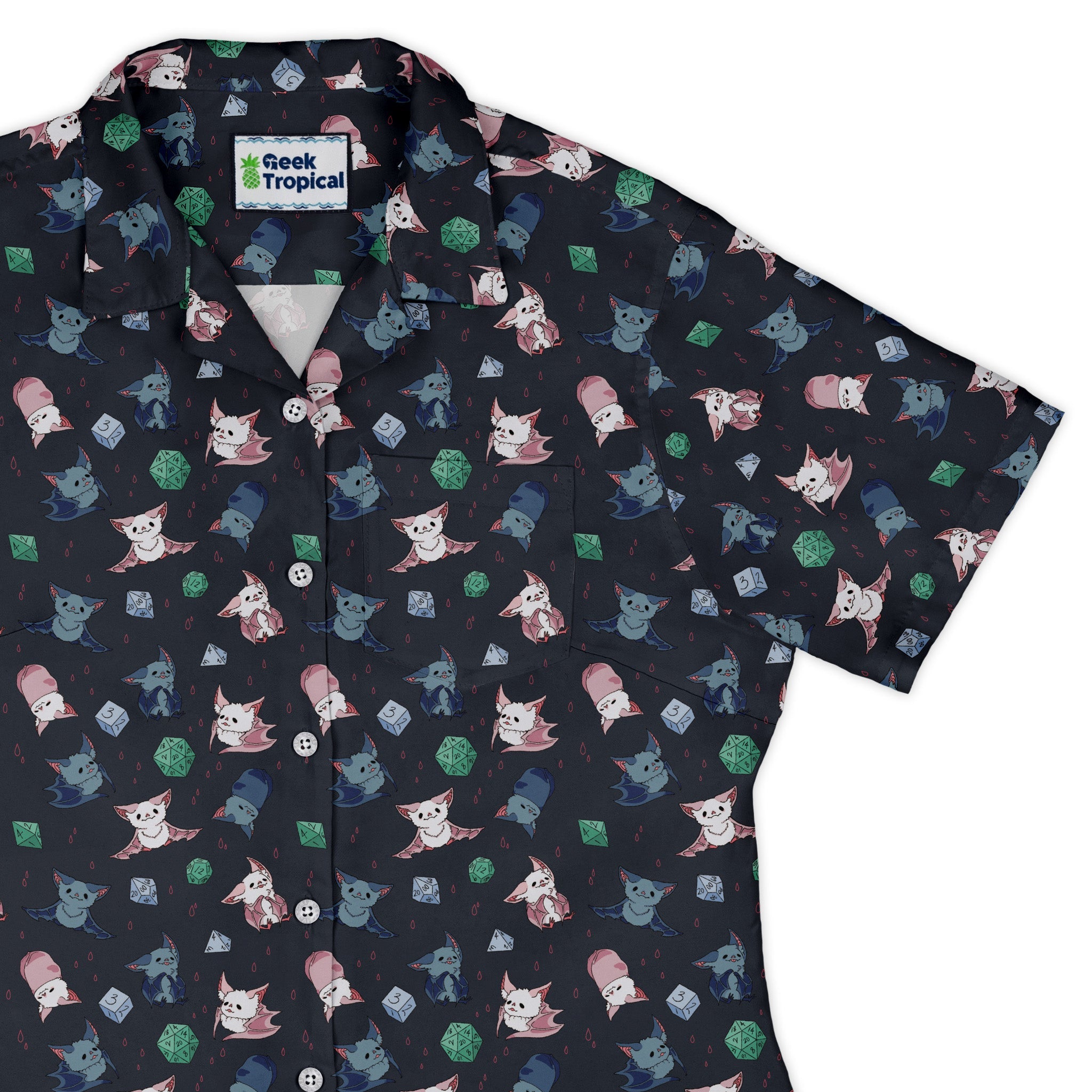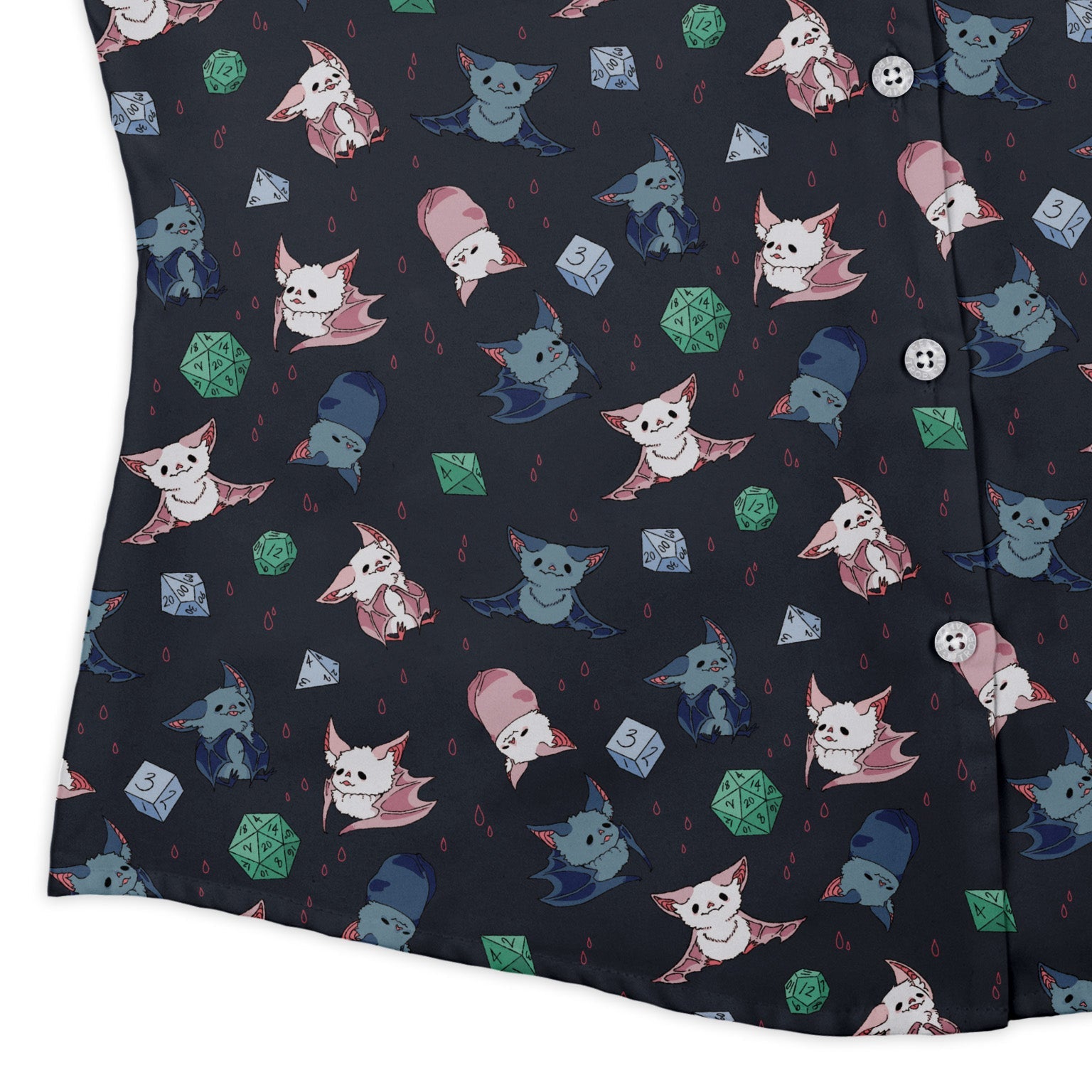 The Dnd Bat Familiars Curvy Button Up Shirt summons a colony of charming bat companions in an allover repeat, designed by Ardi Tong. Cut to flatter curves with a rounded hem that nails the untucked look, it blends breathable comfort with a sleek, contoured silhouette. The pattern aligns across the front and pocket, sleeves adjust to suit your vibe, and signature buttons finish it off—printed with eco-conscious inks, and your purchase supports the artist.