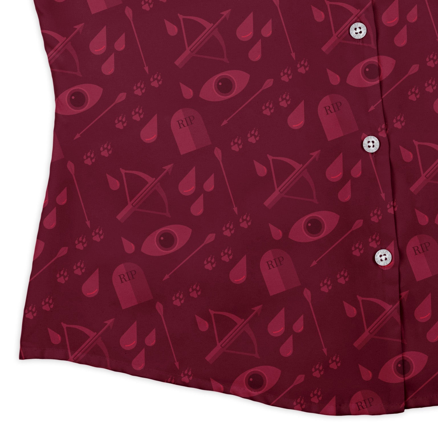 Dnd Blood Hunter Class Curvy Button Up Shirt brings your favorite class to life in a bold, all-over pattern designed by Heather Davenport. The print is rich and moody with intricate linework and repeating class iconography, creating a seamless look across the front and pocket. A curvy, tailored silhouette keeps it polished yet comfortable—perfect for game night, office hours, and everything between. Artist-backed and printed with eco-conscious inks.