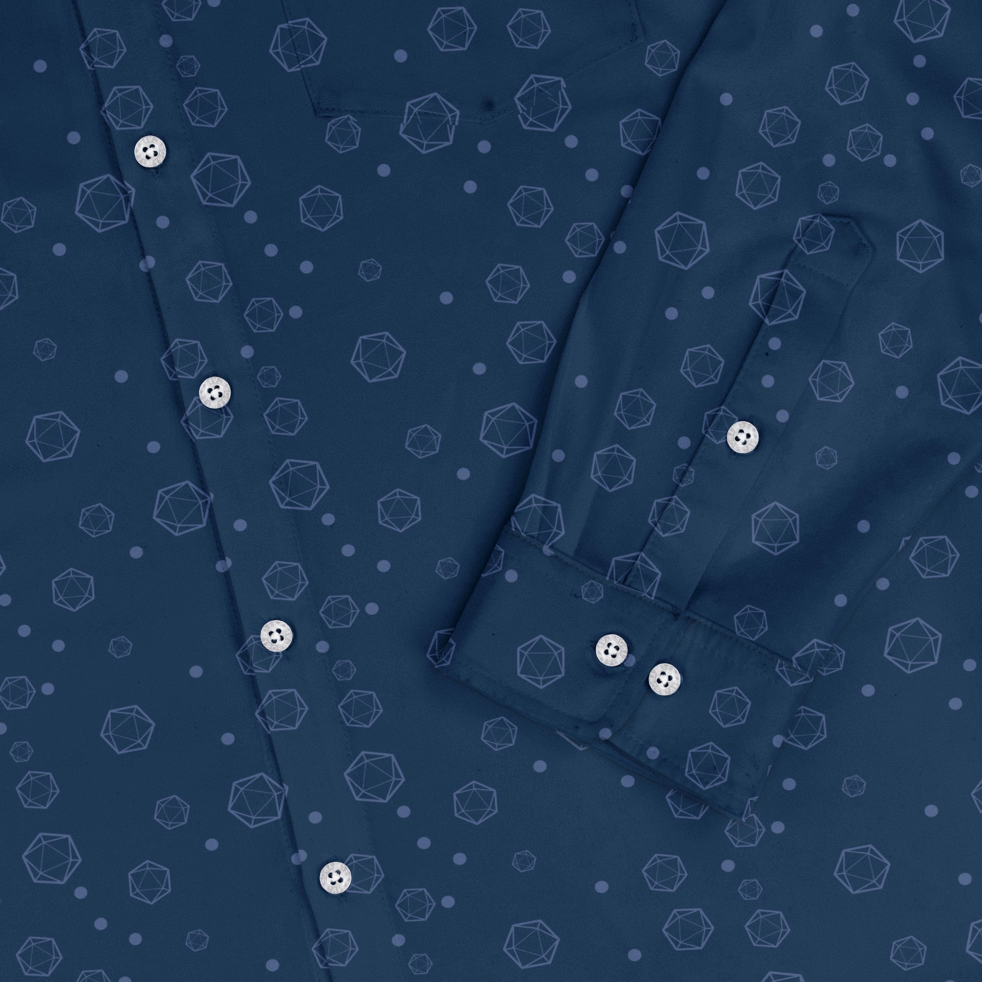 Meet the Dnd Dice Bubbles Long Sleeve Button Up Shirt, built for clever style from campaign night to casual Fridays. Designed by Heather Davenport, the print sets crisp polyhedral dice adrift inside glossy bubble circles over a cool-toned base, with the pocket neatly pattern-matched for a clean finish. Smooth, lightweight comfort and an artist-backed, eco‑minded print make this your easiest critical hit in the wardrobe.