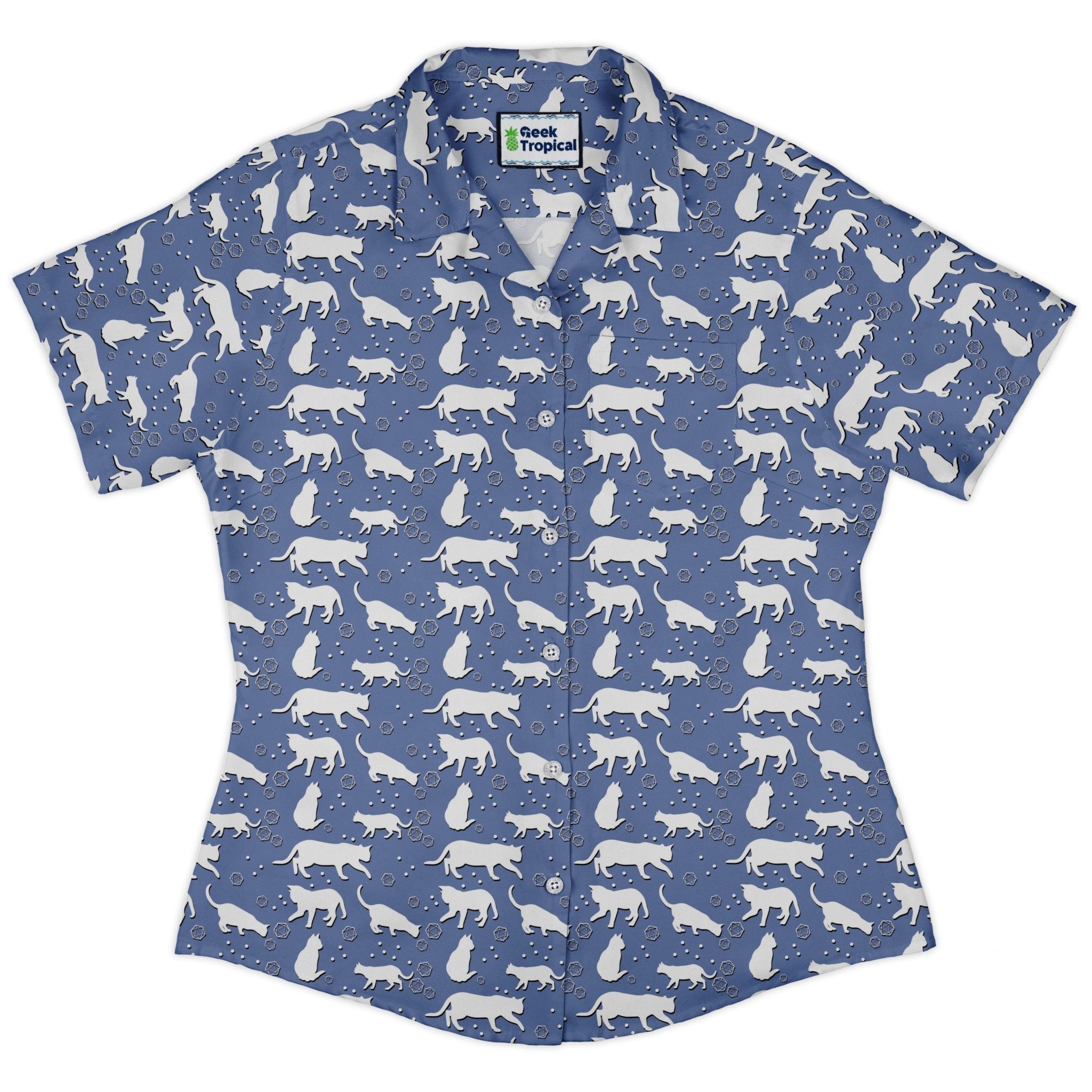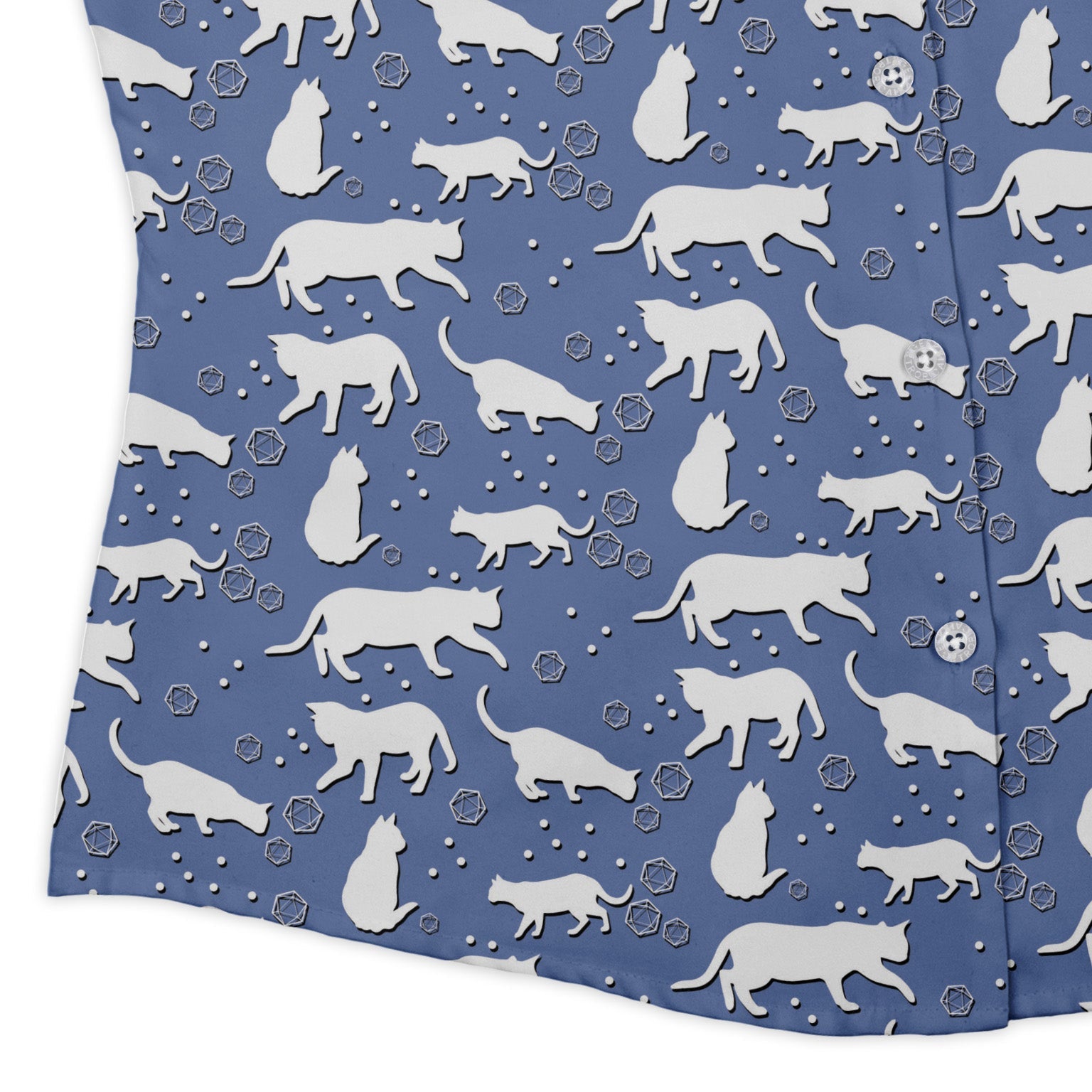 The Dnd Dice Cats Curvy Button Up Shirt brings chaotic-cute energy: curious cats lounge and pounce among crisp dice on an allover print, aligned cleanly across the placket and pocket. Shaped for curves with a polished untucked silhouette, it stays soft and breathable from quest prep to coffee runs. Designed by Heather Davenport and printed with eco-friendly inks, this artist-backed button up brings clever nerdcore charm to everyday outfits.