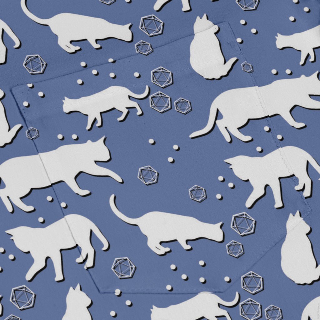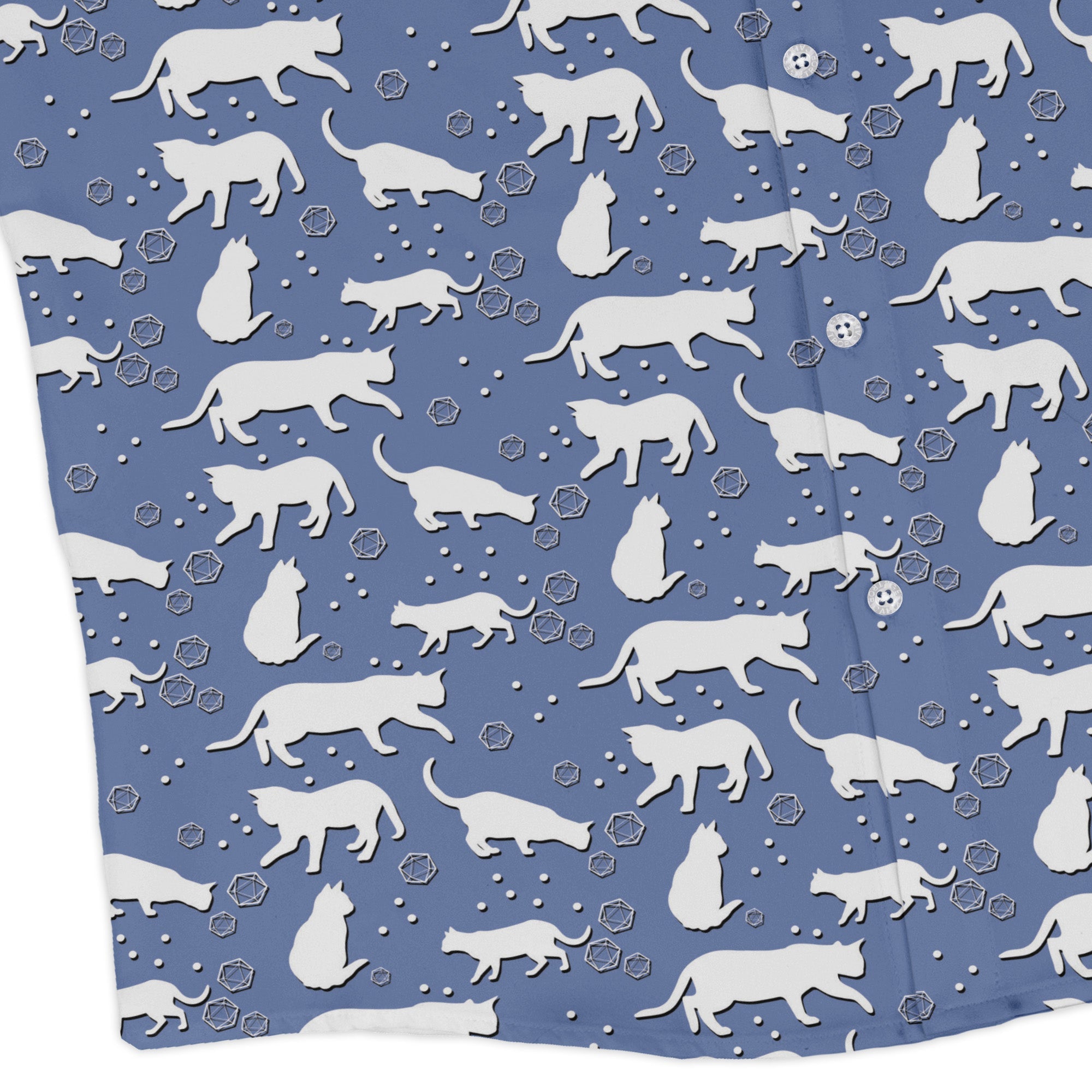 The Dnd Dice Cats Long Sleeve Button Up Shirt lets your inner cat bard roll in style. Designed by Heather Davenport, this playful repeat pairs curious cats with tabletop dice, and the pattern stays seamless across the placket and chest pocket. A polished, relaxed silhouette and long sleeves make it game-night sharp and office ready, while eco-conscious inks keep your look kind to the planet. Every purchase supports licensed artists.