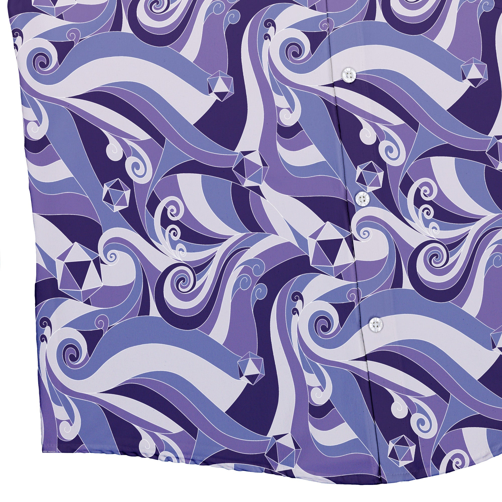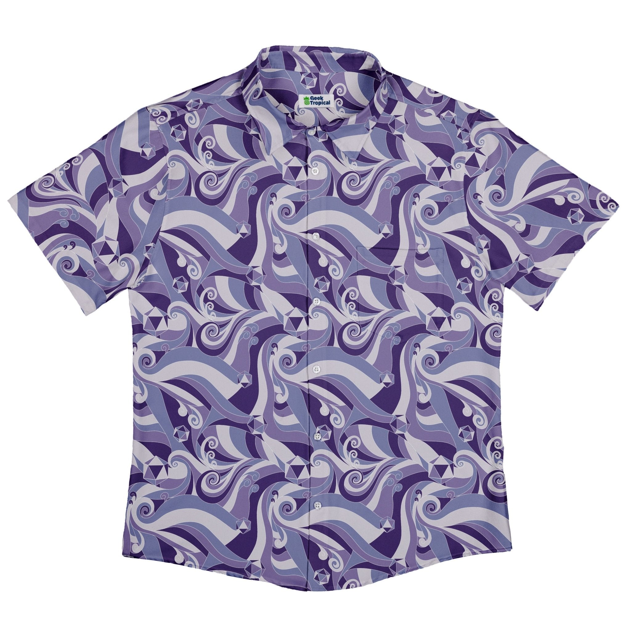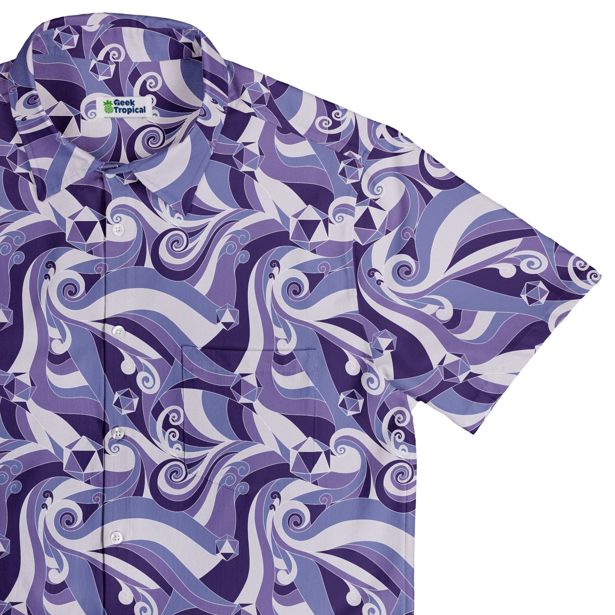 Level up your table style with the Dnd Dice Swirls Purple Button Up Shirt. A storm of violet hues curls across the fabric, dotted with crisp polyhedral dice and flowing swirls. Designed by Nathan, this all-over print turns nerdy banter into a conversation starter from game night to brunch. Licensed art you can wear, backing the creator while you roll through the day in comfort.