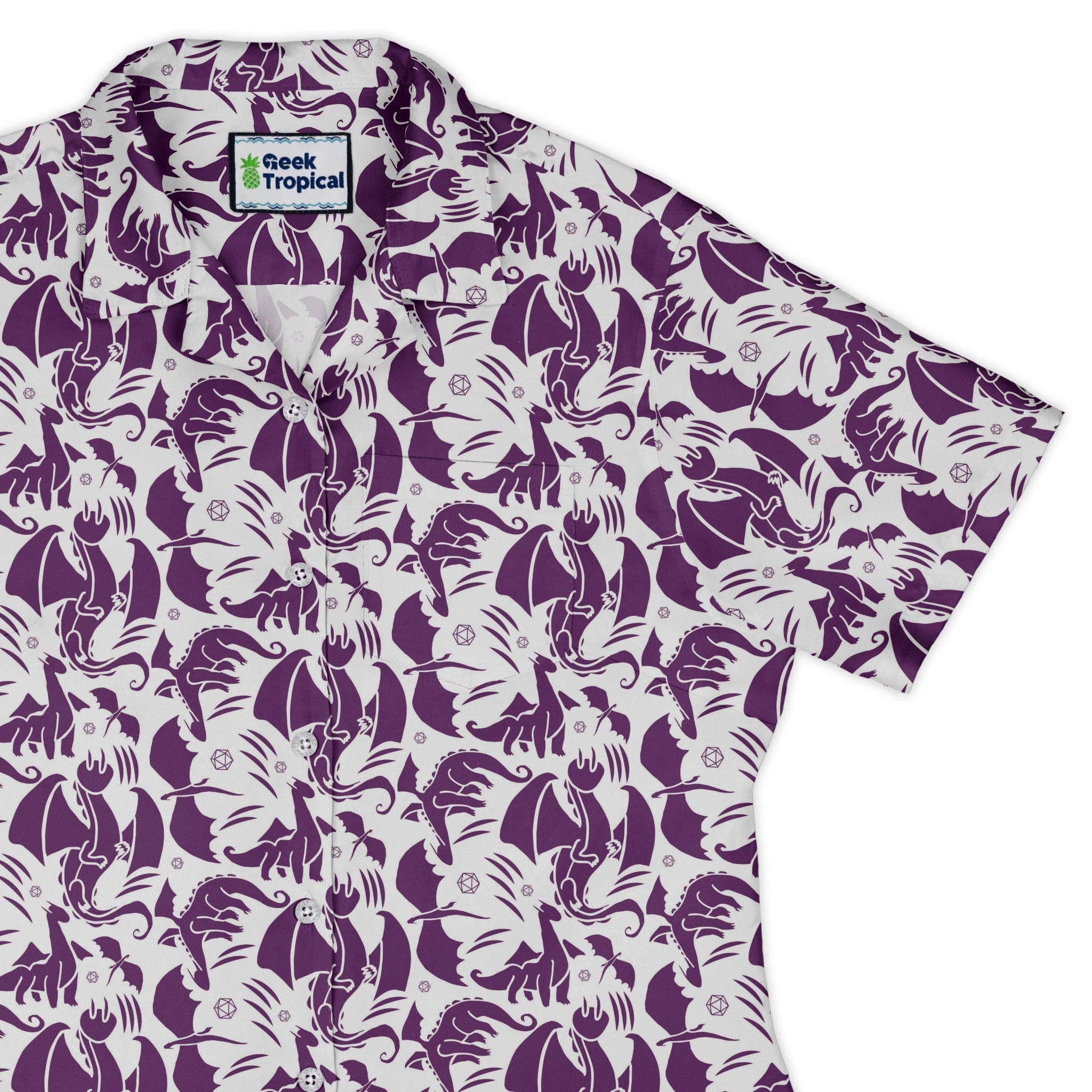 Meet the Dnd Purple Dragons Curvy Button Up Shirt, a spellbinding layer for campaigns and coffee runs alike. Designed by Heather Davenport, an allover purple dragon motif flows across the placket and pocket for a seamless look. A curvy, contoured cut flatters without fuss, with adjustable sleeves and a rounded hem that shines untucked. Lightweight comfort, artist-backed. Printed with eco-friendly inks and finished with quality buttons.