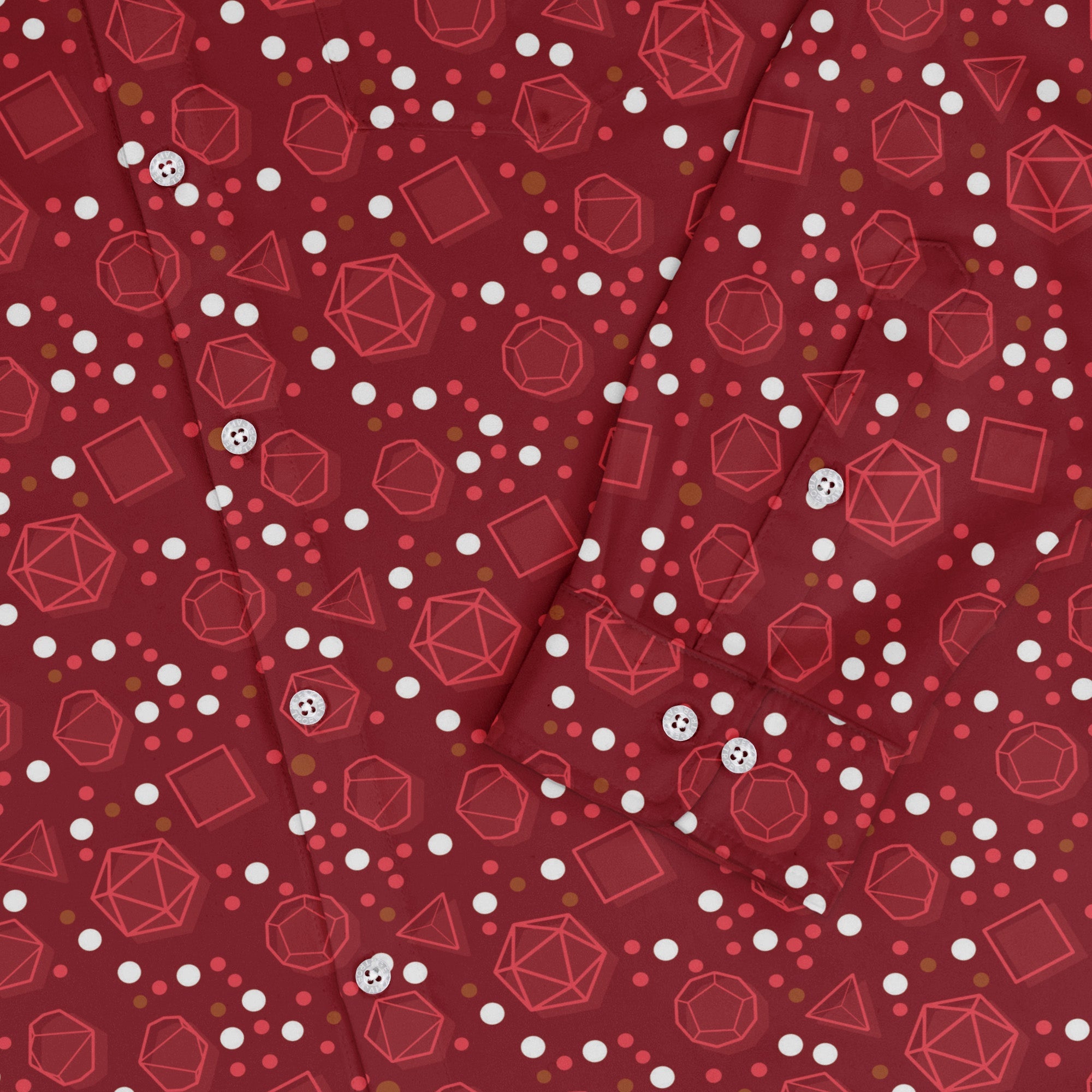 Bring campaign energy to your everyday with the Dnd Red Dice Sets Long Sleeve Button Up Shirt. Designed by Heather Davenport, it scatters bold red polyhedral dice across a crisp long-sleeve button-up, with the print aligning cleanly over the placket and chest pocket. Soft and easy for all-day wear, it’s printed with eco-conscious inks and cut in a relaxed, confident silhouette made for gamers with style.