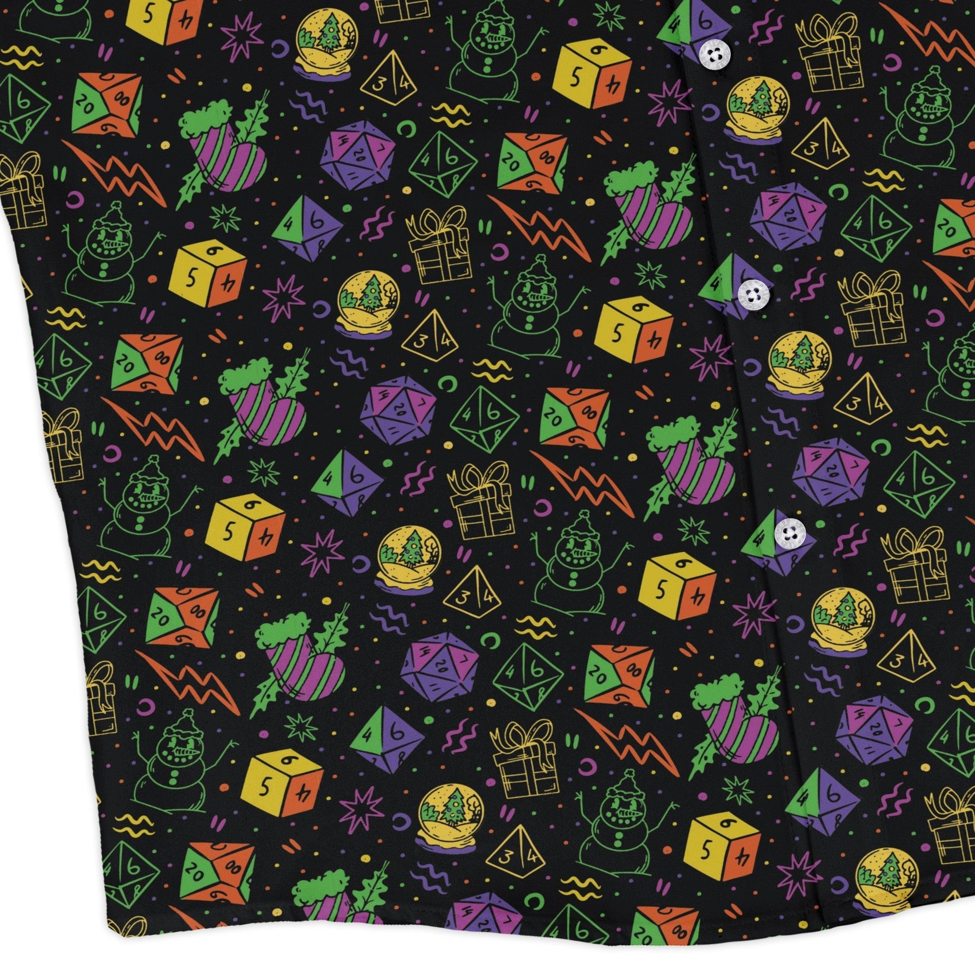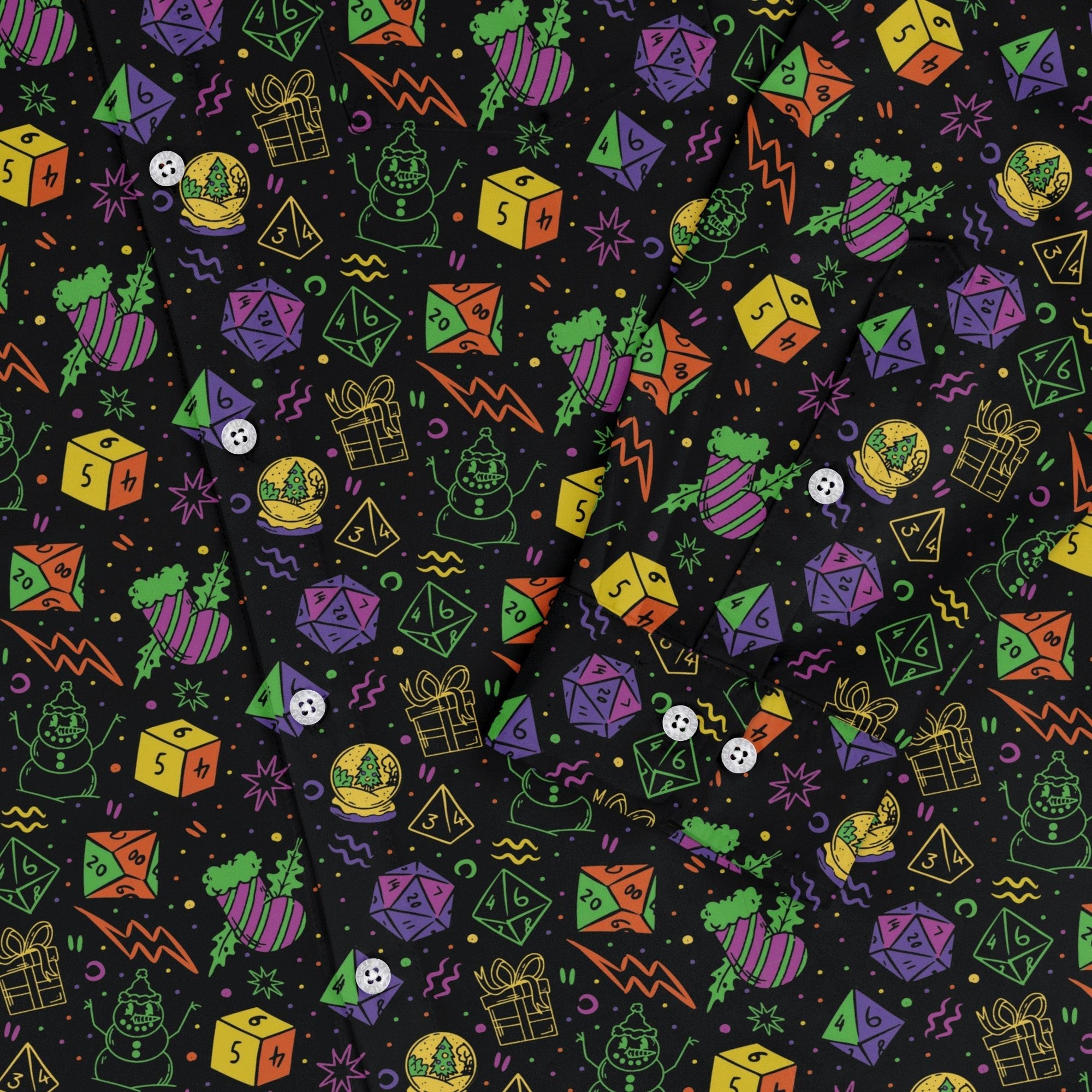 Meet the Dnd RPG Christmas Black Long Sleeve Button Up Shirt — your stealthy holiday uniform for dungeon crawls and office parties alike. A deep-black canvas carries an all-over Christmas RPG pattern in crisp reds, greens, and snowy whites, with the design flowing cleanly across the placket and pocket. Soft, breathable, quest-ready comfort with an easy, relaxed drape. Printed with eco‑minded inks and powered by licensed artists.