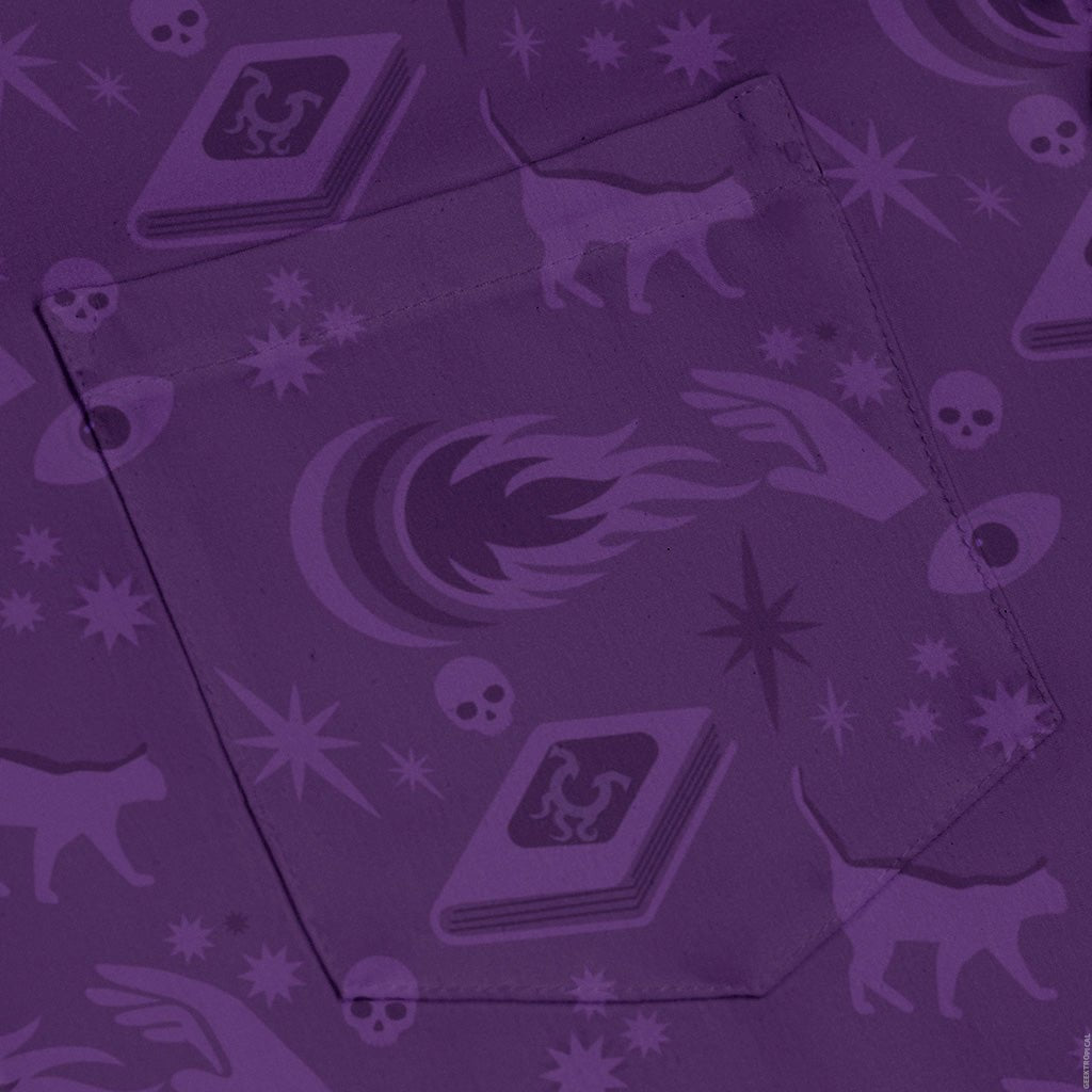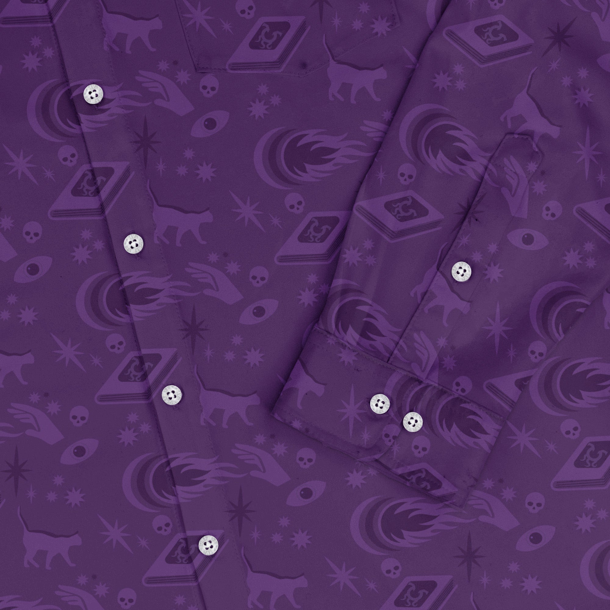 Level up your weekday to raid-night with the Dnd Warlock Class Long Sleeve Button Up Shirt. An all-over warlock-themed pattern wraps the shirt in arcane flair, expertly aligned across the placket and pocket for a clean, continuous look. The fit rides the line between relaxed and sharp, with neat cuffs and branded buttons. Designed by Heather Davenport and printed with eco-conscious inks to support licensed artists.