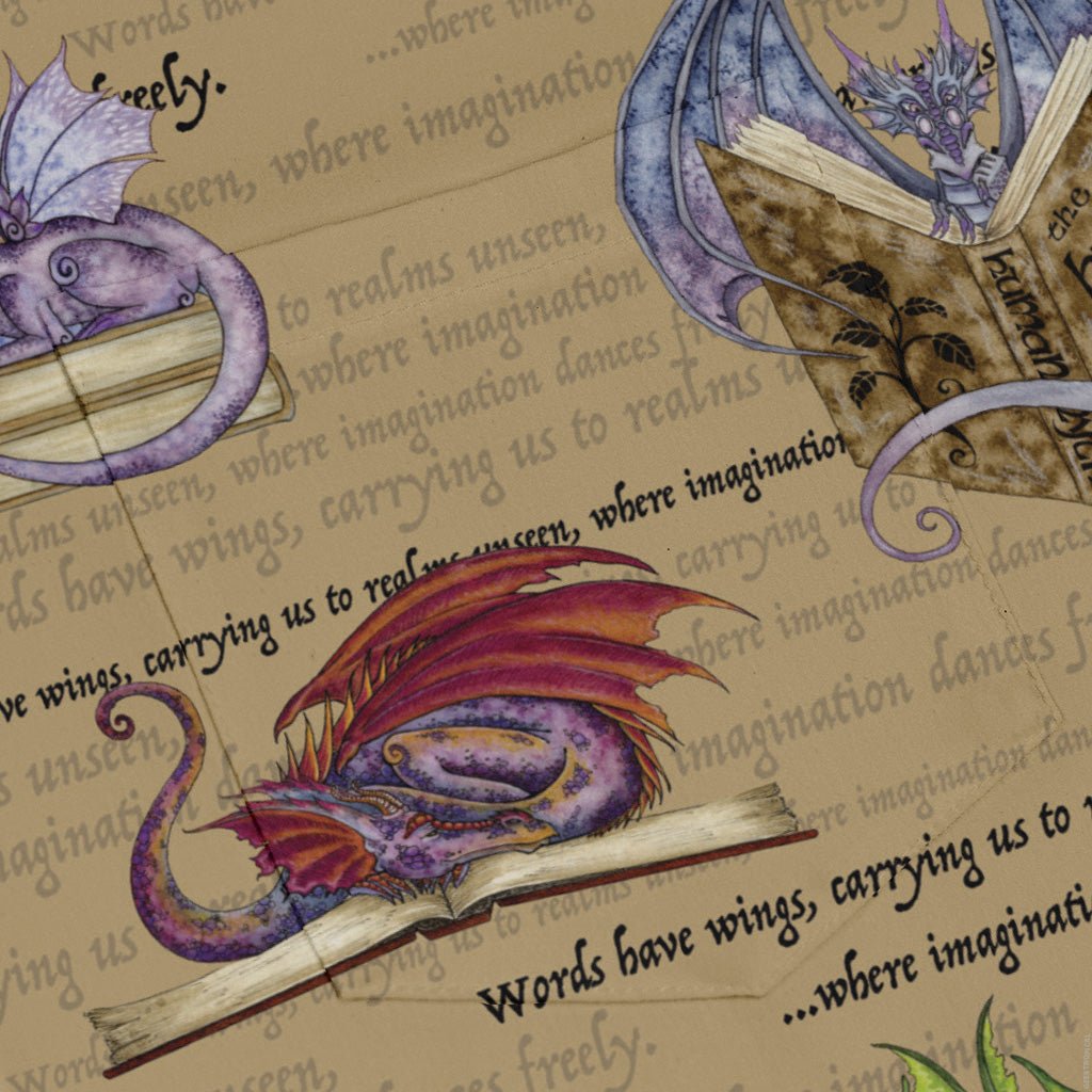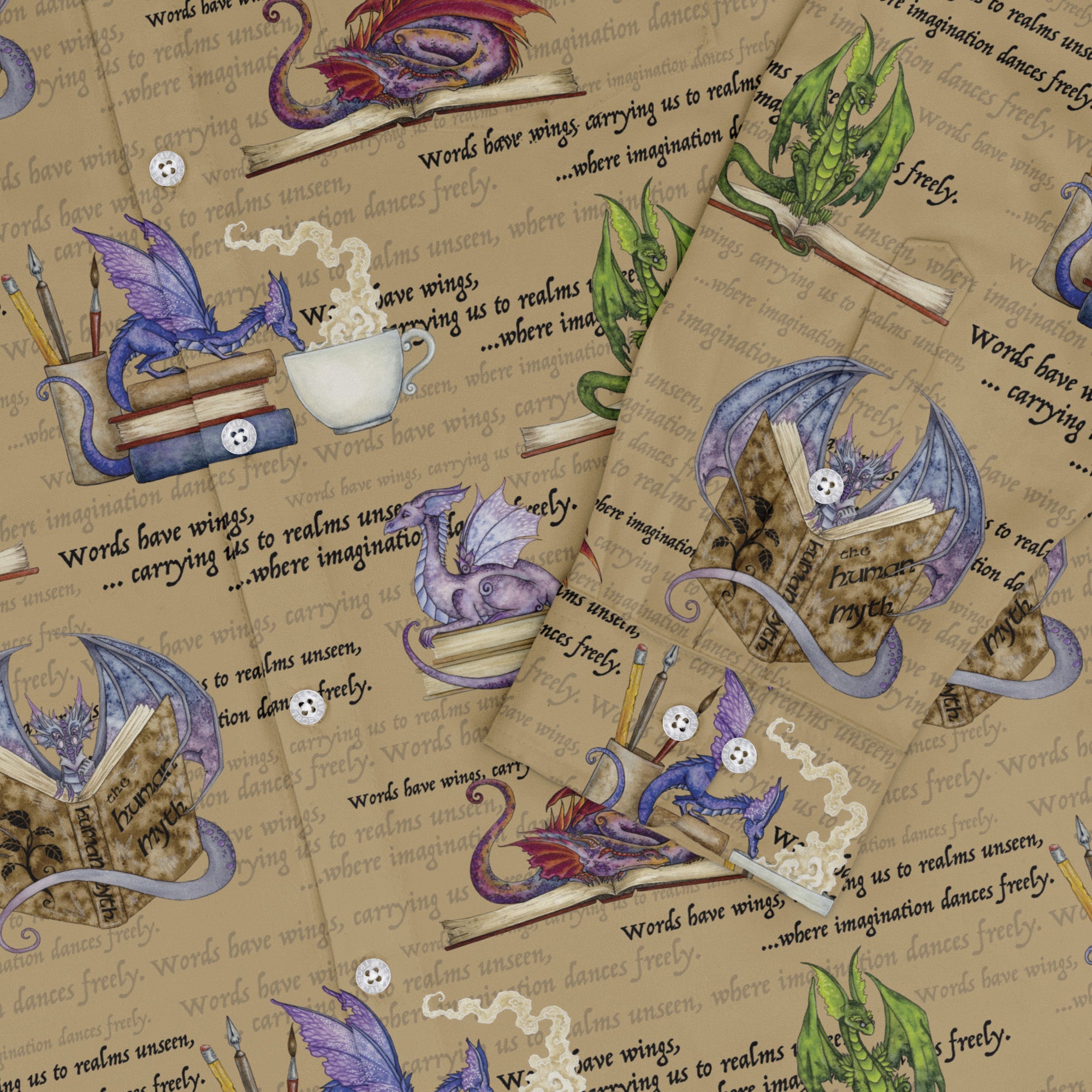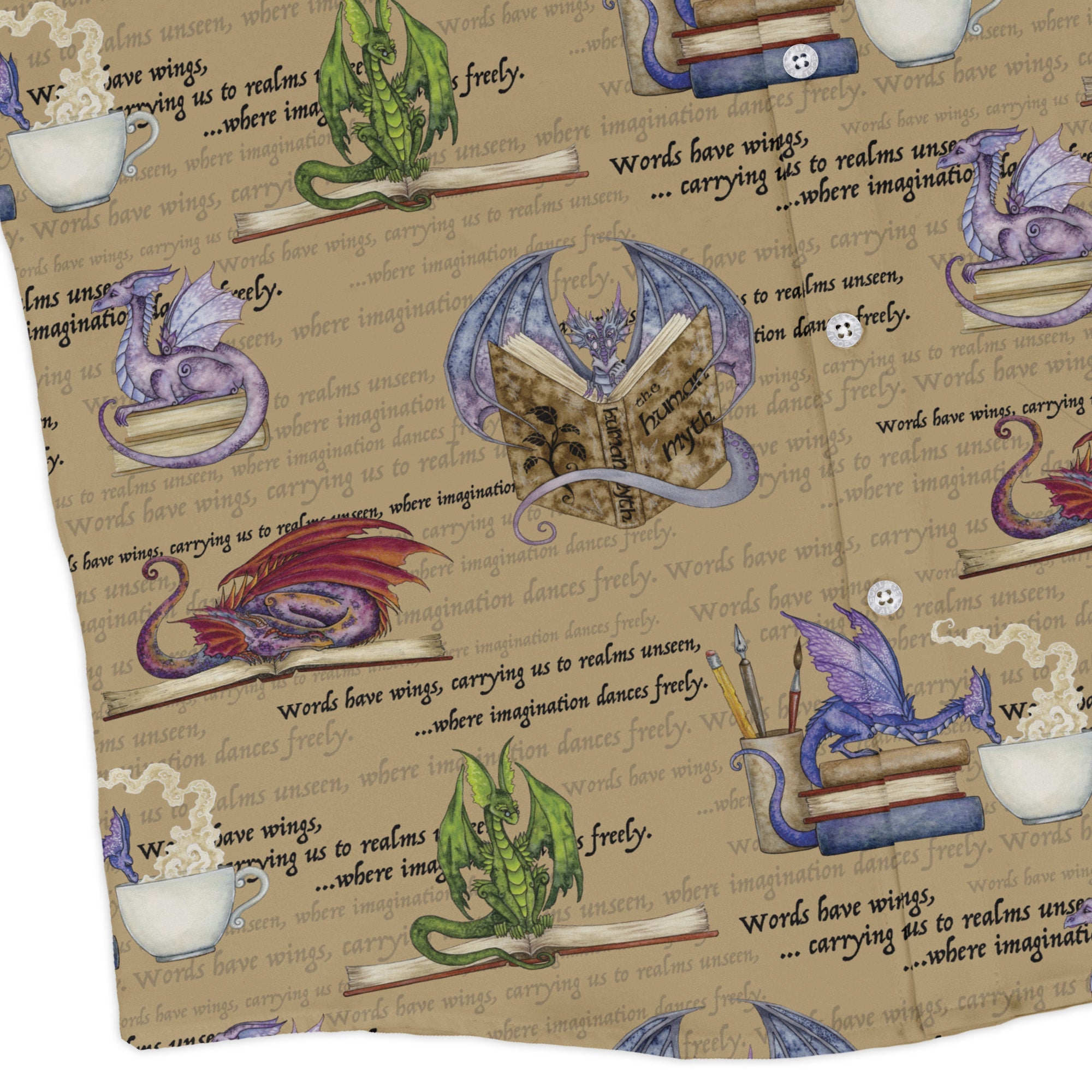 The Dragon Bookworm Long Sleeve Button Up Shirt celebrates the scholar side of fantasy fandom with official artwork by Amy Brown. A dragon presides over bookish motifs in an all-over print that lines up cleanly across the front and pocket for a seamless look. Smooth comfort meets crisp buttons and long sleeves made for layering. Printed with eco‑conscious inks, this artist-backed piece levels up office days, con halls, and late-night Dnd reads.