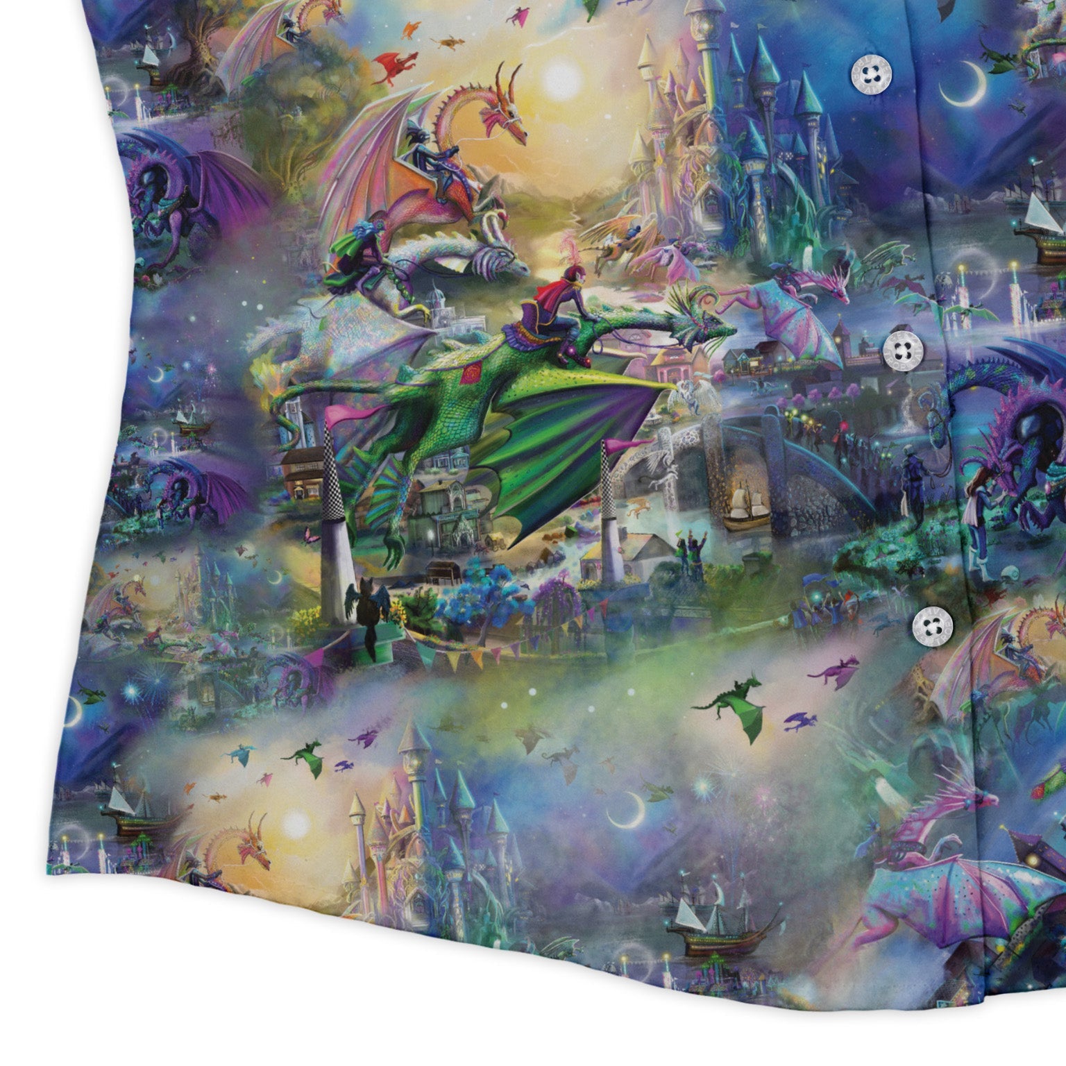 Dragon Chase Curvy Button Up Shirt turns myth into motion: sinuous dragons weave and wheel in hot pursuit across a maximalist all-over print, seamlessly flowing over the placket and pocket. Designed by Rose Khan, this women’s cut follows your curves with a clean, untucked-friendly silhouette and adjustable sleeves for dialed-in comfort. Lightweight and soft for all-day wear, printed with eco-conscious inks, and every purchase supports the artist.