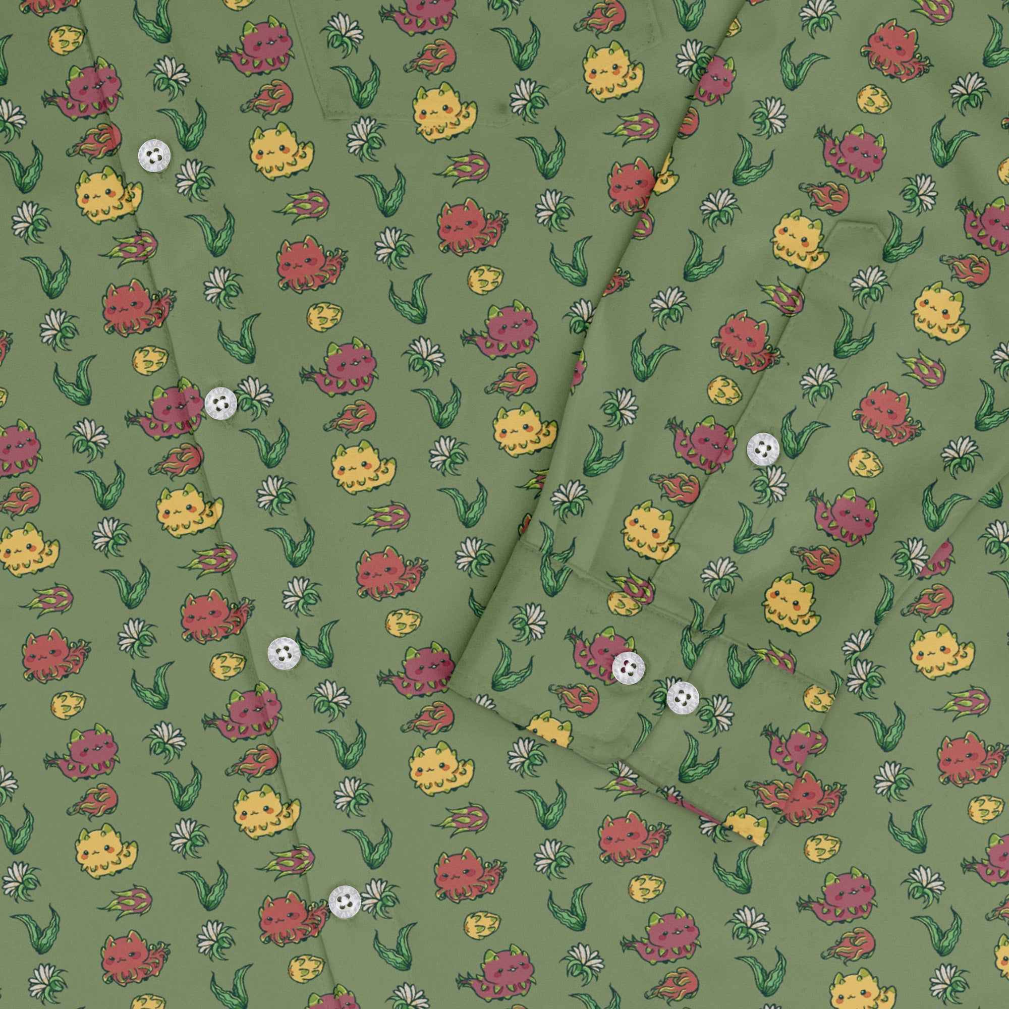Meet the Dragon Fruit Green Long Sleeve Button Up Shirt, a vibrant tropical flex that levels up your fit without trying too hard. Juicy dragon fruit slices—pink rinds and speckled centers—pop against a fresh green field, with the print aligning cleanly across the chest and pocket. Designed by Ardi Tong, printed with eco-conscious inks, and artist-backed. Perfect for cons, casual Fridays, and every nerdy night out.