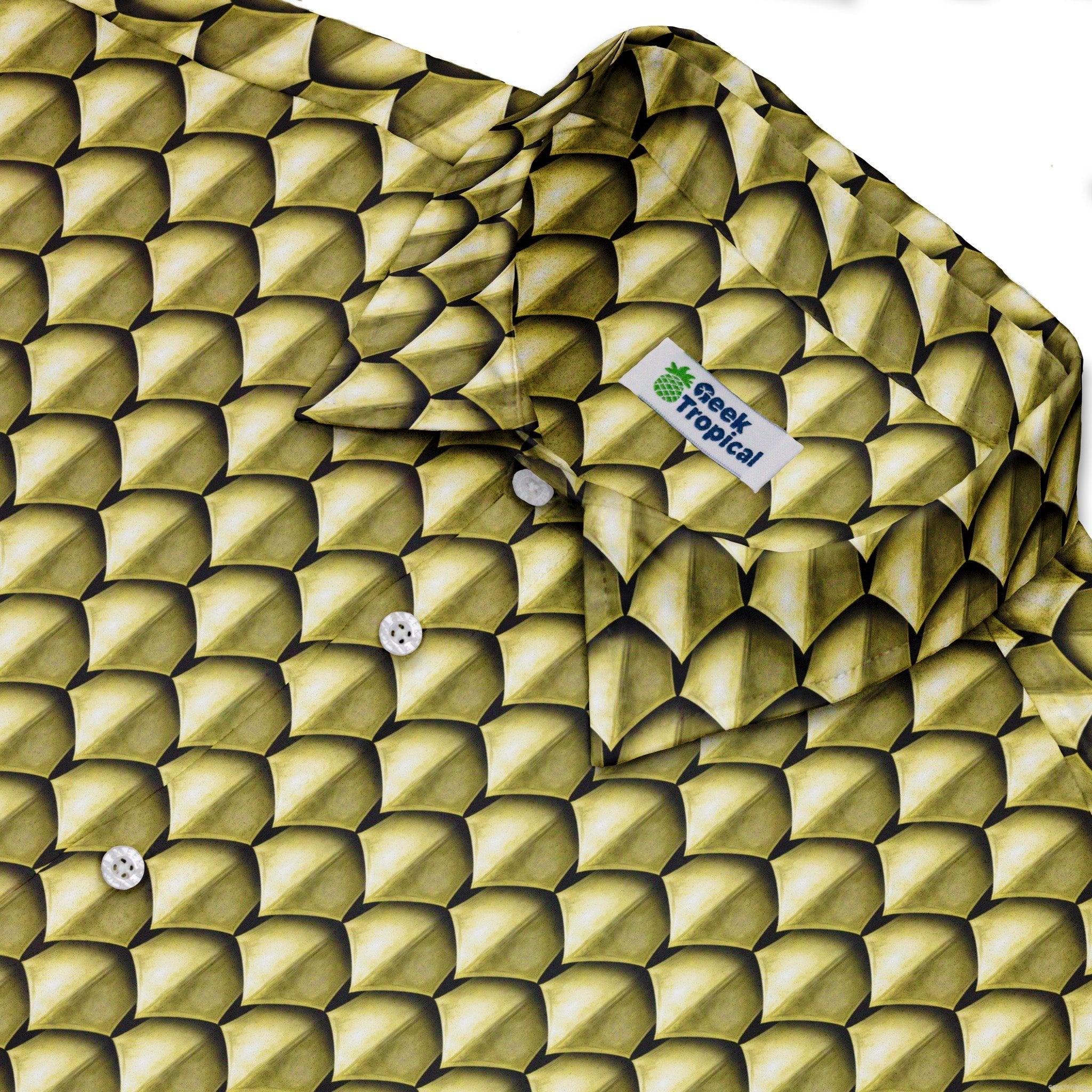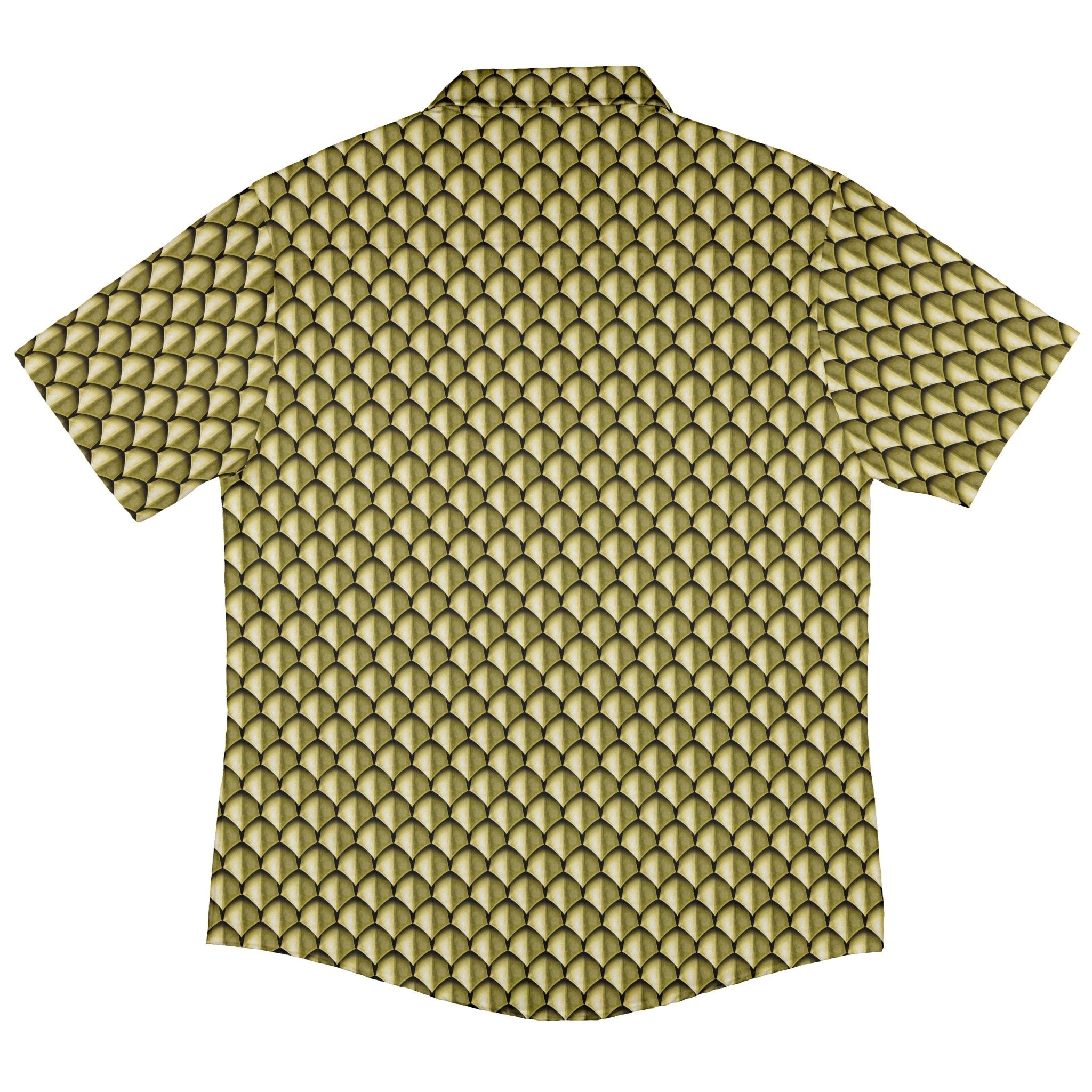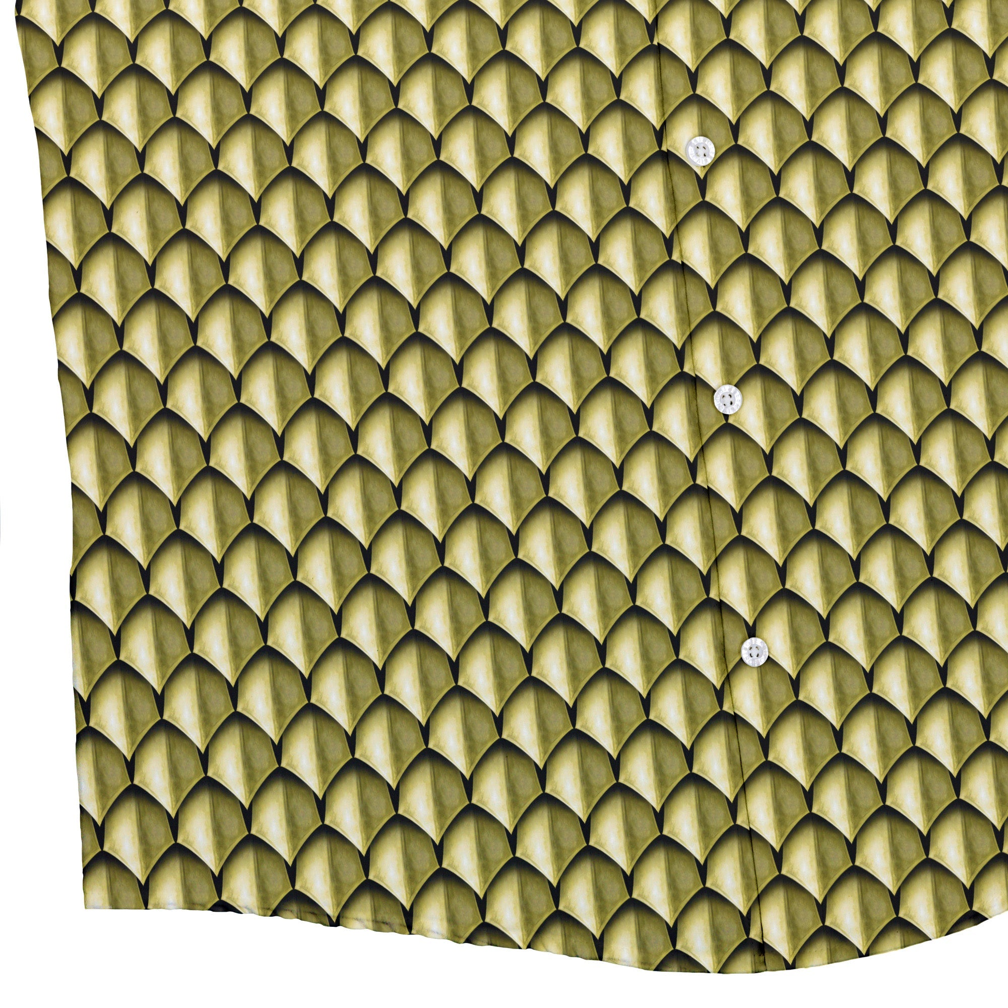Meet the Dragon Scales Gold Dnd Button Up Shirt, forged for fans who like their style gleaming. A field of overlapping gold scales—shadowed in charcoal, tipped with warm highlights—wraps the shirt with a smooth, continuous flow across the front. It feels easy from game night to beach day and dresses up without losing nerd cred. Designed by Nathan and artist-backed, it turns your outfit into a dragon’s hoard.