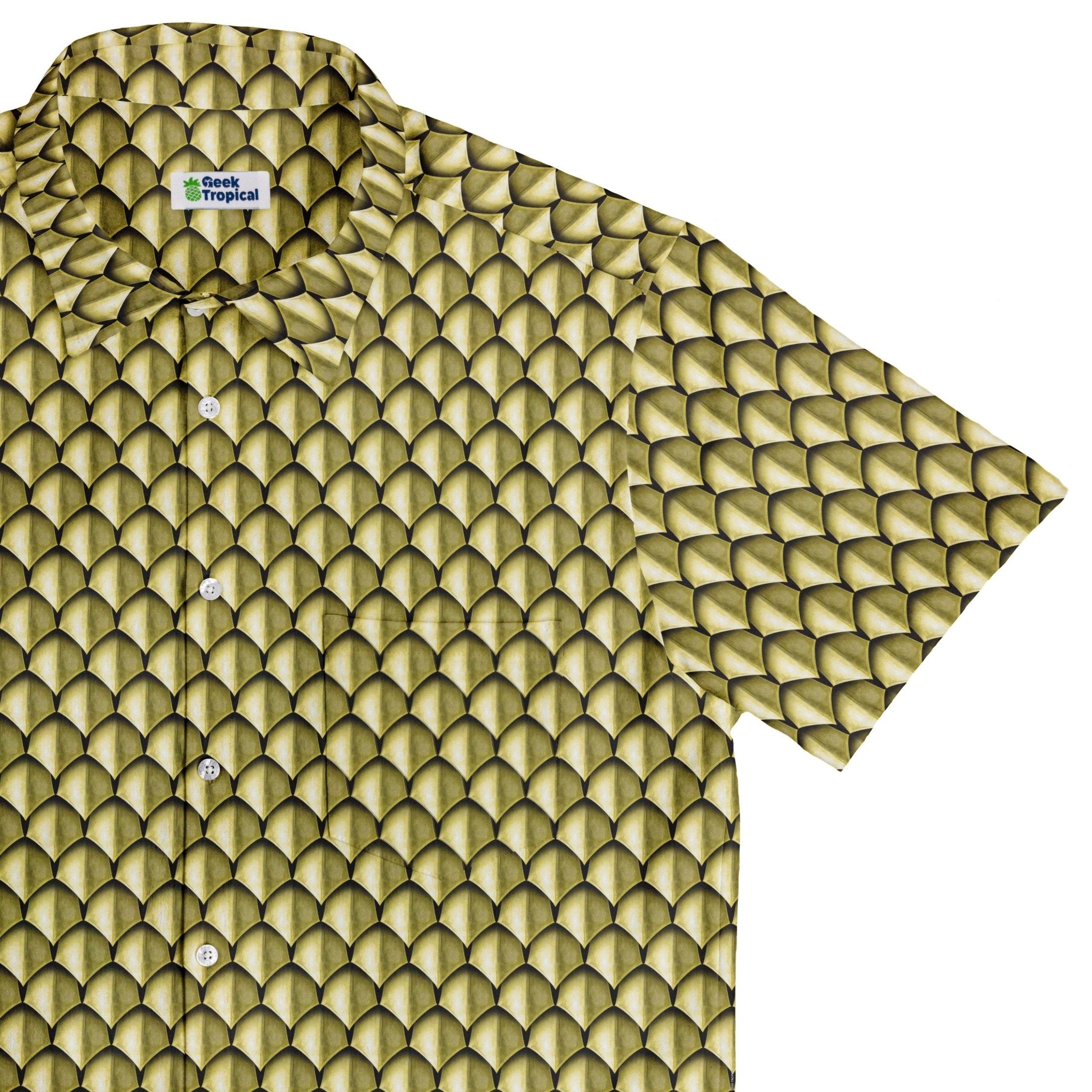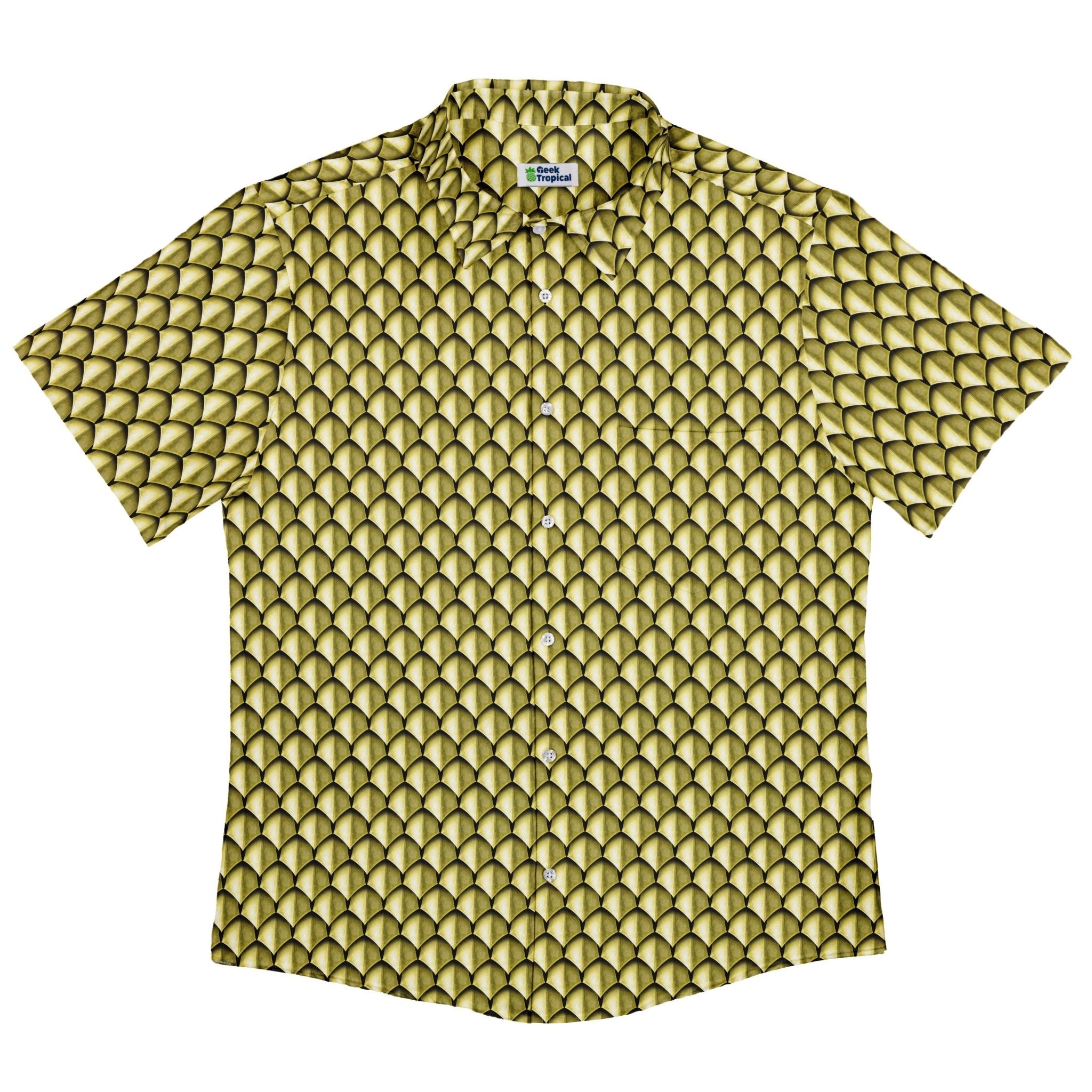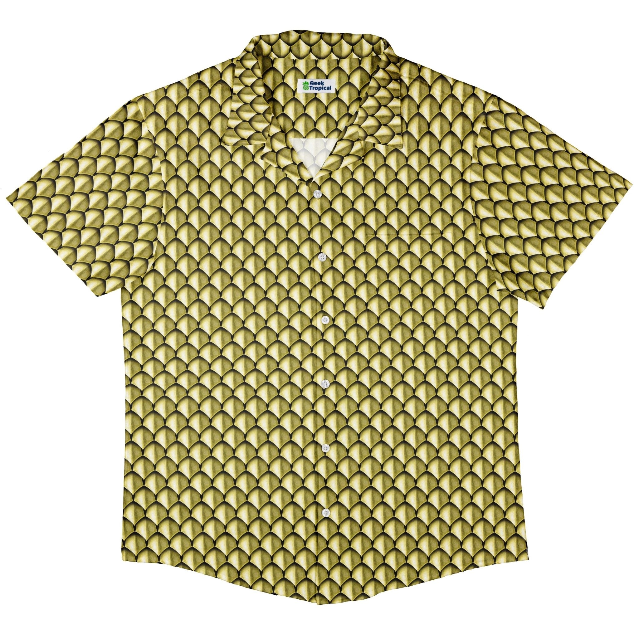 Meet the Dragon Scales Gold Dnd Button Up Shirt, forged for fans who like their style gleaming. A field of overlapping gold scales—shadowed in charcoal, tipped with warm highlights—wraps the shirt with a smooth, continuous flow across the front. It feels easy from game night to beach day and dresses up without losing nerd cred. Designed by Nathan and artist-backed, it turns your outfit into a dragon’s hoard.