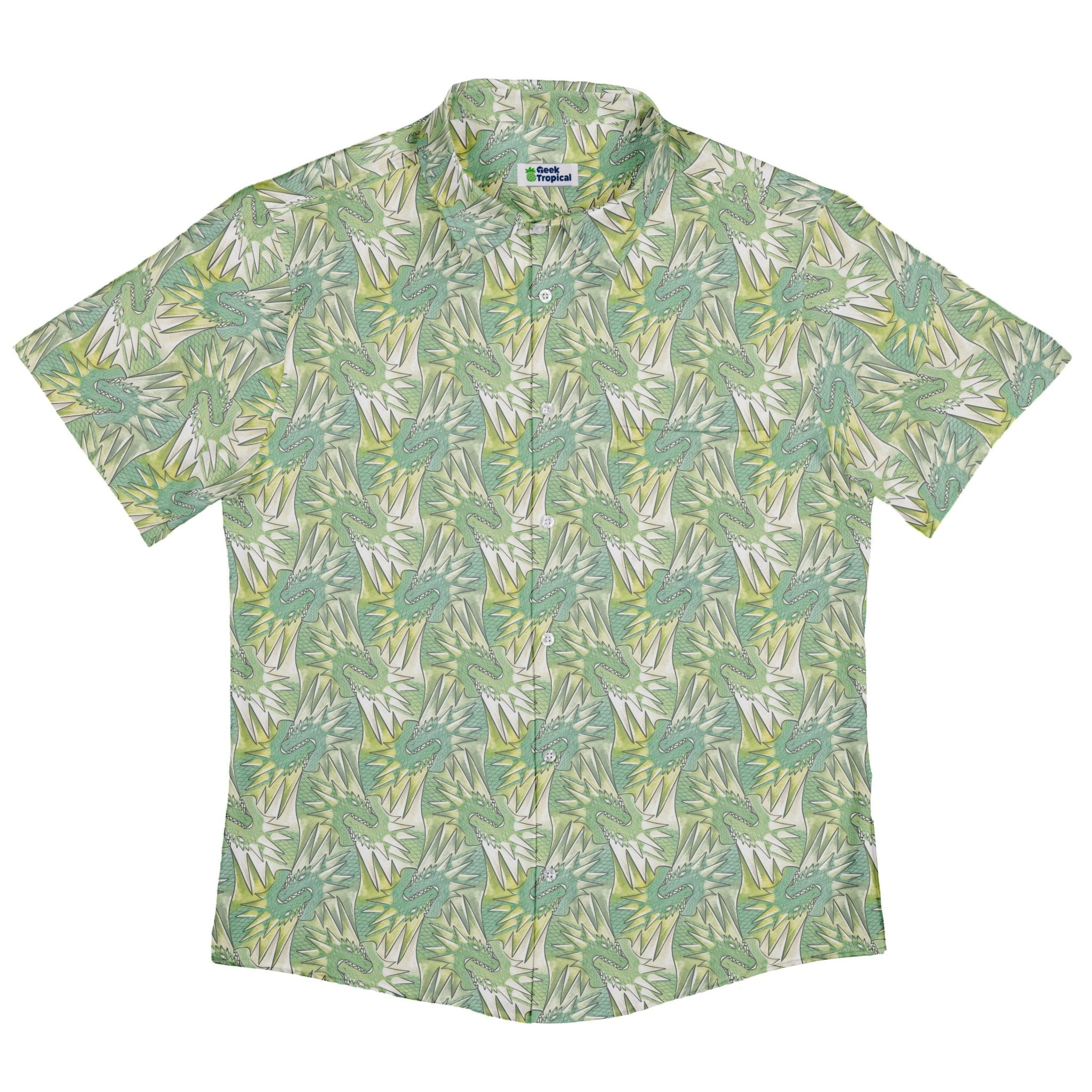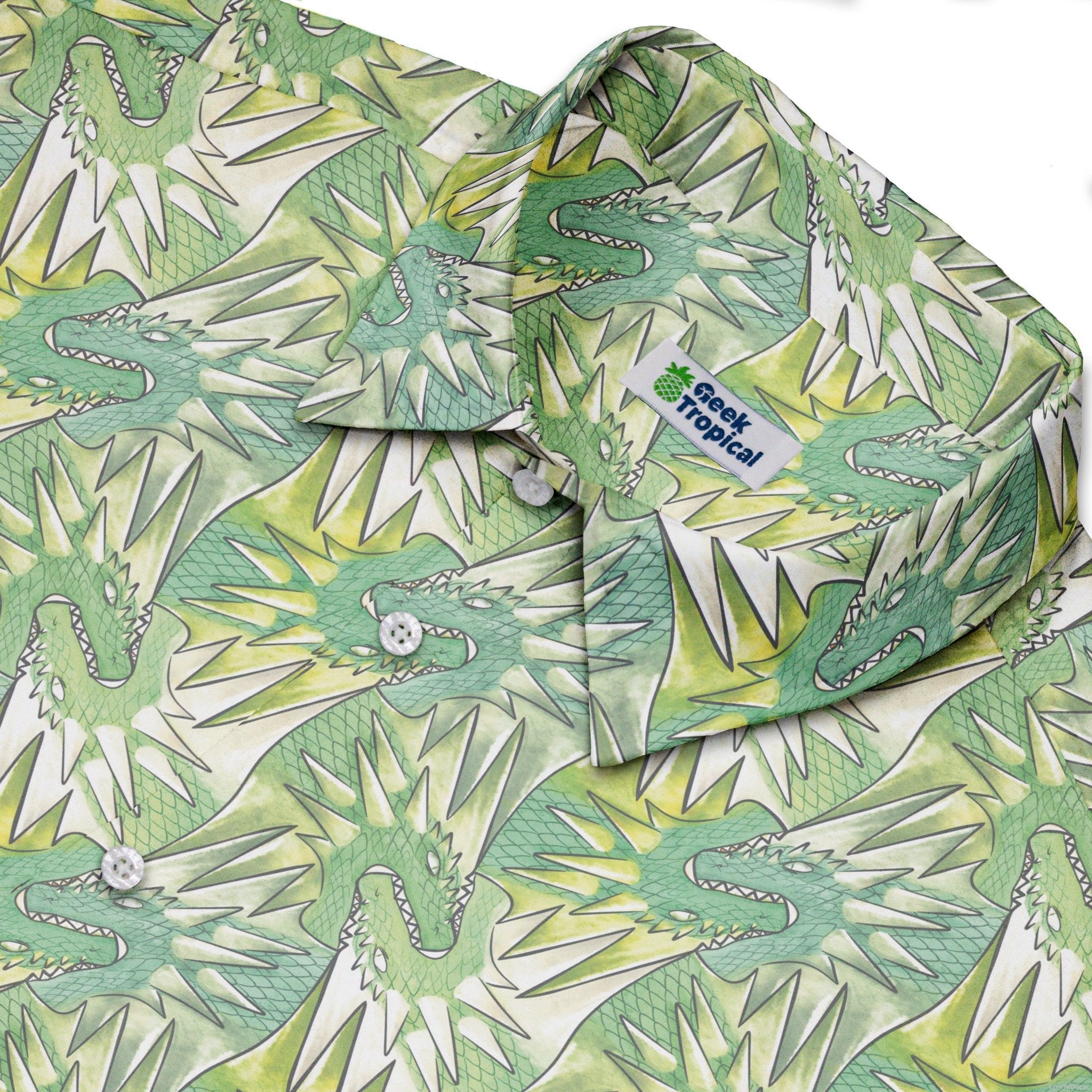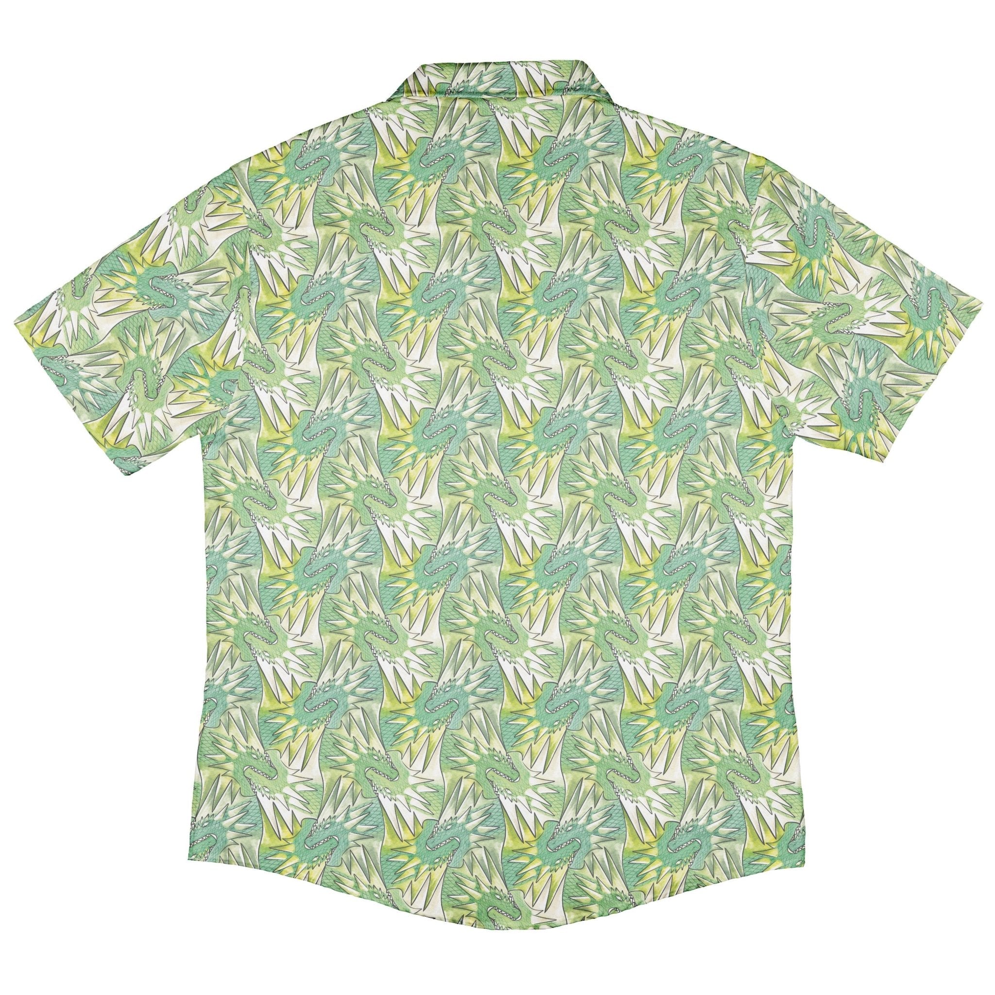 The Dragon Weaving Inferno Lime Button Up Shirt turns fantasy into daily armor. On a blazing lime field, sinuous dragons weave like living ribbons, glinting with ember-to-crimson gradients, fine scale linework, and smoky curls. The pattern continues cleanly across the placket and pocket for a seamless front. Designed by Nathan and printed with eco‑conscious inks, it brings bold, geeky heat to any scene.