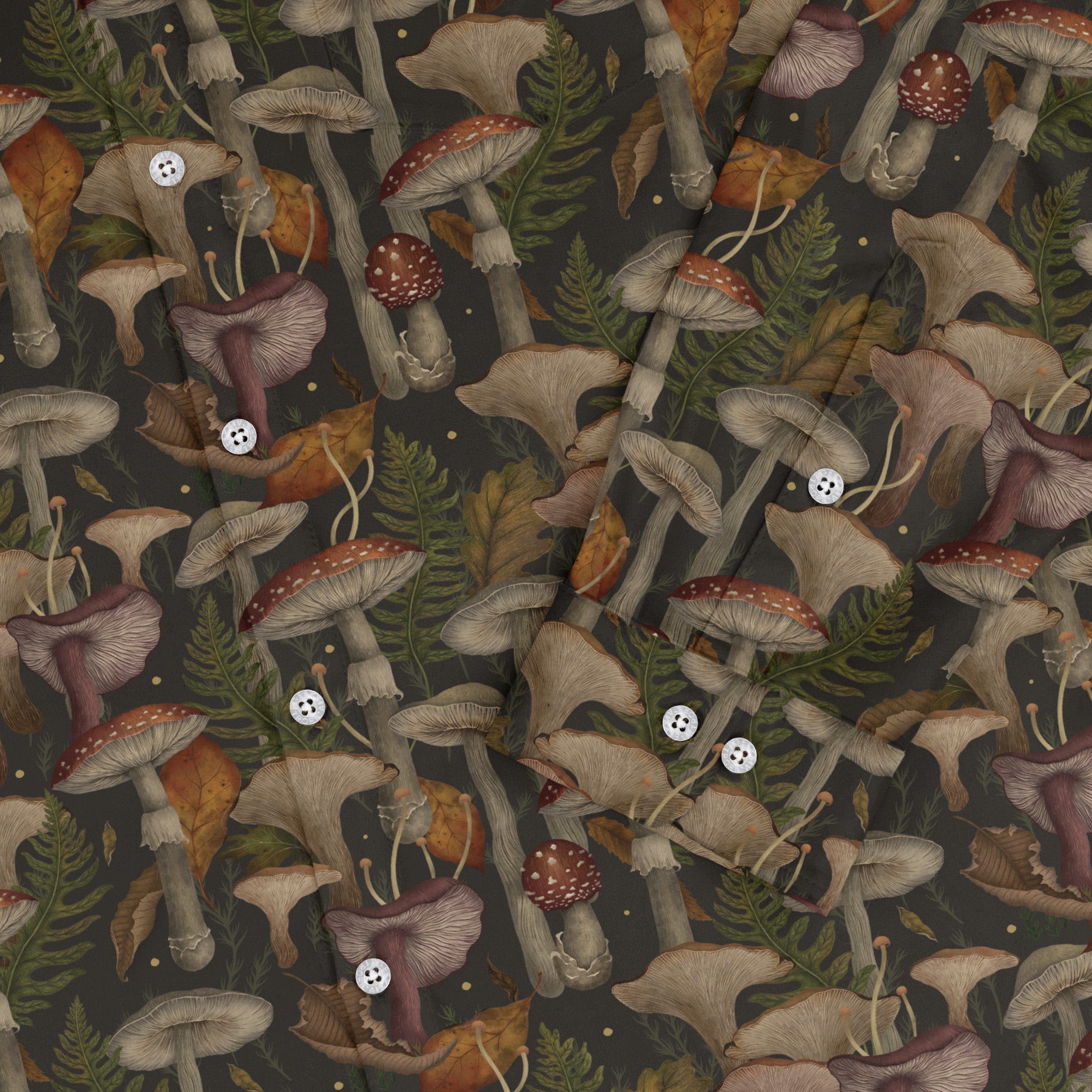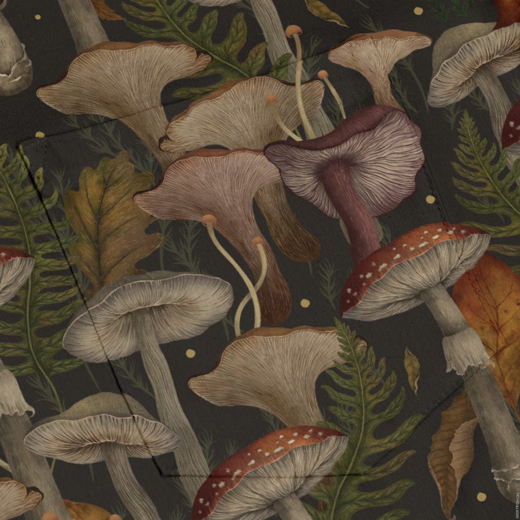 Episodic Autumn Mushroom Collage Long Sleeve Button Up Shirt is a love letter to fall for the mushroom-curious. Designed by Episodic, the print stacks hand-drawn caps and stems in warm russet, ochre, and moss tones over a deep backdrop, creating a smart, botanical vibe. Artist-backed and delightfully geeky, it levels up casual days and sharpens nights out—perfect for leaf-crunching walks and post-quest hangouts.
