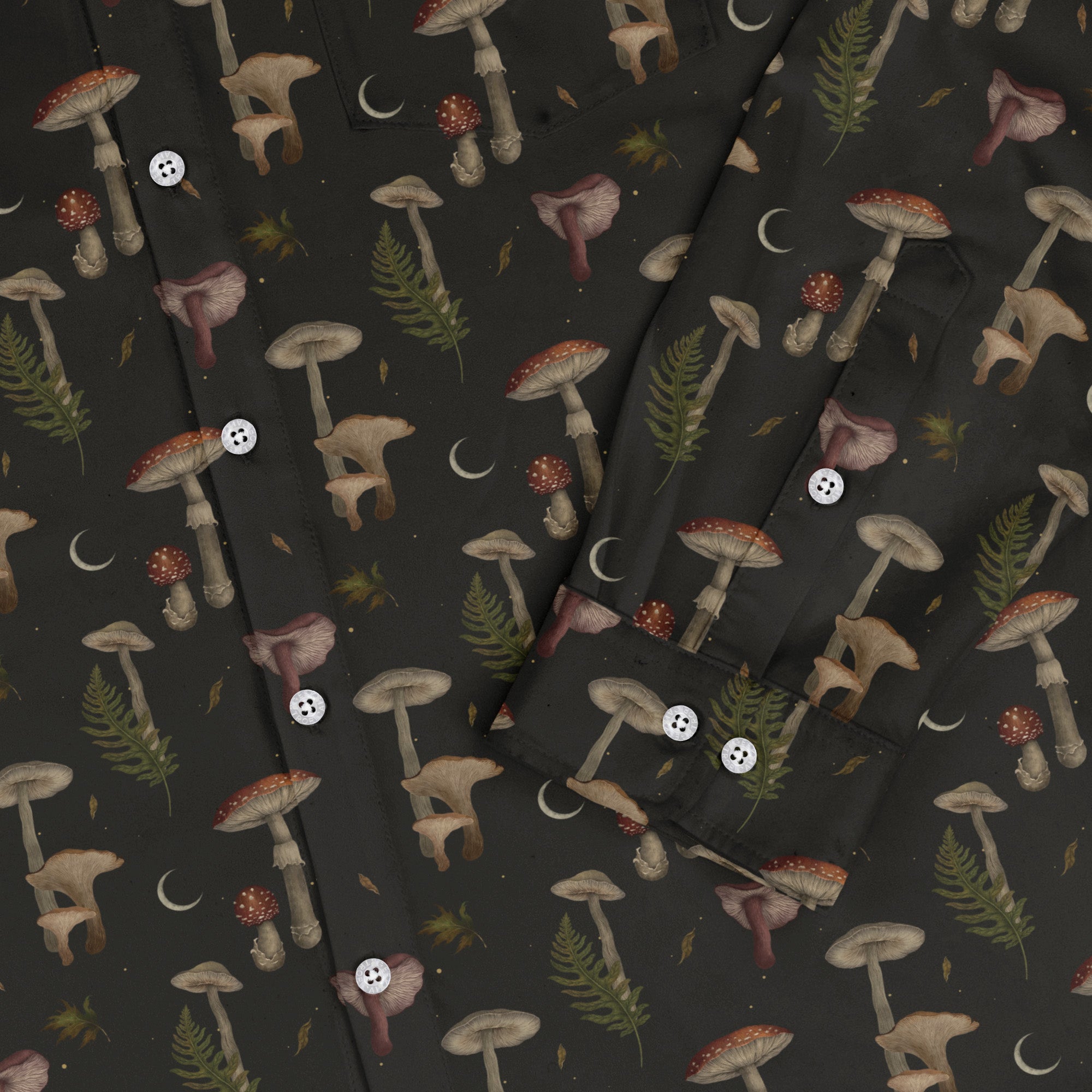 The Episodic Autumn Mushrooms Space Long Sleeve Button Up Shirt sends your wardrobe on a myco-cosmic mission. A canopy of fall-toned fungi drifts across a deep, star-sprinkled sky, with artwork by Episodic. Crisp collar and long sleeves balance the playful print, while the chest pocket lines up neatly so the scene flows right through. Printed with eco-conscious inks and every purchase supports the artist—because style should be smart as well as stellar.