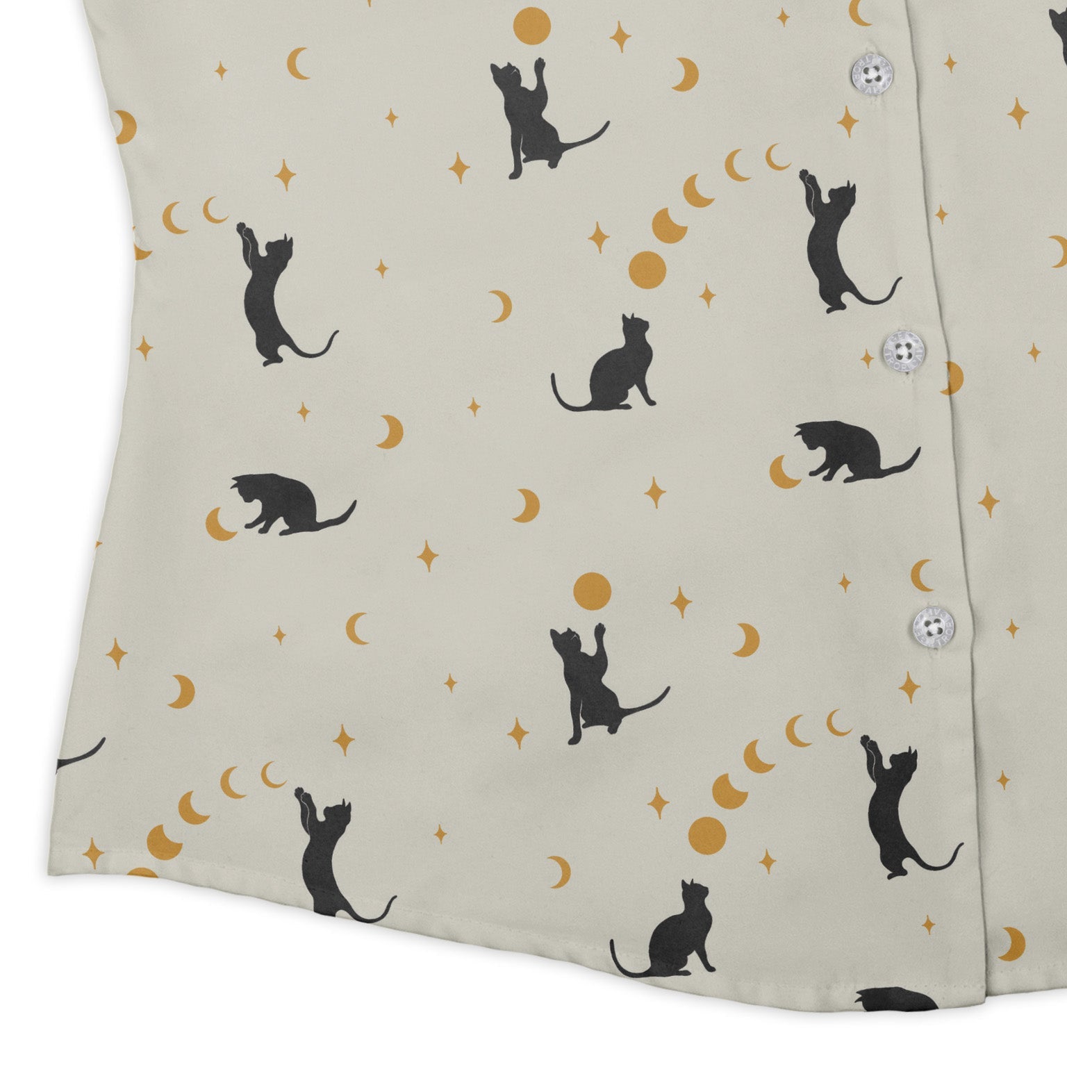 Meet the Episodic cat catching the moon Curvy Button Up Shirt, where night-sky whimsy meets a curve-loving silhouette. A curious cat reaches toward a luminous moon across a deep, star-sprinkled backdrop, with artwork by Episodic flowing cleanly across the pocket for a seamless look. Soft, breathable, and polished whether tucked or not, with sleeves you can wear fitted or relaxed. Artist-backed and sustainably printed.