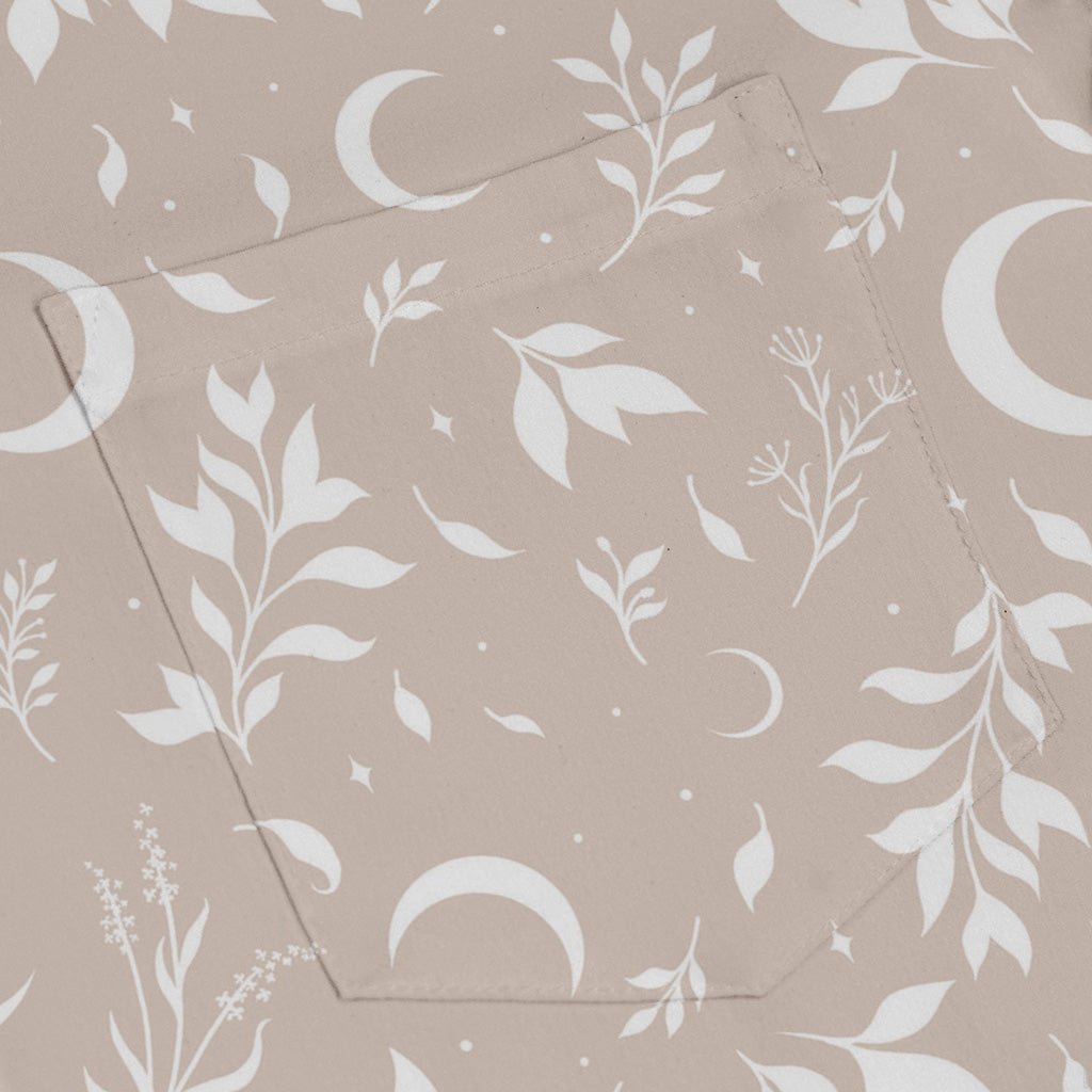 Meet the Episodic crescent moon garden biege Long Sleeve Button Up Shirt, a lunar-botany crossover for your everyday quests. On a warm beige canvas, crescent moons drift among delicate leaves and garden sprigs in crisp linework. The pocket and panels flow seamlessly across the print. Designed by Episodic with eco-conscious inks, it brings an easy, laid-back vibe—and every purchase helps support the artist.