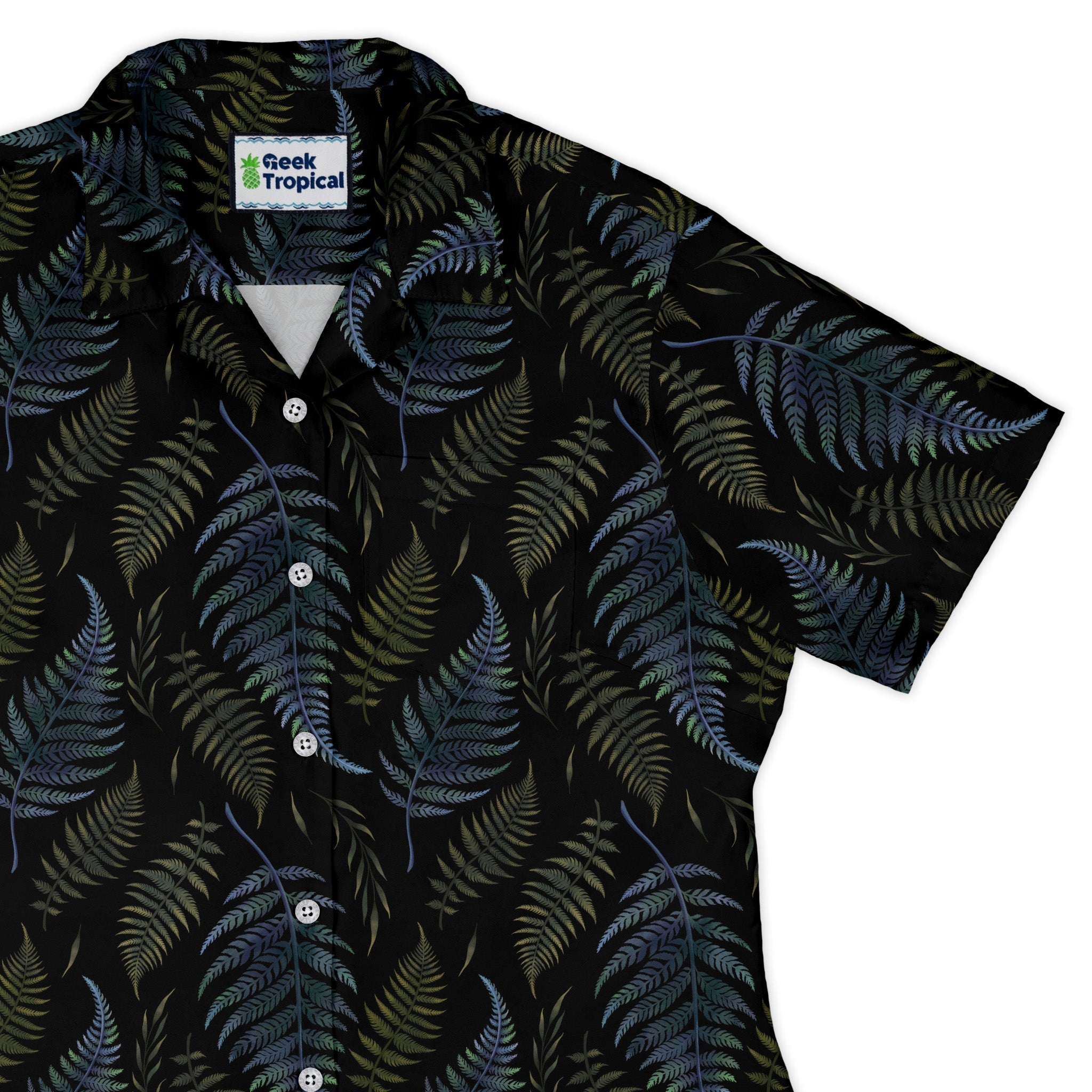 The Episodic Ferns Curvy Button Up Shirt brings lush botany to your wardrobe with a field-guide pattern of layered fronds in rich greens over a deep charcoal ground. Designed by Episodic, it reads smart and serene—a geeky nod to plant lovers. The curve-loving cut skims just right, and a rounded hem keeps it polished untucked. Finished with crisp buttons, and every purchase supports the artist behind the print.
