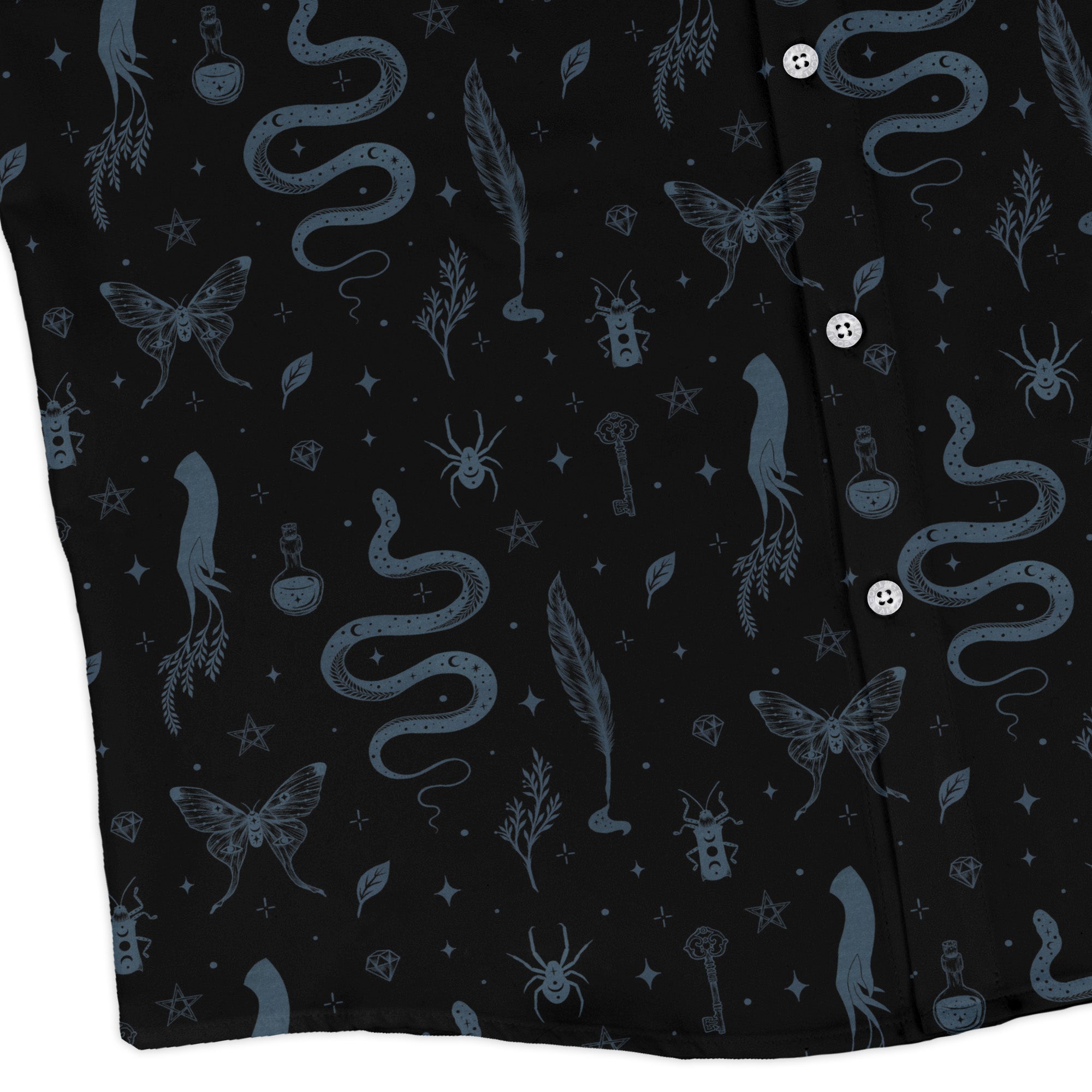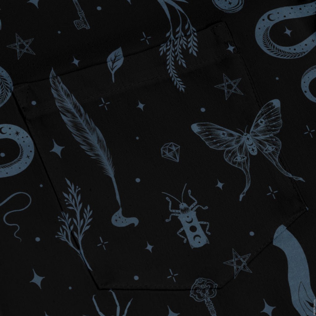 The Episodic Mystical Collection Black Long Sleeve Button Up Shirt blends botany and fantasy on a deep-black canvas, with crisp foliage and arcane linework in a sleek, all-over print. Designed by Episodic, the artwork aligns across the front and pocket for satisfying symmetry. Smart enough for meetings, nerdy enough for campaigns, and printed with eco-conscious inks—your purchase also puts real support behind the licensed artist.