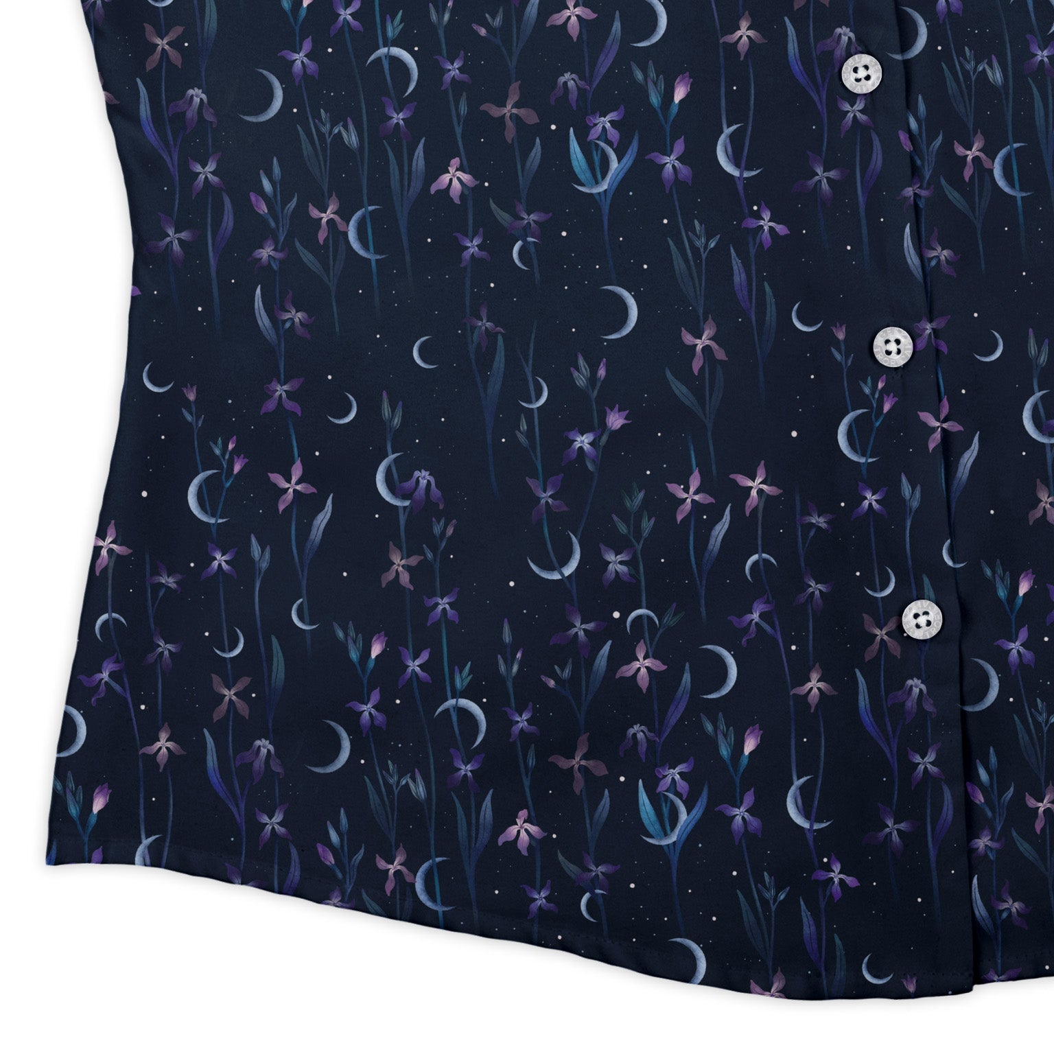 Episodic Scented Moonlight Curvy Button Up Shirt merges stargazer energy with botanical charm, designed by Episodic. Astronauts float across a twilight field of stars and moons, woven with delicate leaves and blooms, all rendered in crisp, high-contrast art. A curvy, polished cut keeps the print flowing cleanly—even over the pocket—and eco-conscious inks let the colors glow. Ready for jeans, ready for orbit.