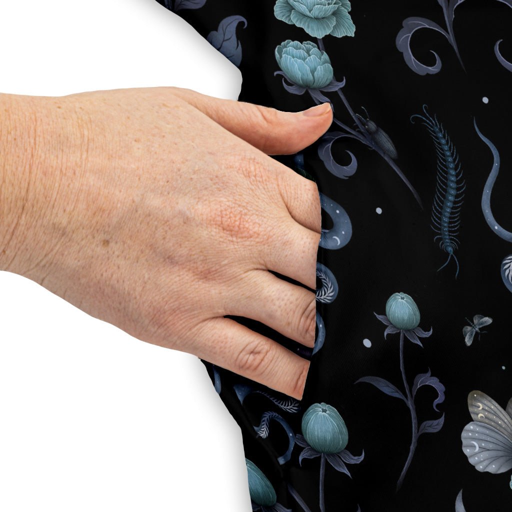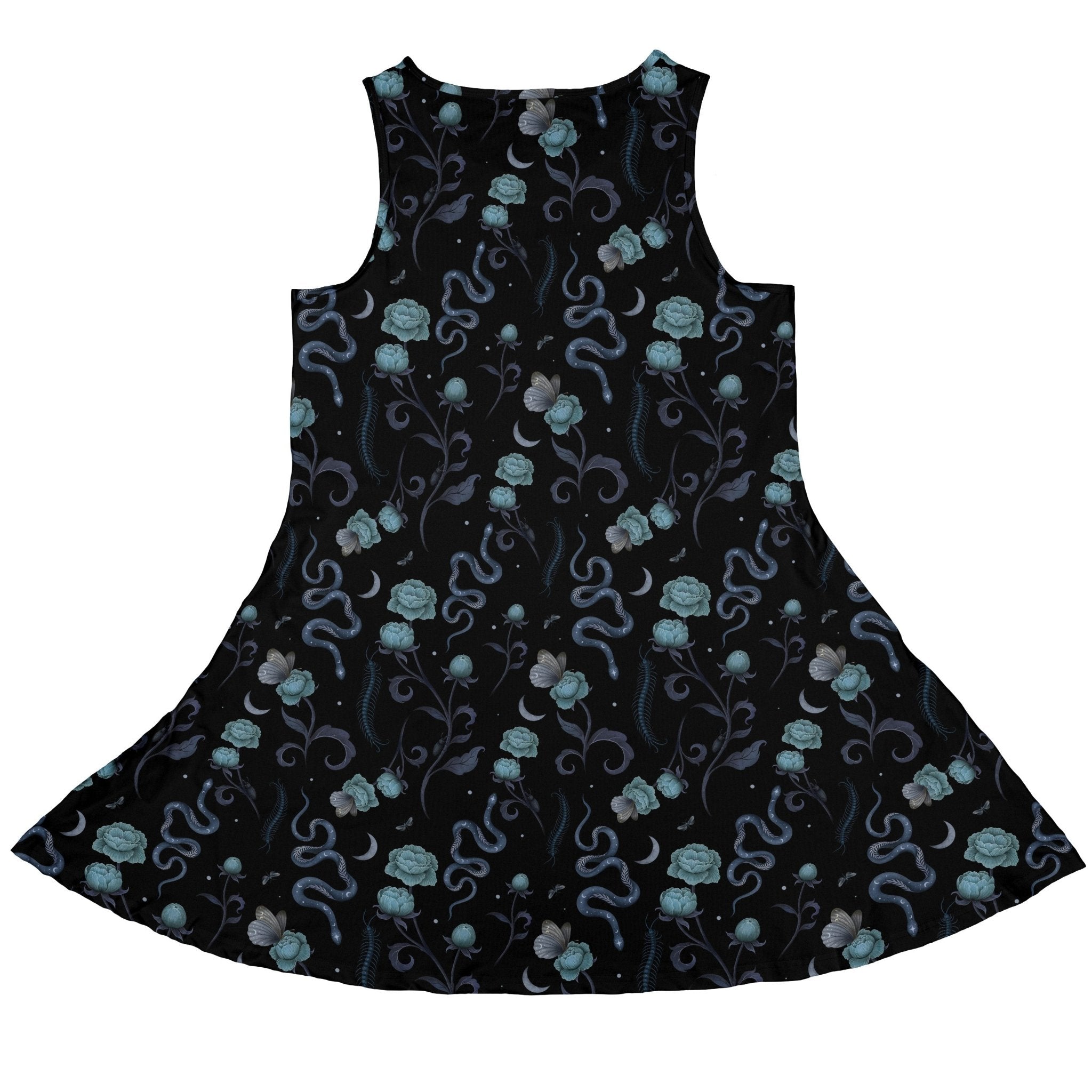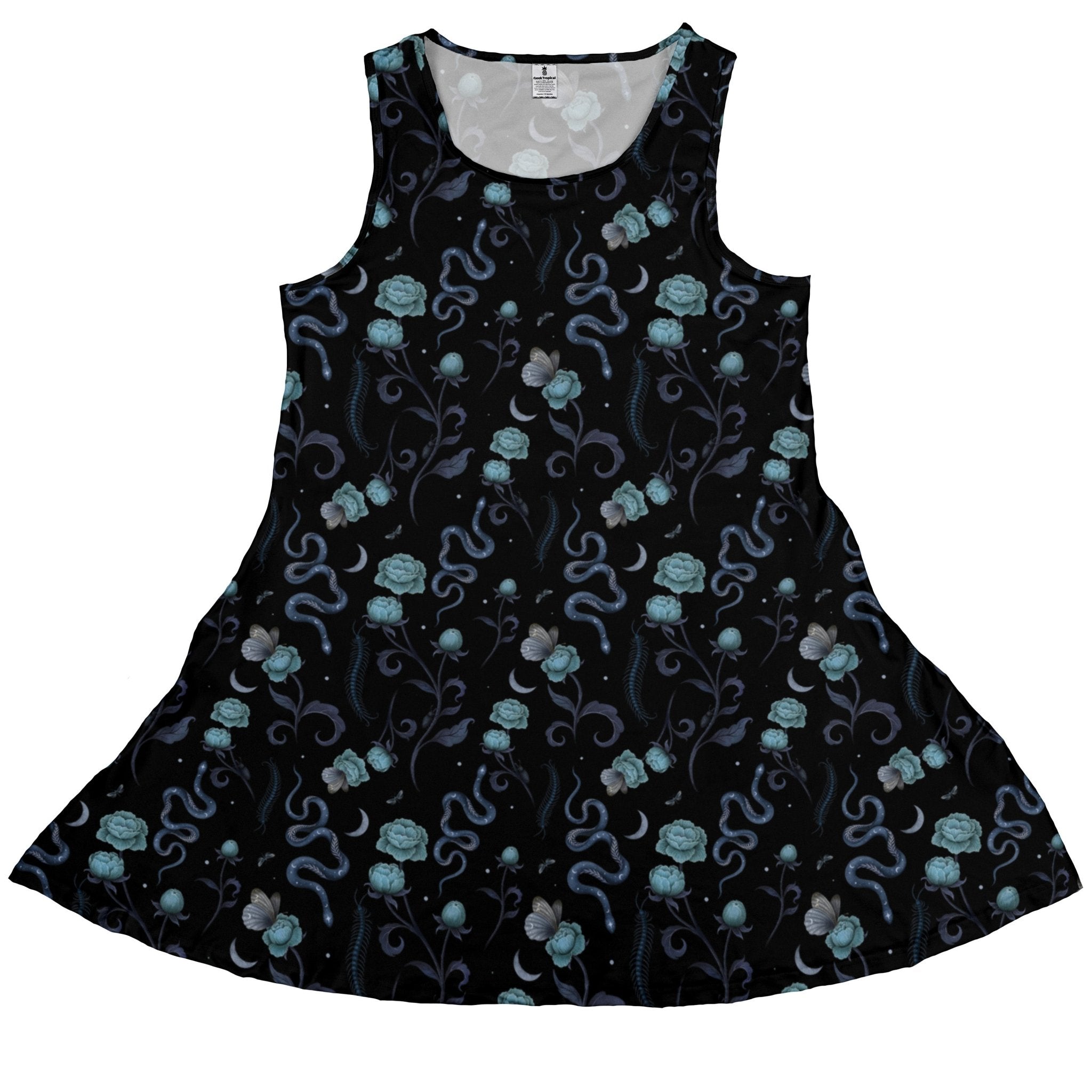 Step into cosmic botanica with the Episodic Serpent Garden Blue Space Dress. A deep-space blue backdrop shimmers with tiny stars as elegant serpents wind through lush leaves and blooms, sketched with crisp, graphic detail. Designed by Episodic, this statement piece pairs nerdy charm with art-house cool—equally at home at game night, a con, or a coffee run. Wear your fandom like a constellation, bold, clever, and beautifully curated.