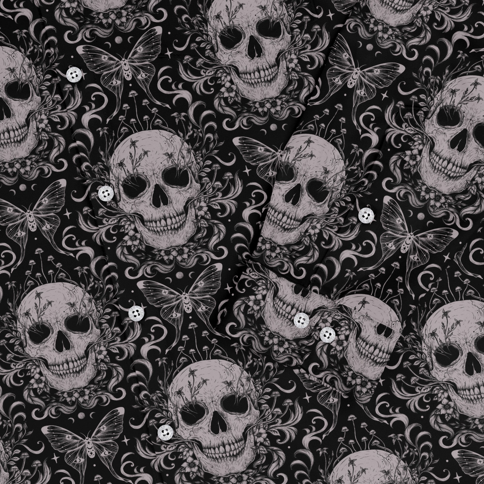 The Episodic Skull Black White Long Sleeve Button Up Shirt is your monochrome power move: an all-over constellation of skulls entwined with leafy botanicals, balanced and bold. Designed by Episodic, the artwork aligns cleanly across the pocket and placket for a seamless look. Soft, lightweight feel and a relaxed, dialed-in fit, with tweakable cuffs for day-to-night quests. Printed with eco-conscious inks, and every purchase backs the artist.