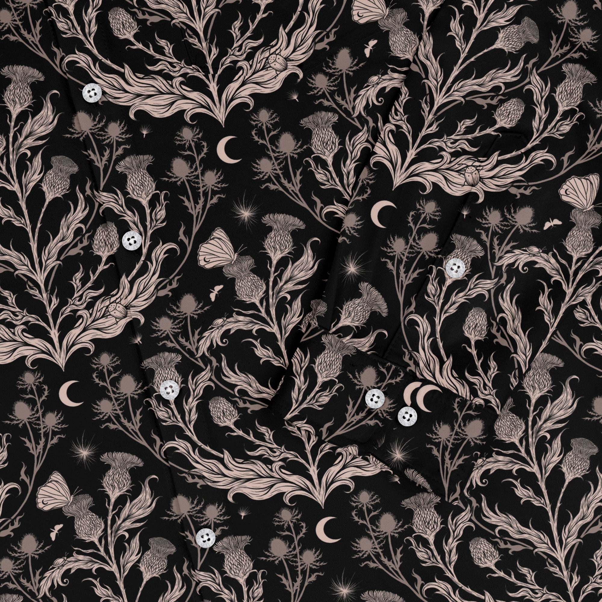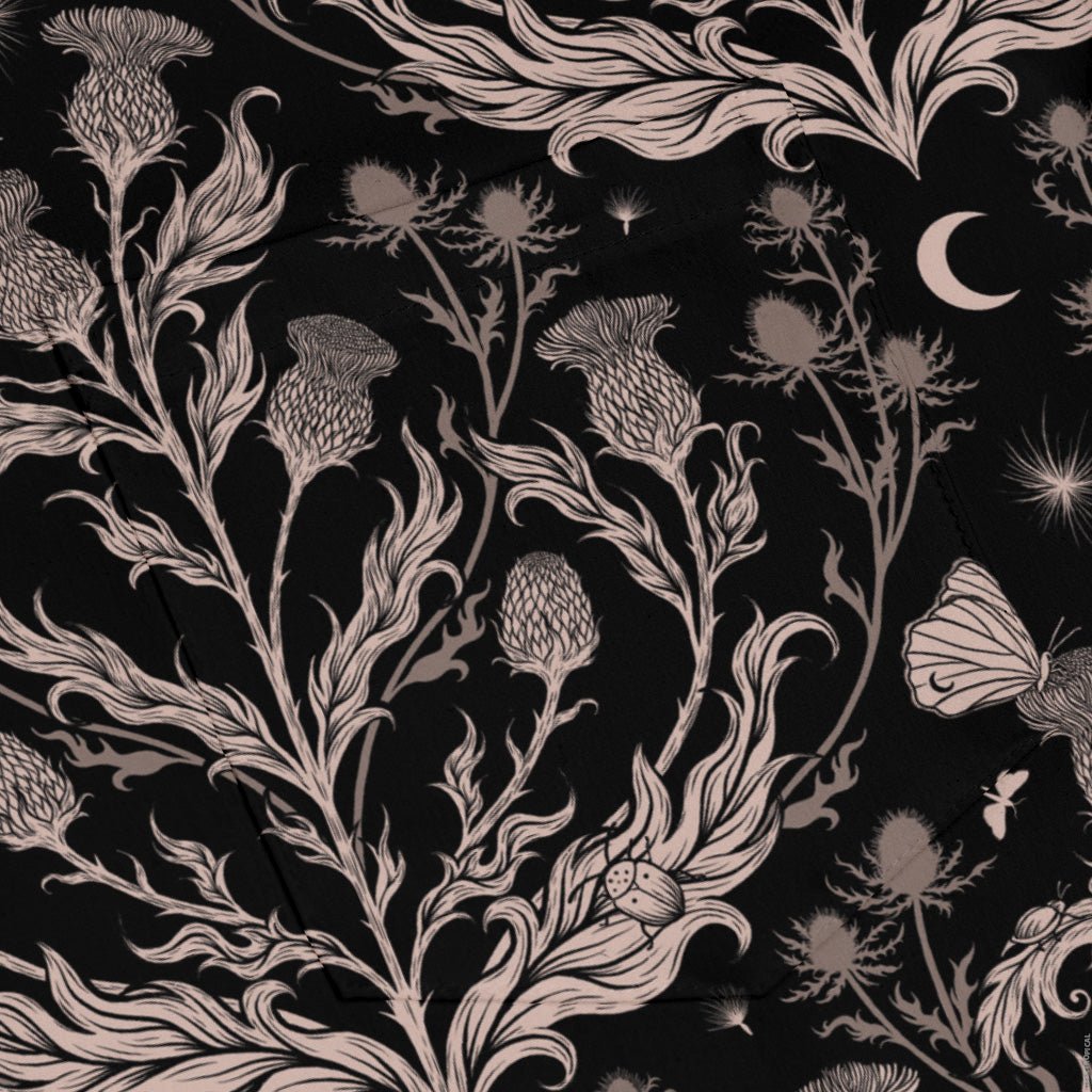 Episodic Thistle Home Black White Long Sleeve Button Up Shirt is a monochrome love letter to botany, designed by Episodic. Fine white linework sketches thistles—spiky blooms, stems, and leaves—across a deep black canvas. The print flows cleanly over the placket and pocket for a seamless look. Soft, easy comfort meets gallery-level detail, printed with eco-minded inks for the geek who prefers their field notes wearable.