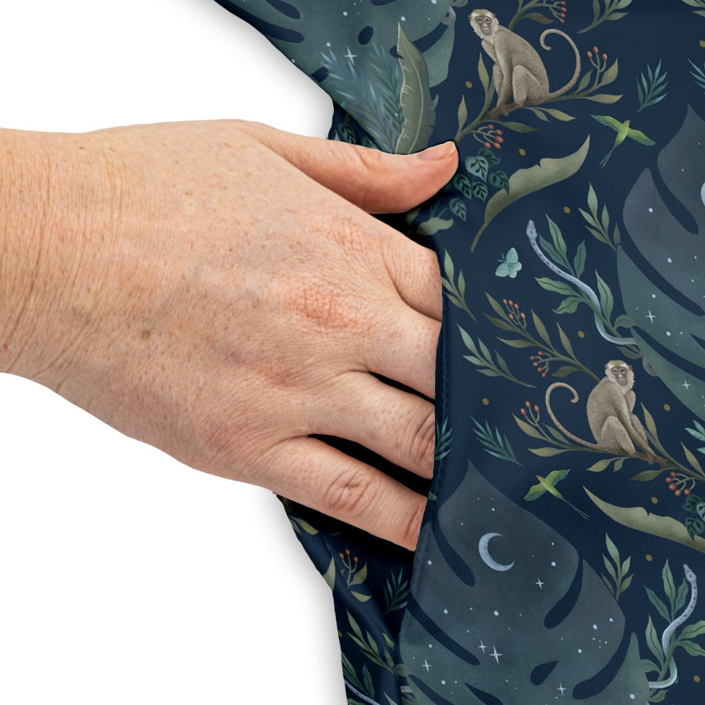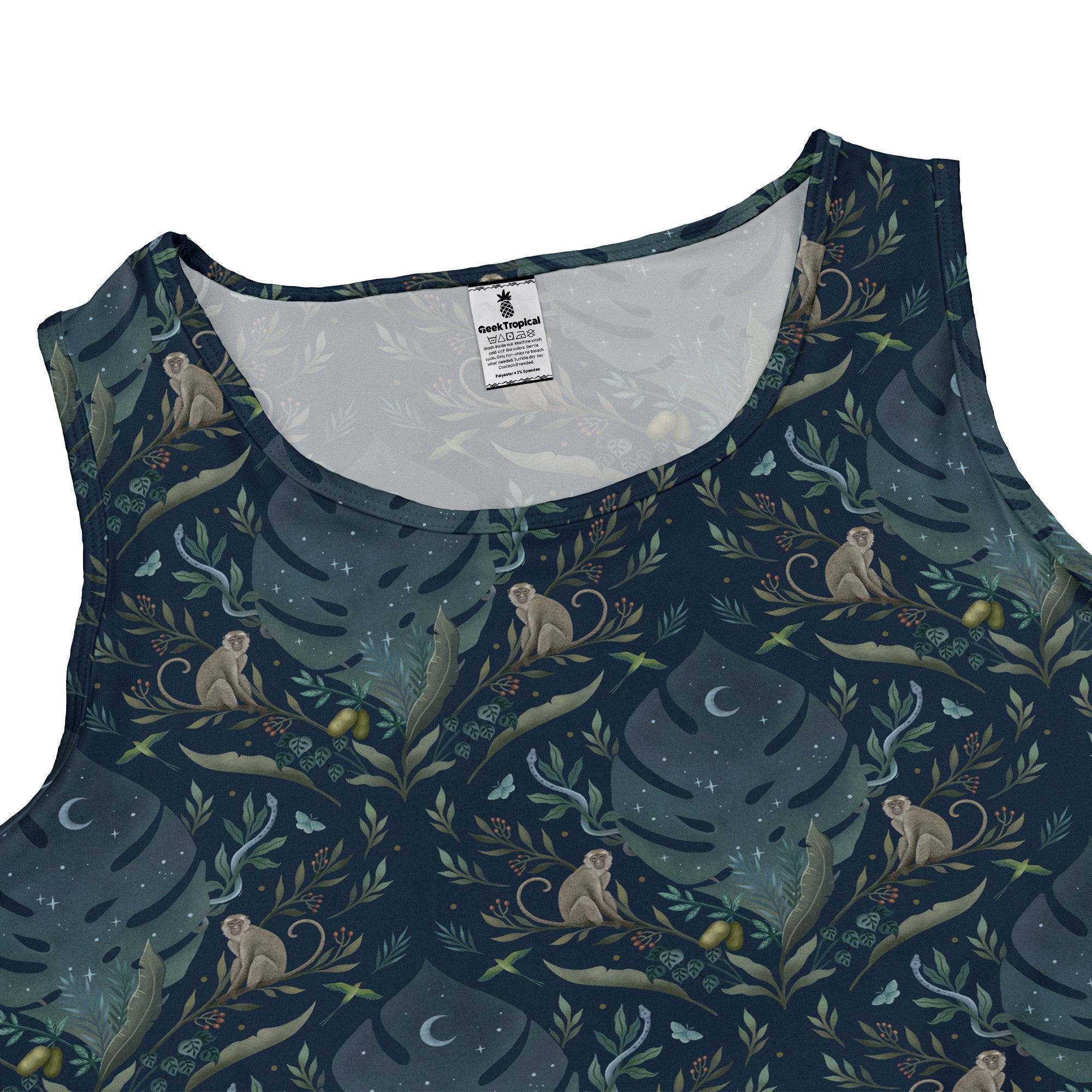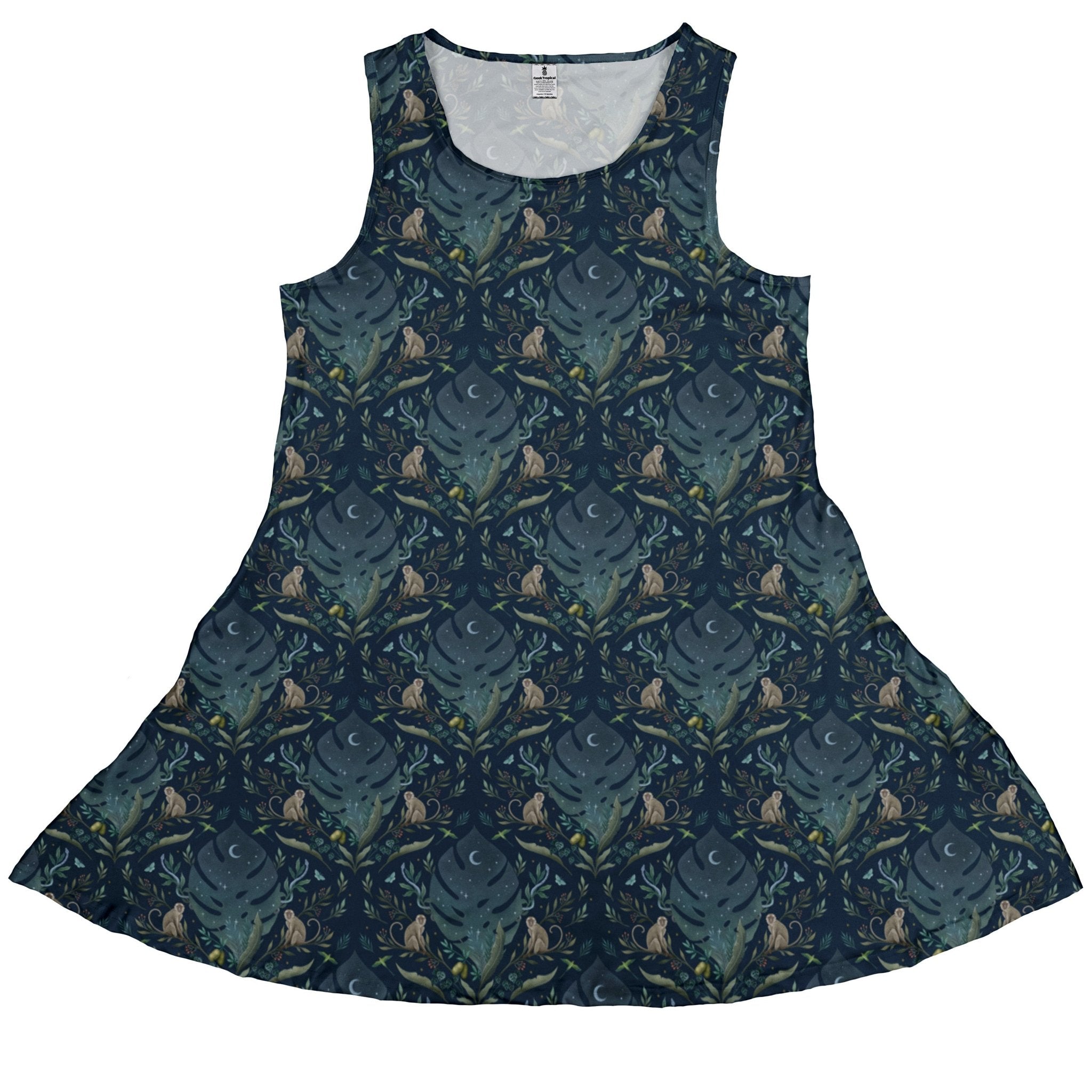Level up your vacation mode with the Episodic Tropical Monkey Dress, a playful jungle scene dreamt up by artist Episodic. Curious monkeys tumble through layered leafy botanicals, their poses weaving a clever, all-over pattern that reads bold from afar and delightfully detailed up close. Soft, move-ready, and game-night presentable, this piece shifts from couch co-op to patio brunch without breaking stride—artist supported and geek approved.