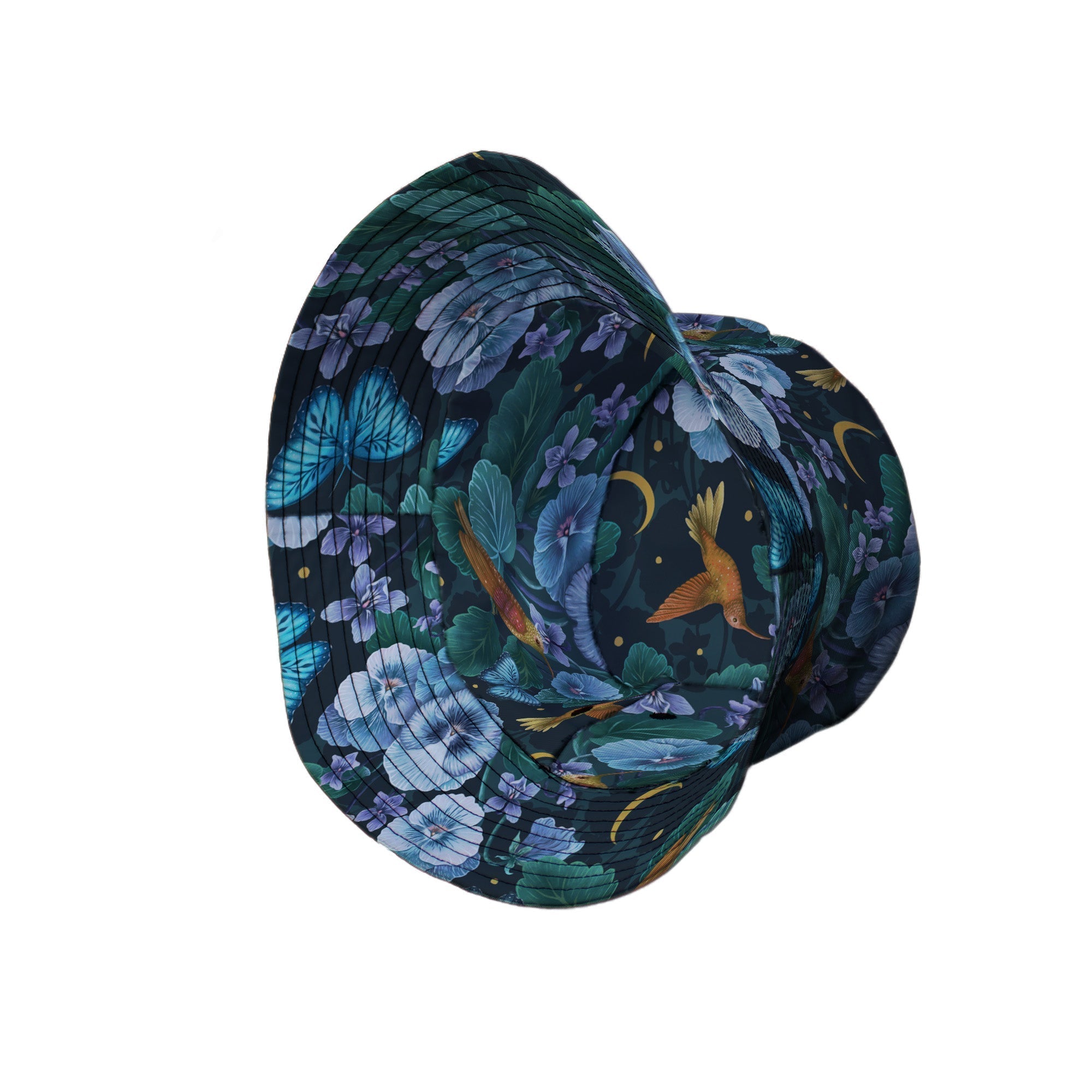 Meet the Episodic Violet Night Bucket Hat—playful streetwear for star-chasing geeks. The print paints a moody violet sky where planets wink over lush botanicals and subtle animal forms, designed by Episodic. Flip it and the cosmos continues inside, keeping the vibe consistent. Soft, packable, and sun-ready, it pairs with tees or button-ups. Grab it for art you can wear, and support a licensed artist with every adventure.