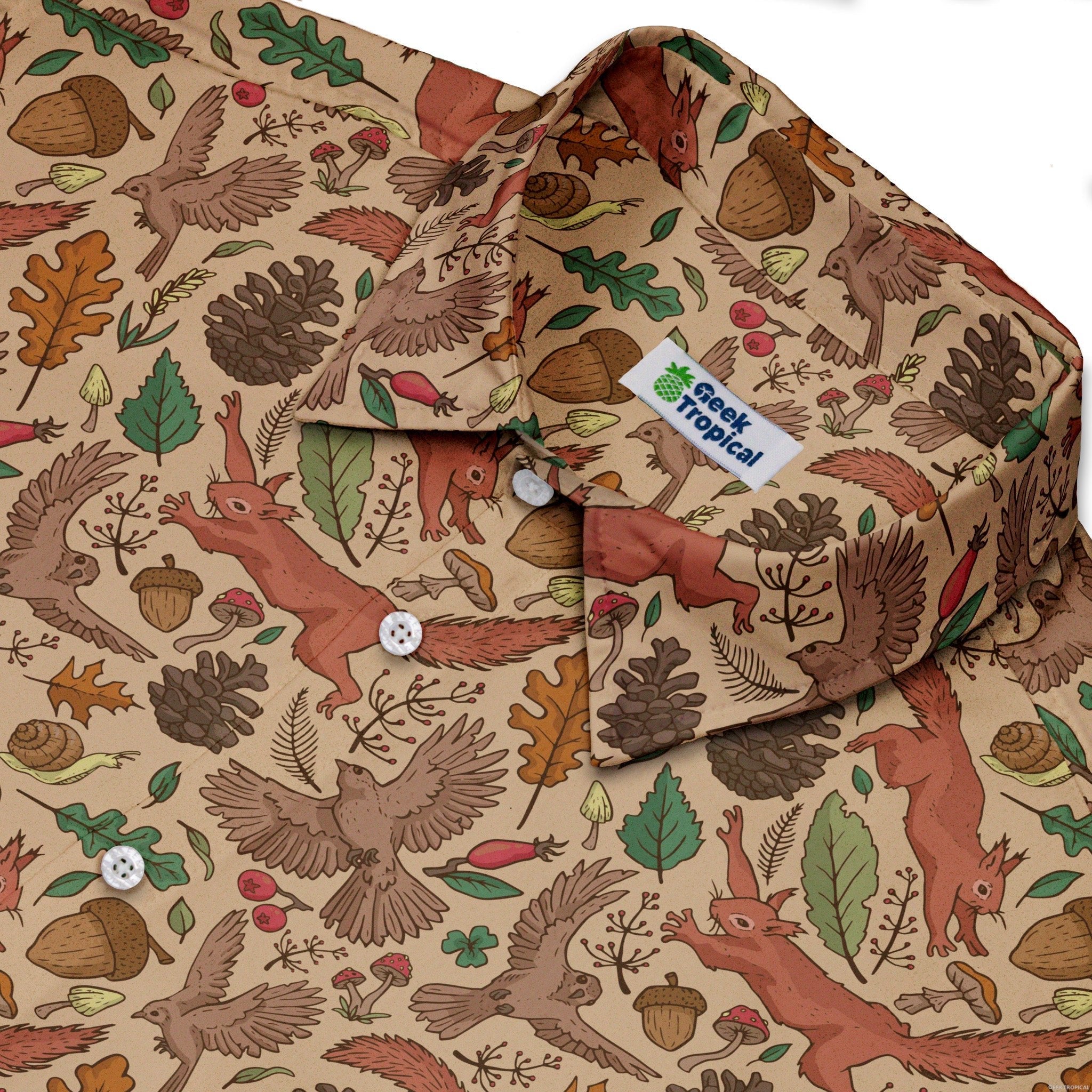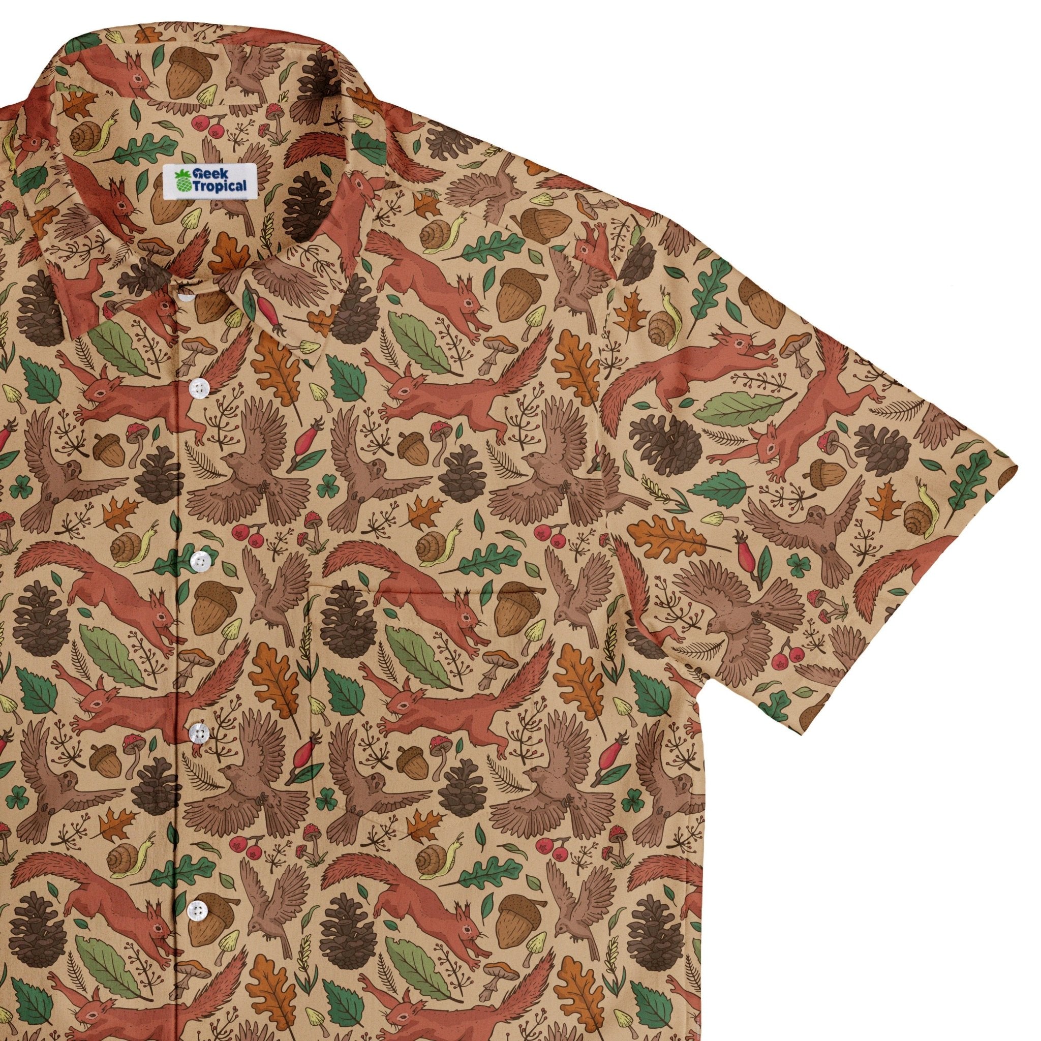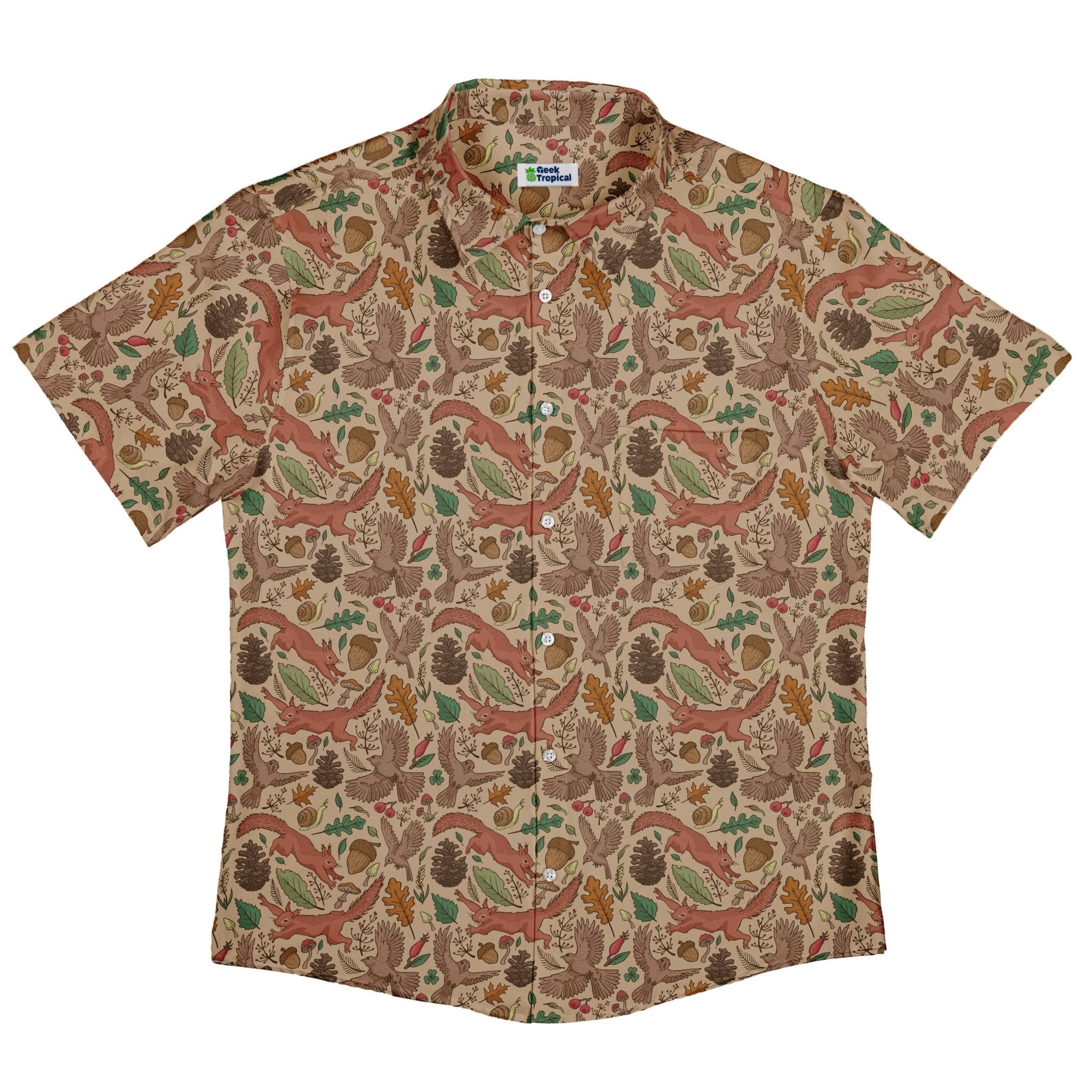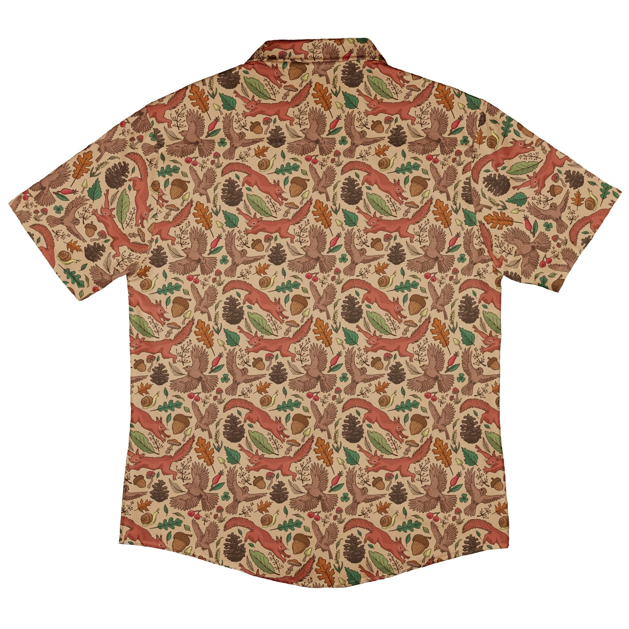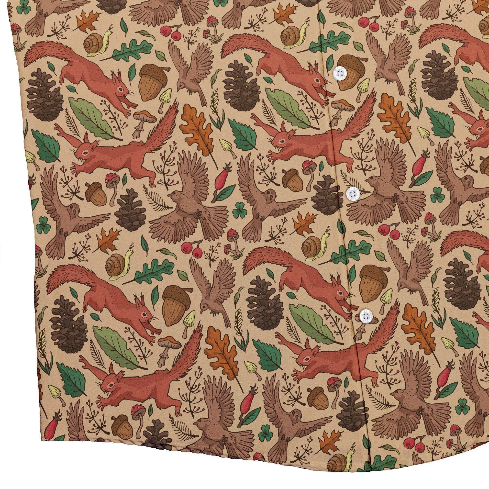 The Fall Squirrel Button Up Shirt celebrates cozy autumn nerdiness with a woodland pattern of curious squirrels, fall botanicals, and foraged treasures. Designed by Julie Kitzes, the art flows cleanly across the front for a satisfyingly tidy look. Warm russet and golden tones set a harvest vibe—subtle enough for the office, playful enough for cider runs and board-game night. Artist-backed, seasonal, and seriously wearable.