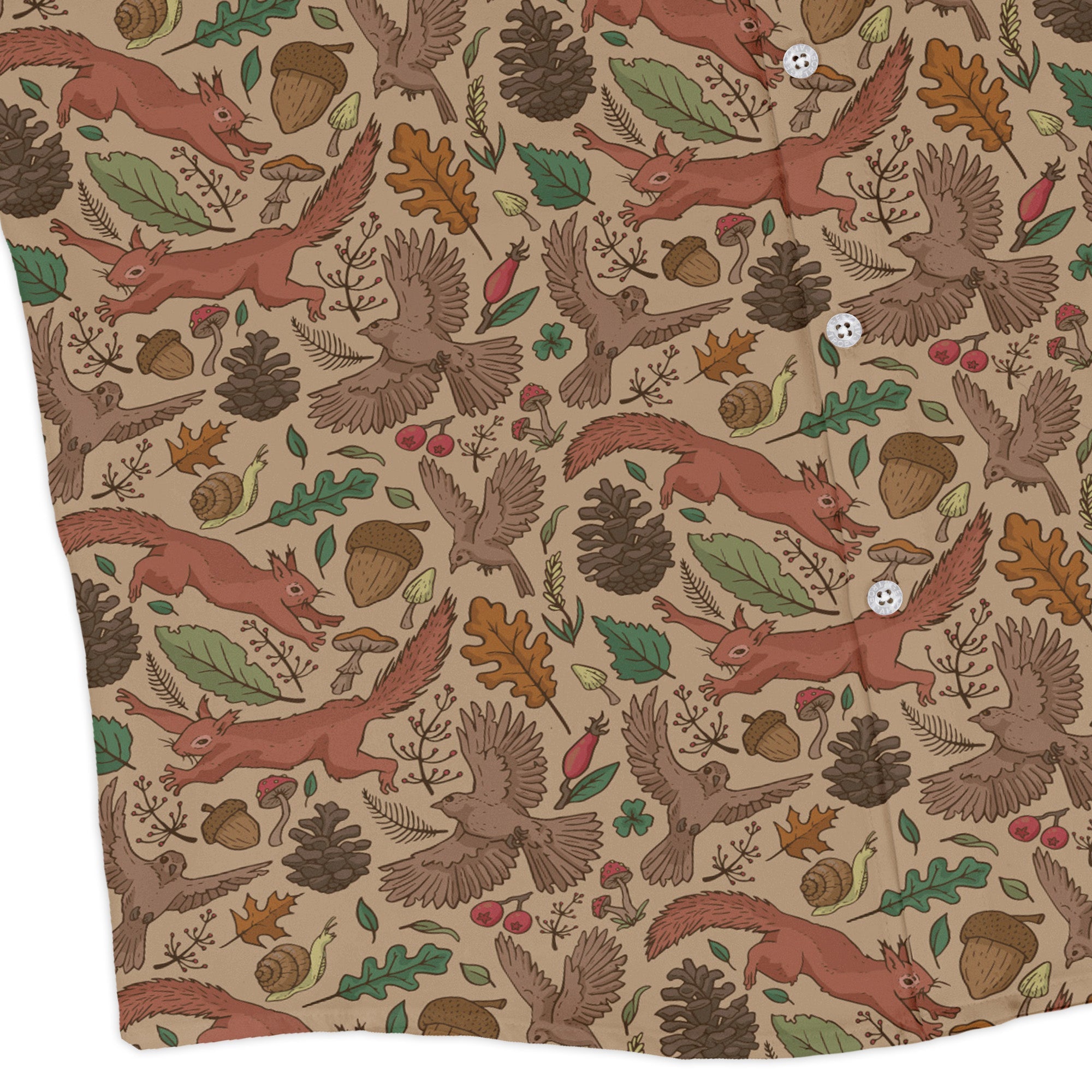 The Fall Squirrel Long Sleeve Button Up Shirt celebrates cozy-season mischief. Lively squirrels scamper through autumn botanicals in a richly detailed all-over print, designed by Julie Kitzes. Soft, breathable, and ready for long days, it drapes with ease. The artwork lines neatly across the placket and pocket for that nerdy-perfectionist flex, and it’s printed with eco-conscious inks. Dress it up or let the squirrels do the talking.